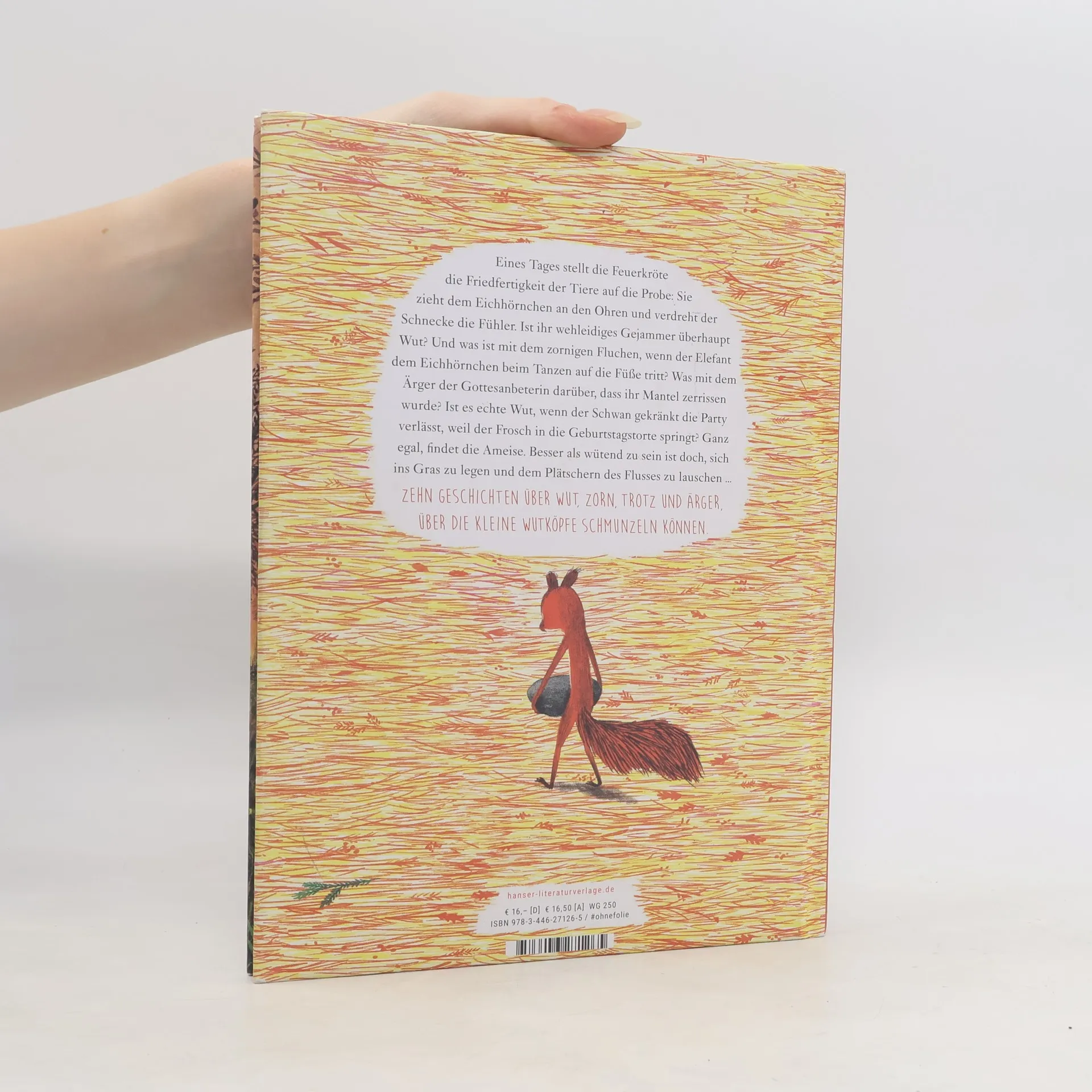 Neue Tiergeschichten von Toon Tellegen, dem Autor des Bestsellers "Man wird doch wohl mal wütend werden dürfen" – für kleine Trotz- und Wutköpfe Zehn neue Geschichten über Wut, Zorn, Trotz und Ärger, über die kleine Wutköpfe schmunzeln können. Eines Tages stellt die Feuerkröte die Friedfertigkeit der Tiere auf die Probe: Sie zieht das Eichhörnchen an den Ohren und verdreht der Schnecke die Fühler. Ist ihr wehleidiges Gejammer überhaupt Wut? Und was ist mit dem zornigen Fluchen, wenn der Elefant dem Eichhörnchen beim Tanzen auf die Füße tritt? Was mit dem Ärger der Gottesanbeterin darüber, dass ihr Mantel zerrissen wurde? Ist es echte Wut, wenn der Schwan gekränkt die Party verlässt, weil der Frosch in die Geburtstagstorte springt? Ganz egal, findet die Ameise. Besser, als wütend zu sein, ist es doch, sich ins Gras zu legen und dem Plätschern des Flusses zu lauschen …