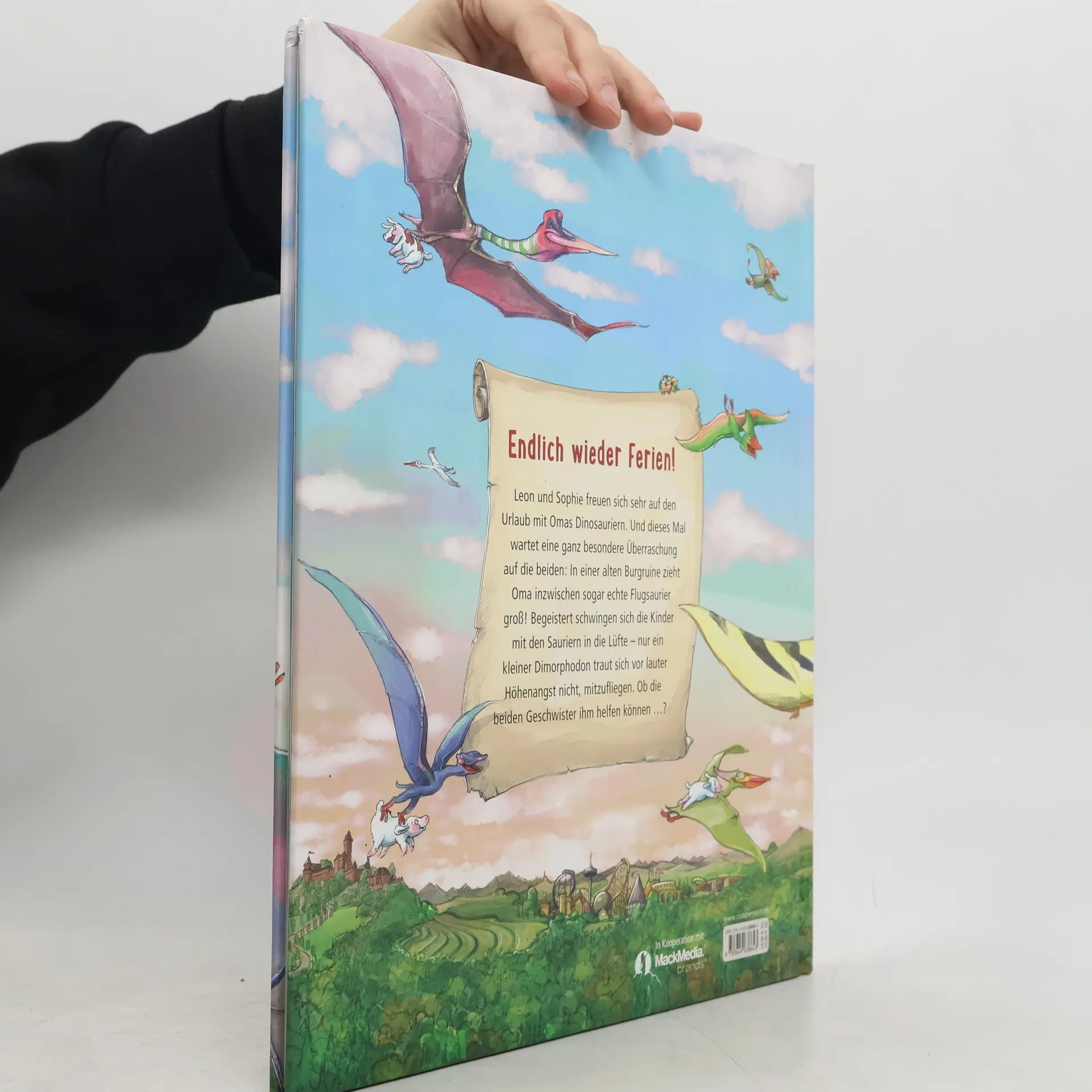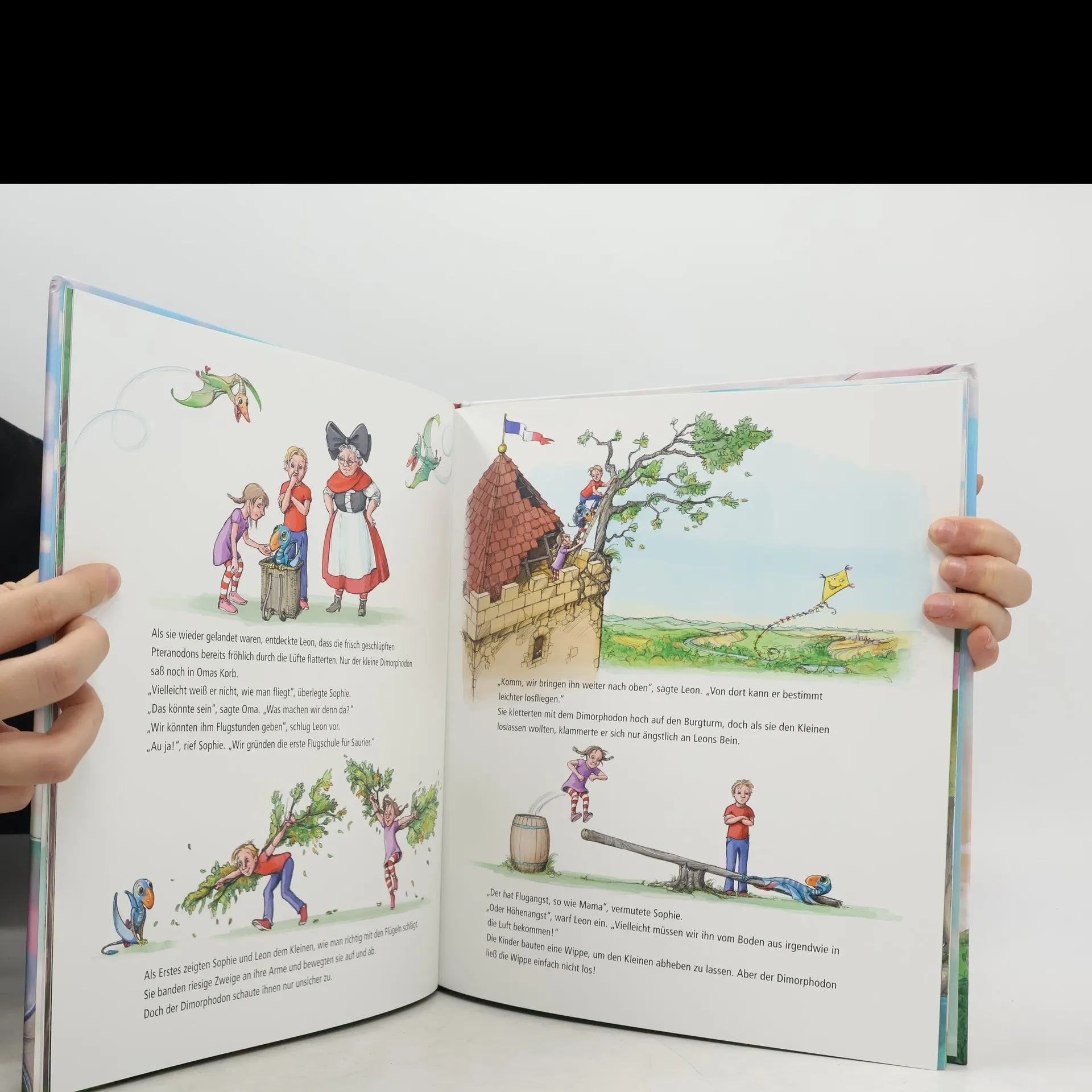 Endlich wieder Ferien! Leon und Sophie freuen sich sehr auf den Urlaub mit Omas Dinosauriern. Und dieses Mal wartet eine ganz besondere Überraschung auf die beiden: In einer alten Burgruine zieht Oma inzwischen sogar echte Flugsaurier groß! Begeistert schwingen sich die Kinder mit den Sauriern in die Lüfte - nur ein kleiner Dimorphodon traut sich vor lauter Höhenangst nicht mitzufliegen. Ob die beiden Geschwister ihm helfen können …?