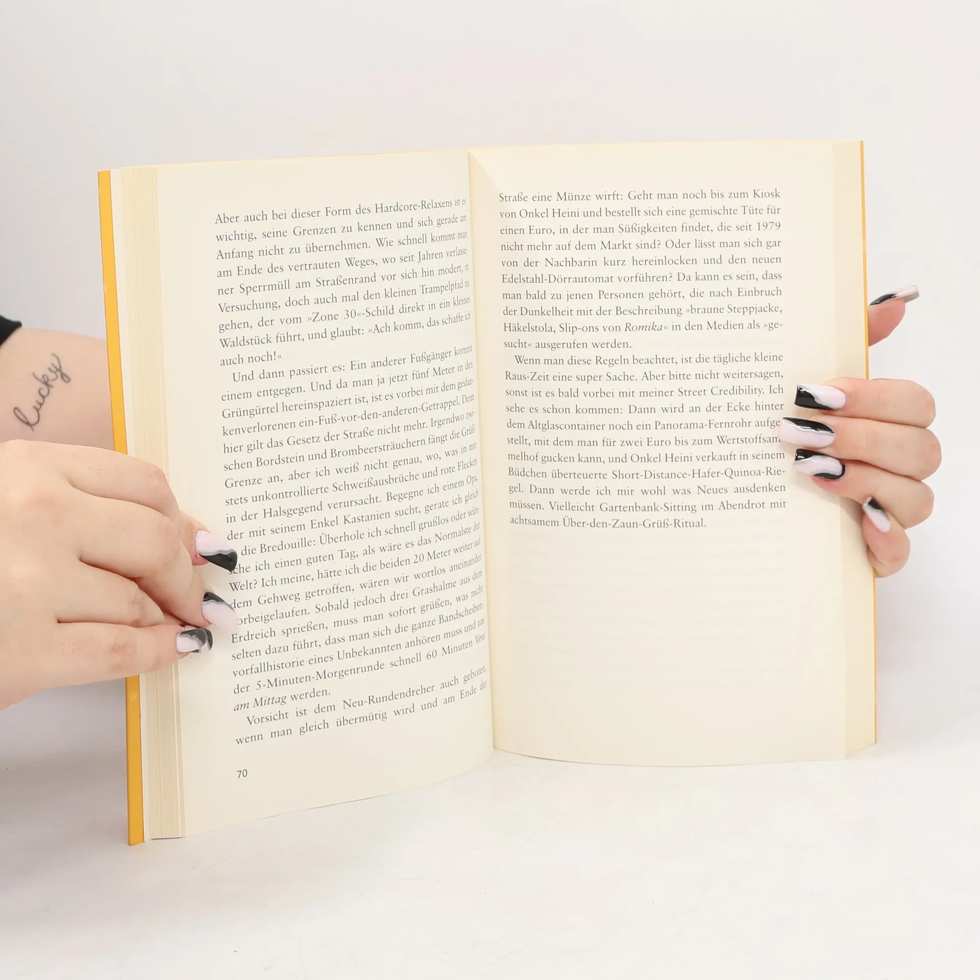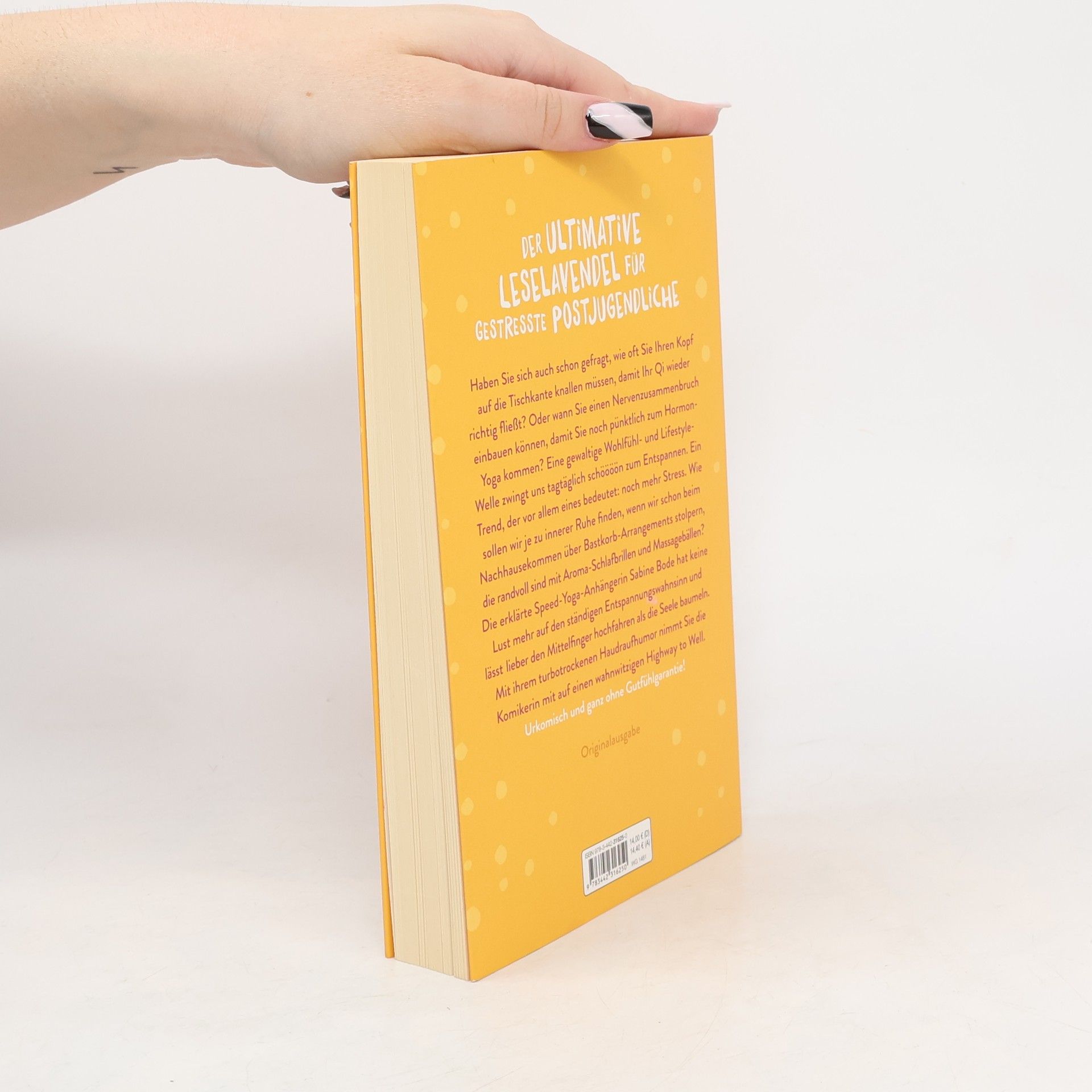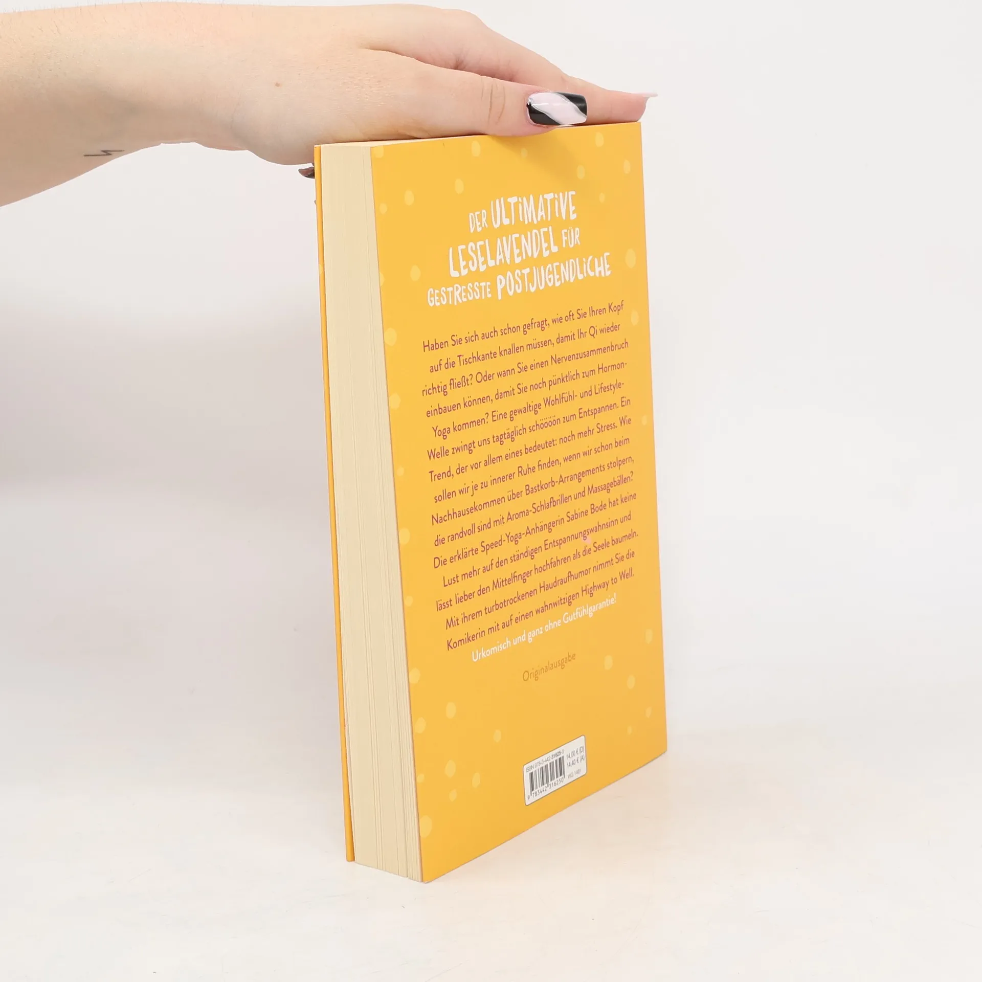 Wie oft muss man den Kopf auf die Tischkante knallen, damit das Qi wieder richtig fließt? In welchem Zeitfenster kann man einen Nervenzusammenbruch einbauen, damit man noch rechtzeitig zum Hormonyoga kommt? Und wer holt einen aus der Klinik raus, nachdem man mit der Urschrei-App nackt und wild auf die Brust trommelnd durch die Gärten der Nachbarn gerannt ist? Unser Leben könnte so schön sein, wenn man nicht an jeder Ecke Entschleunigung, Entspannung und Achtsamkeit verordnet bekommen würde. Wie sollen gestresste Großstädter denn jemals zu innerer Ruhe finden, wenn sie schon beim Nachhausekommen über Bastkorb-Arrangements stolpern, die randvoll sind mit Aroma-Schlafbrillen und Yogamatten? Eine immer gewaltigere Wohlfühl- und Lifestyle-Welle zwingt die Middle-Ager schöööön zum Entspannen. Ein Trend, der vor allem eins bedeutet: Noch mehr Stress. Das muss aber nicht so sein. Die erklärte Speed-Yoga-Anhängerin und Bestsellerautorin Sabine Bode hat keine Lust auf ständigen Entstressungs-Struggle und lässt lieber den Mittelfinger hochfahren als die Seele baumeln. Turbotrockener Haudraufhumor ganz ohne Gutfühlgarantie!