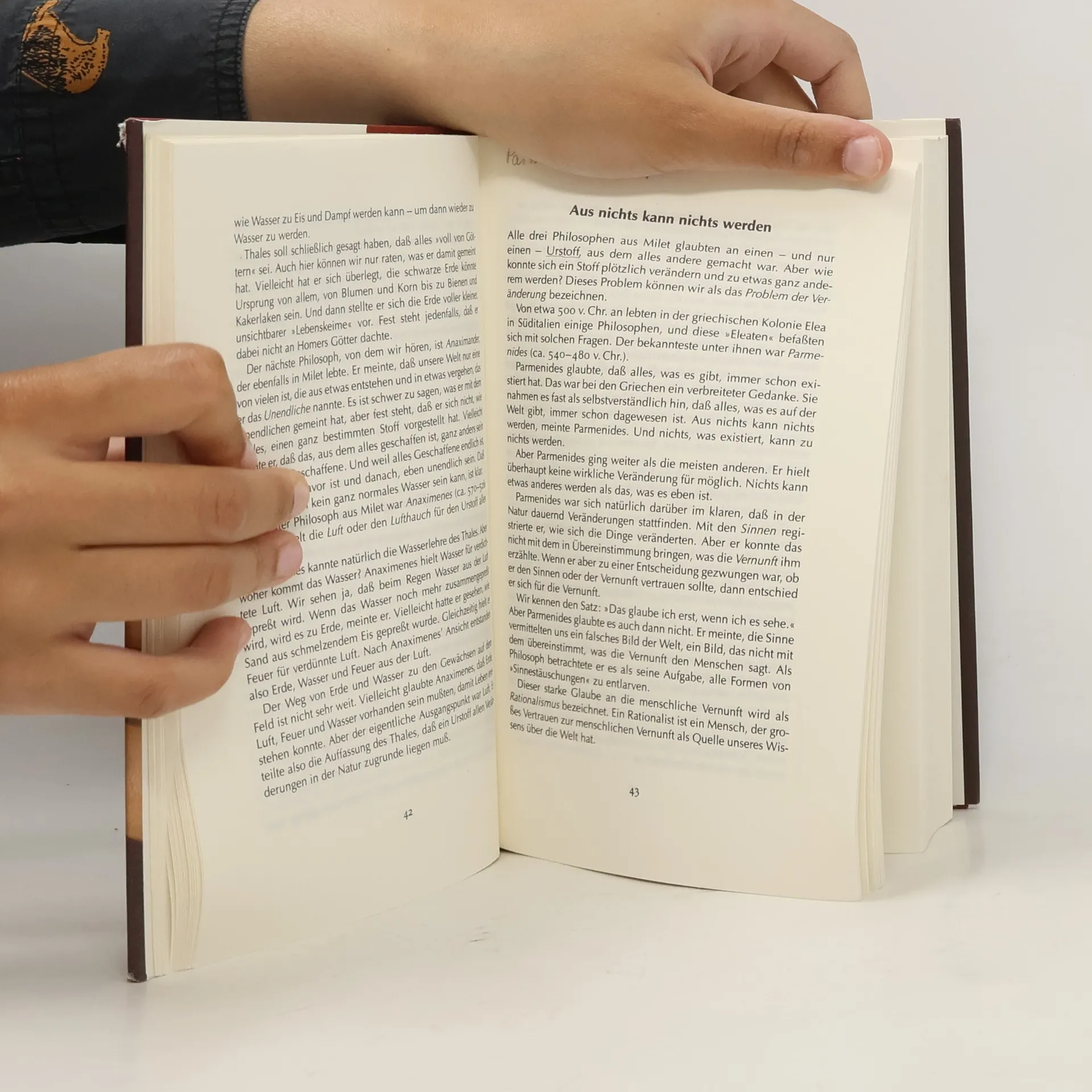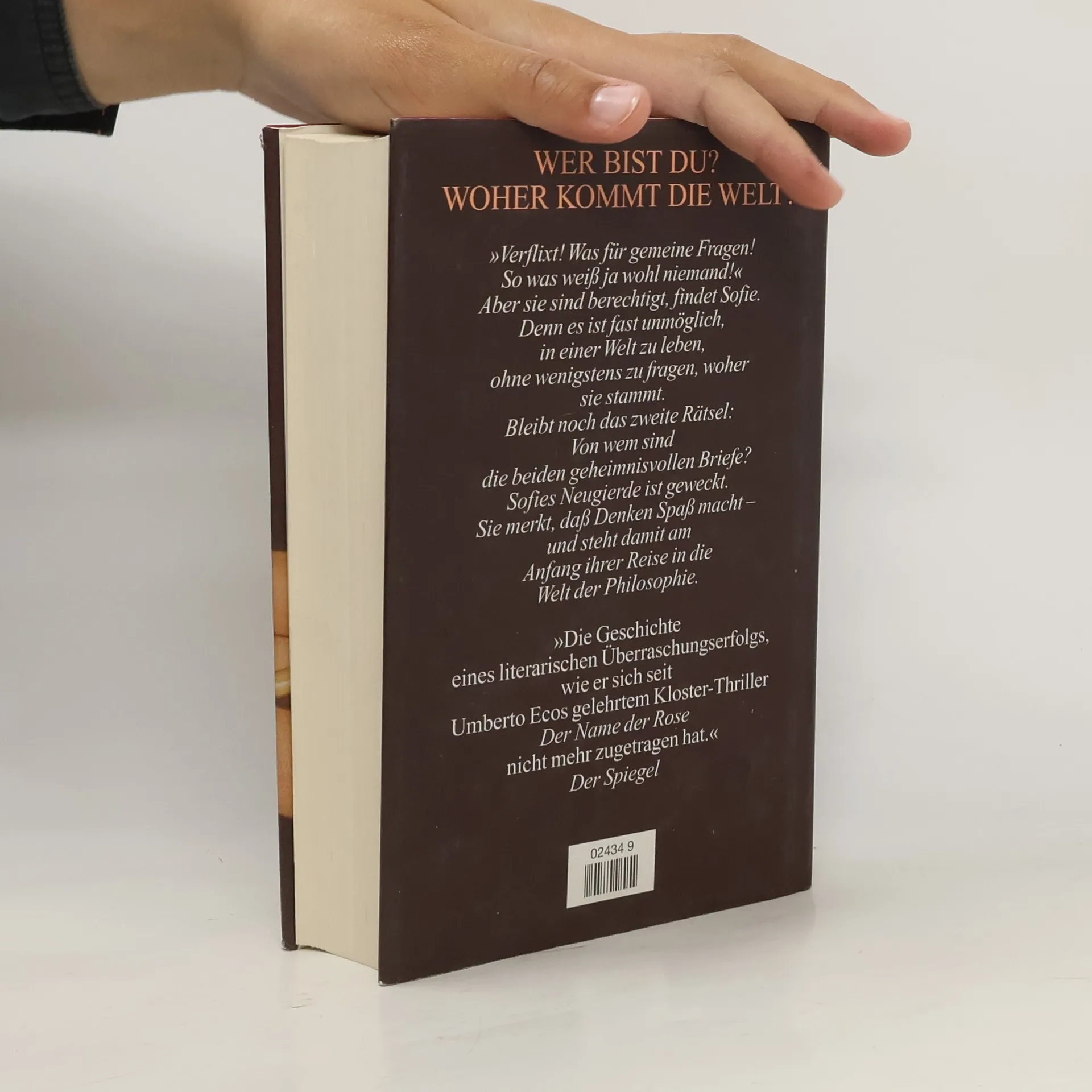»Ein dickes Buch, mit spitzen Fingern angefaßt und mit Begeisterung zugeklappt: ein großer Wurf im wörtlichen wie übertragenen Sinn.« Die Zeit Mysteriöse Briefe landen im Briefkasten der 15jährigen Sofie Amundsen in Oslo. Was sollen diese Fragen: »Wer bist du?«, »Was ist ein Mensch?« und »Woher kommt die Welt?«. Sofie ist irritiert. Die Briefe werden ausführlicher und entführen sie in die abenteuerliche und geheimnisvolle Gedankenwelt der großen Philosophen. Ihr unbekannter Briefeschreiber erzählt Sofie die Geschichte Europas, der Antike, des Mittelalters und der Renaissance und dann nimmt die Geschichte eine unglaubliche Wendung.