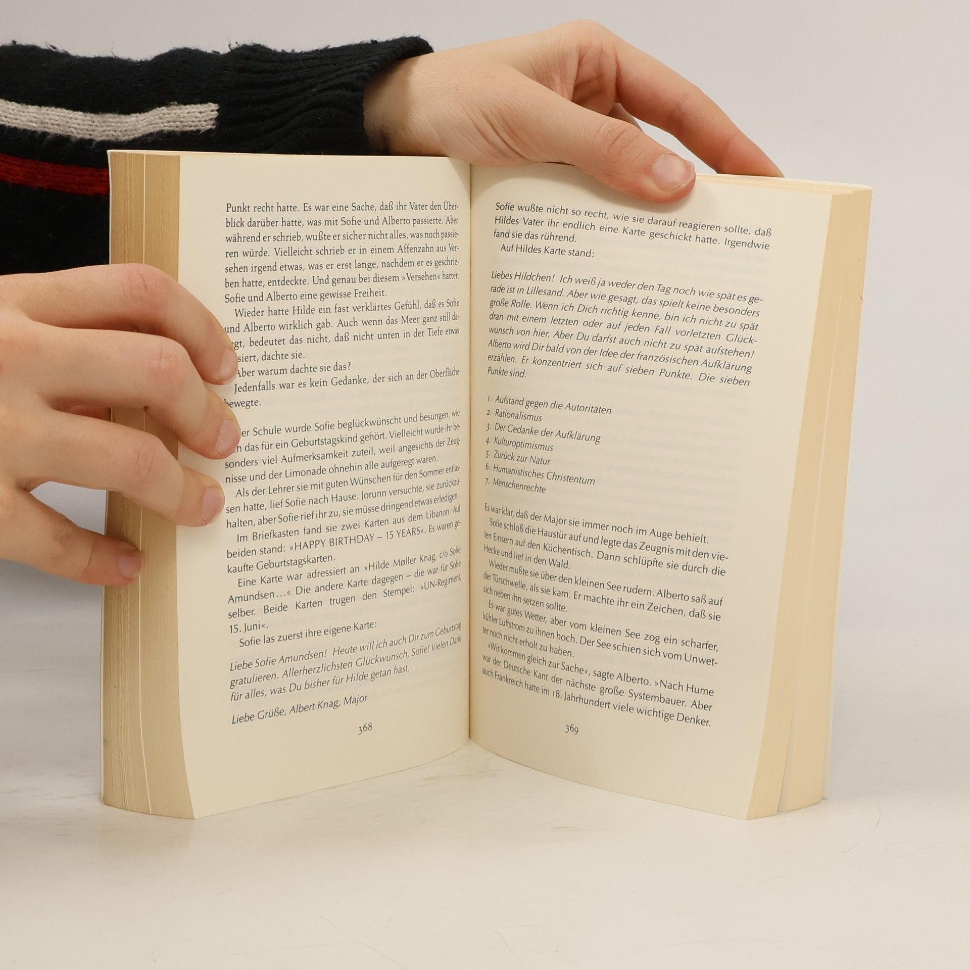 Weg in die geheimnisvolle Gedankenwelt »Ein dickes Buch, mit spitzen Fingern angefaßt und mit Begeisterung zugeklappt: ein großer Wurf im wört-lichen wie übertragenen Sinn.« Die Zeit Mysteriöse Briefe landen im Briefkasten der 15jährigen Sofie Amundsen in Oslo. Was sollen diese Fragen: »Wer bist du?«, »Was ist ein Mensch?« und »Woher kommt die Welt?«. Sofie ist irritiert. Die Briefe werden ausführlicher und entführen sie in die abenteuerliche und geheimnisvolle Gedankenwelt der großen Philosophen. Ihr unbekannter Briefeschreiber erzählt Sofie die Geschichte Europas, der Antike, des Mittelalters und der Renaissance und dann nimmt die Geschichte eine unglaubliche Wendung.