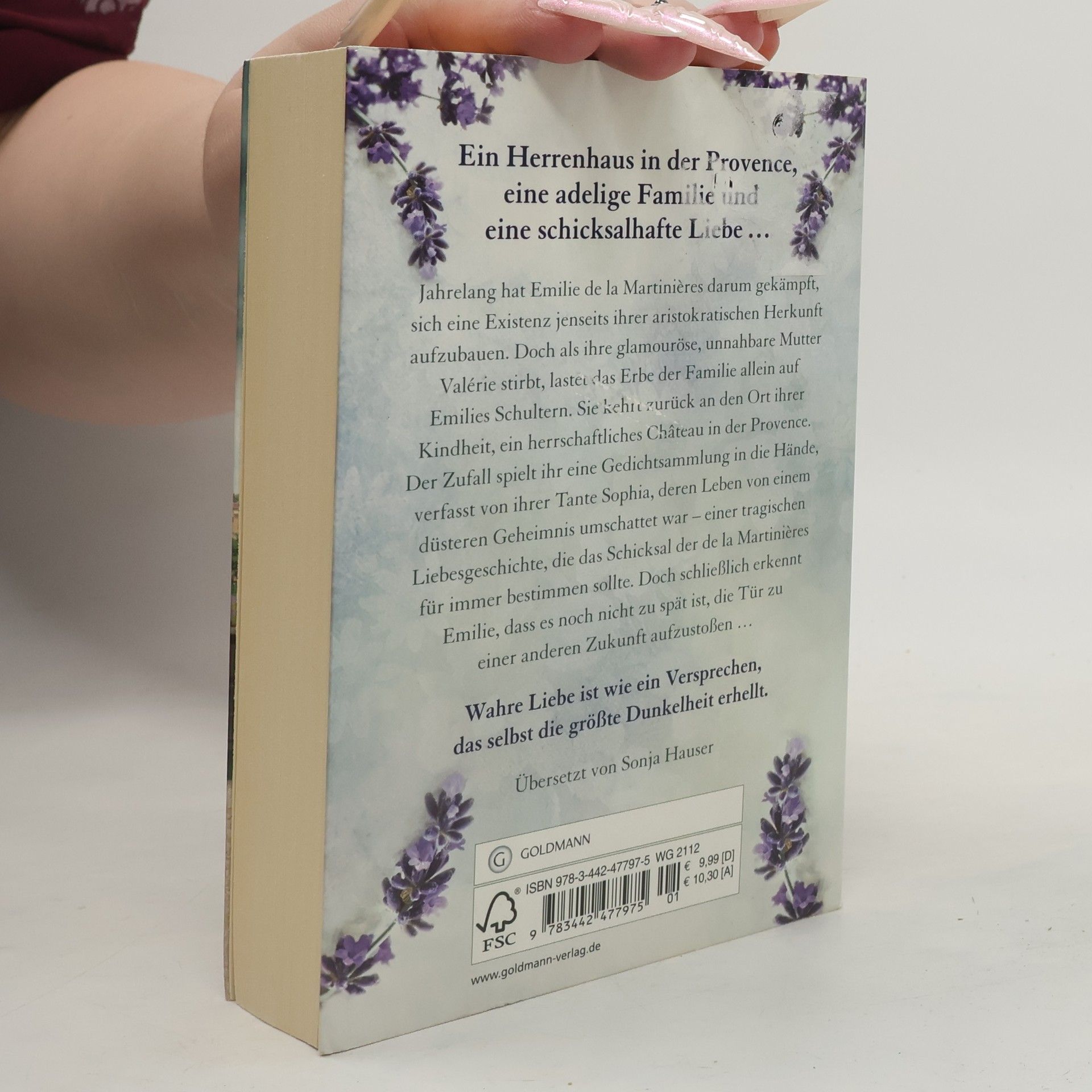 Ein Herrenhaus in der Provence, eine adelige Familie und eine schicksalhafte Liebe in dunklen Zeiten. Jahrelang hat Emilie de la Martinières darum gekämpft, sich eine Existenz jenseits ihrer aristokratischen Herkunft aufzubauen. Doch als ihre glamouröse, unnahbare Mutter Valérie stirbt, lastet das Erbe der Familie allein auf Emilies Schultern. Sie kehrt zurück an den Ort ihrer Kindheit, ein herrschaftliches Château in der Provence. Der Zufall spielt ihr eine Gedichtsammlung in die Hände, verfasst von ihrer Tante Sophia, deren Leben von einem düsteren Geheimnis umschattet war – einer tragischen Liebesgeschichte, die das Schicksal der de la Martinières für immer bestimmen sollte. Doch schließlich erkennt Emilie, dass es noch nicht zu spät ist, die Tür zu einer anderen Zukunft aufzustoßen …