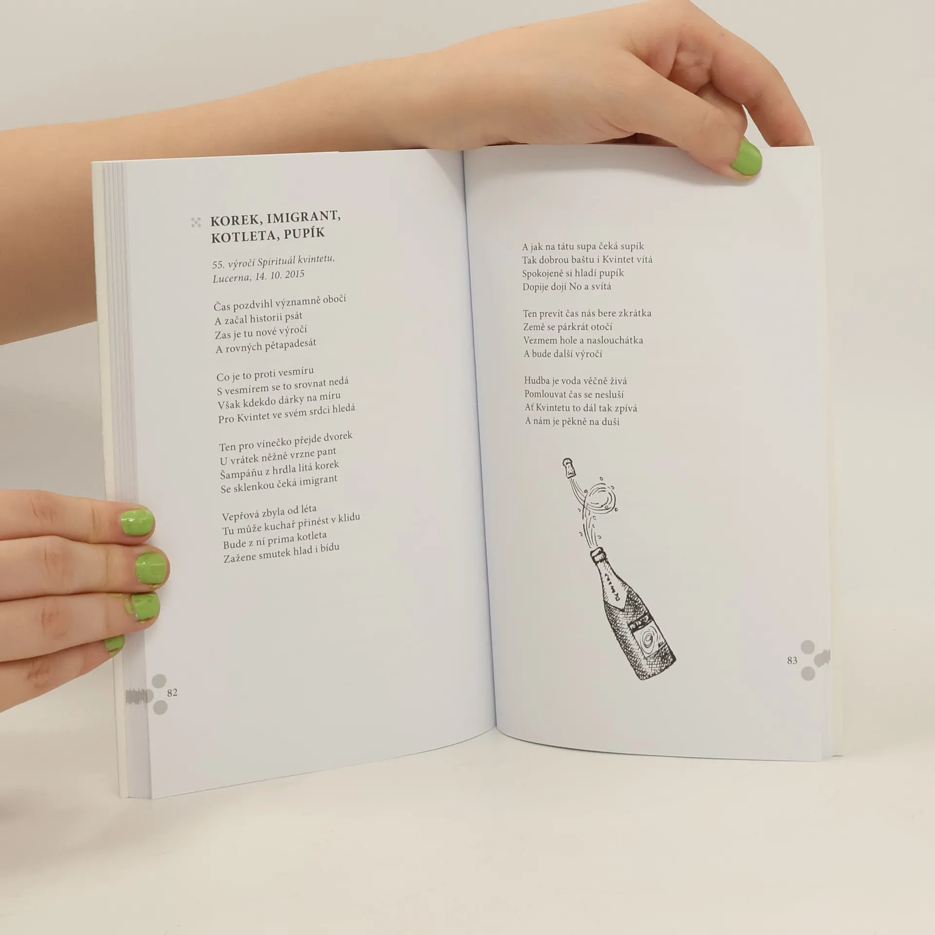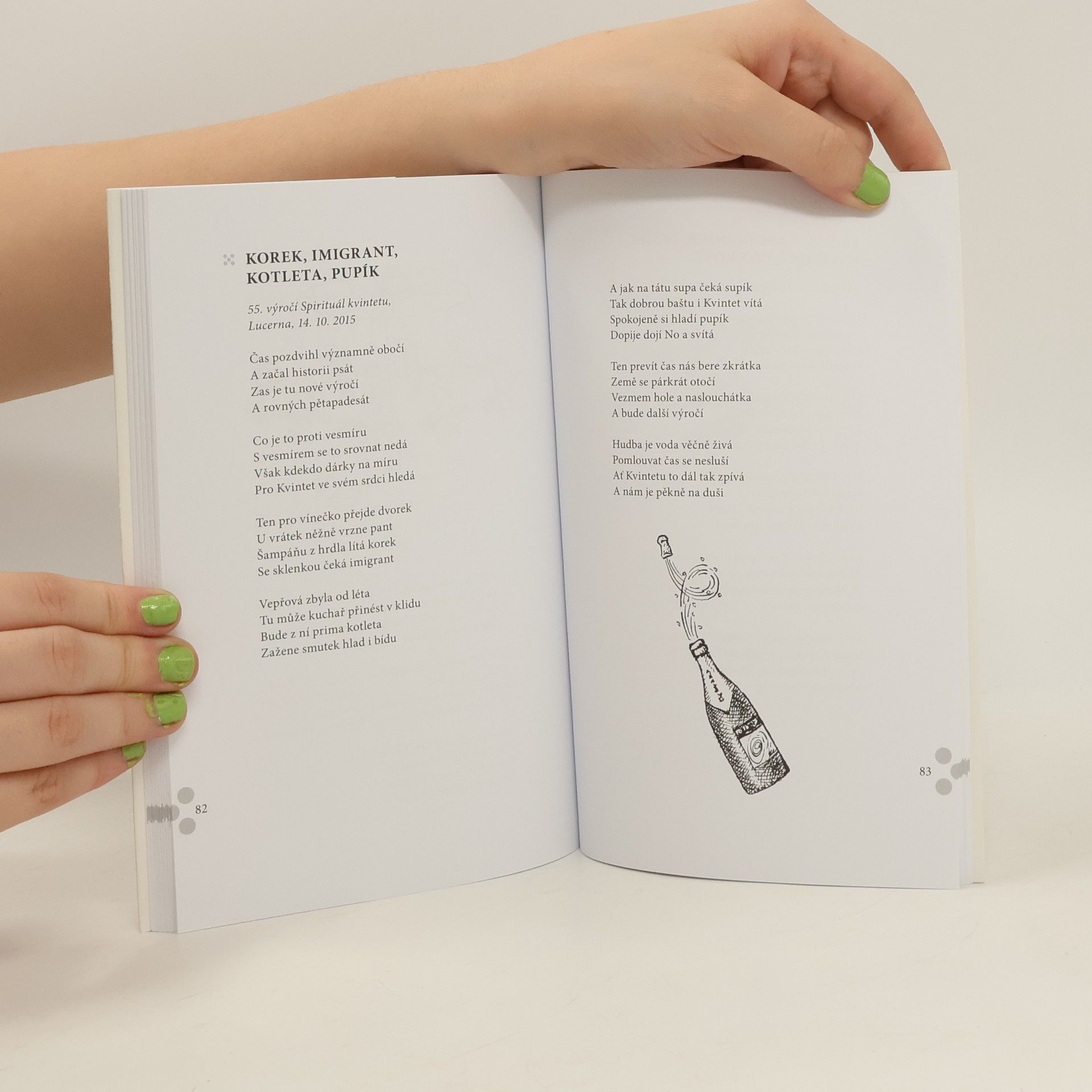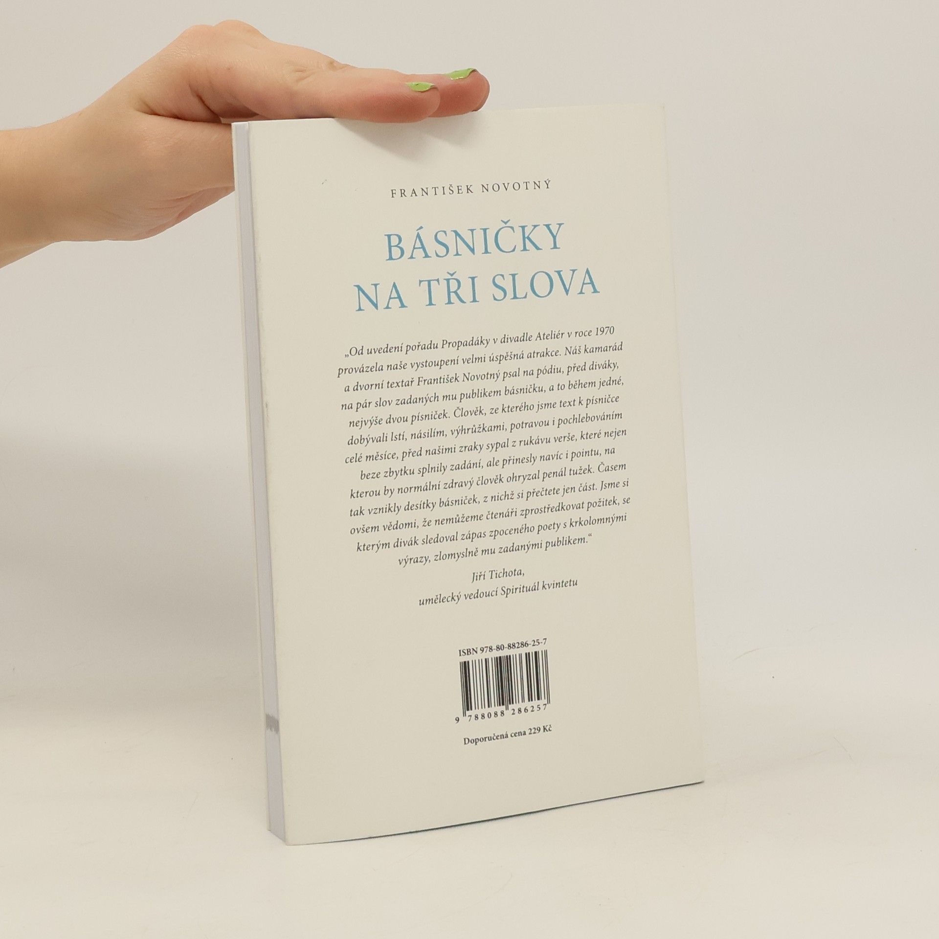 Knížka Františka Novotného obsahuje unikátní soubor básní, které vznikaly jako improvizace na slova zadaná z hlediště při koncertech Spirituál kvintetu. Improvizace je svébytná umělecká disciplína, do které v jisté míře vstupuje náhoda. Důležitá je zkušenost, obraznost, a hlavně ochota hrát si – se slovy, s rytmem, s významy, s očekáváním publika, s časem, který se měří na takty jedné nebo dvou písniček. Básně v této knize jsou záznamem momentální nálady, situace, ale zároveň uchovávají to, co Františku Novotnému zajišťuje nebývale početný okruh čtenářů: čistotu básnické řeči i pohledu na svět, srozumitelnost, přístupnost – a humor. Knihu kongeniálně dotvářejí ilustrace Jiřího Slívy.