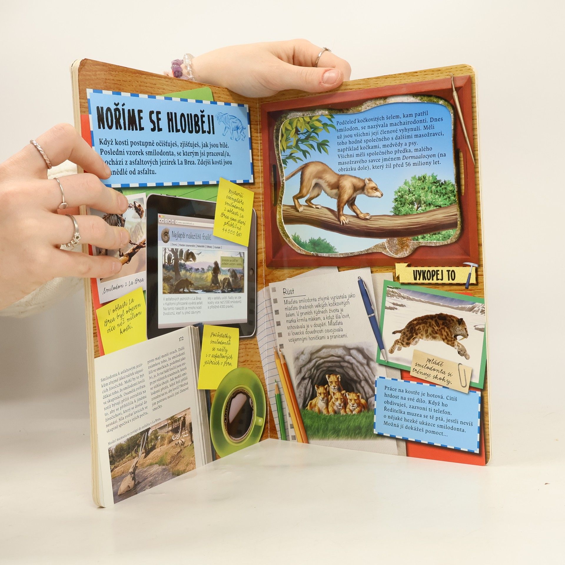 V této výjimečné knize poznáte, jak vypadá práce paleontologa v terénu i v laboratoři, projdete s ním celé dobrodružství od objevení prvních fosilních nálezů až po vystavení exponátů v muzeu. Ale čeká vás ještě mnohem víc. Vlastními silami si sestavíte kostru smilodonta neboli šavlozubého tygra. Nikdy to nebylo jednodušší! Jednotlivé dílky lze vytlačit z podložky a lehce zasunout do sebe – vznikne model kostry delší než 25 cm. A pod ním se skrývá ještě spousta dalších informací…