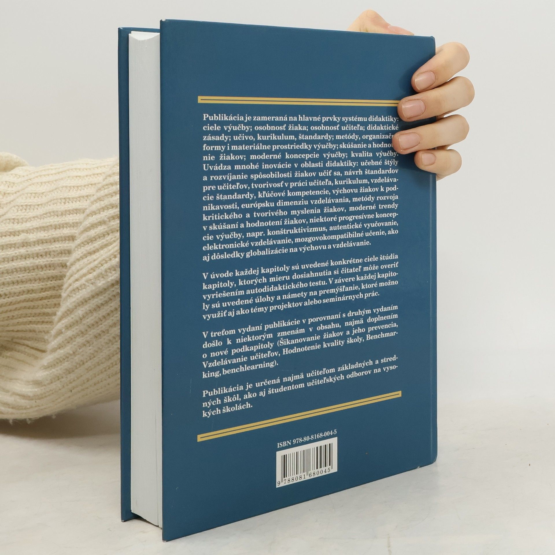 Publikácia je zameraná na hlavné prvky systému didaktiky: ciele výučby; osobnosť žiaka; osobnosť učiteľa; didaktické zásady; učivo, kurikulum, štandardy; metódy, organizačné formy i materiálne prostriedky výučby; skúšanie a hodnotenie žiakov; moderné koncepcie výučby; kvalita výučby. V publikácii sa uvádzajú mnohé inovácie v oblasti didaktiky, napr. dôsledky globalizácie na výchovu a vzdelávanie, učebné štýly a rozvíjanie spôsobilosti žiakov učiť sa, návrh štandardov pre učiteľov, tvorivosť v práci učiteľa, kurikulum, štandardy, kľúčové kompetencie, výchova žiakov k podnikavosti, európska dimenzia vzdelávania, metódy rozvoja kritického a tvorivého myslenia žiakov, moderné trendy v skúšaní a hodnotení žiakov, niektoré progresívne koncepcie výučby, napr. konštruktivizmus, autentické vyučovanie, elektronické vzdelávanie, mozgovokompatibilné učenie. V úvode každej kapitoly sú uvedené konkrétne ciele štúdia kapitoly, ktorých mieru dosiahnutia si čitateľ môže overiť vyriešením autodidaktického testu. V závere každej kapitoly sú uvedené úlohy a námety na premýšľanie, ktoré možno využiť aj ako témy projektov alebo seminárnych prác. Publikácia je určená najmä učiteľom základných a stredných škôl, ako aj študentom učiteľských odborov na vysokých školách.