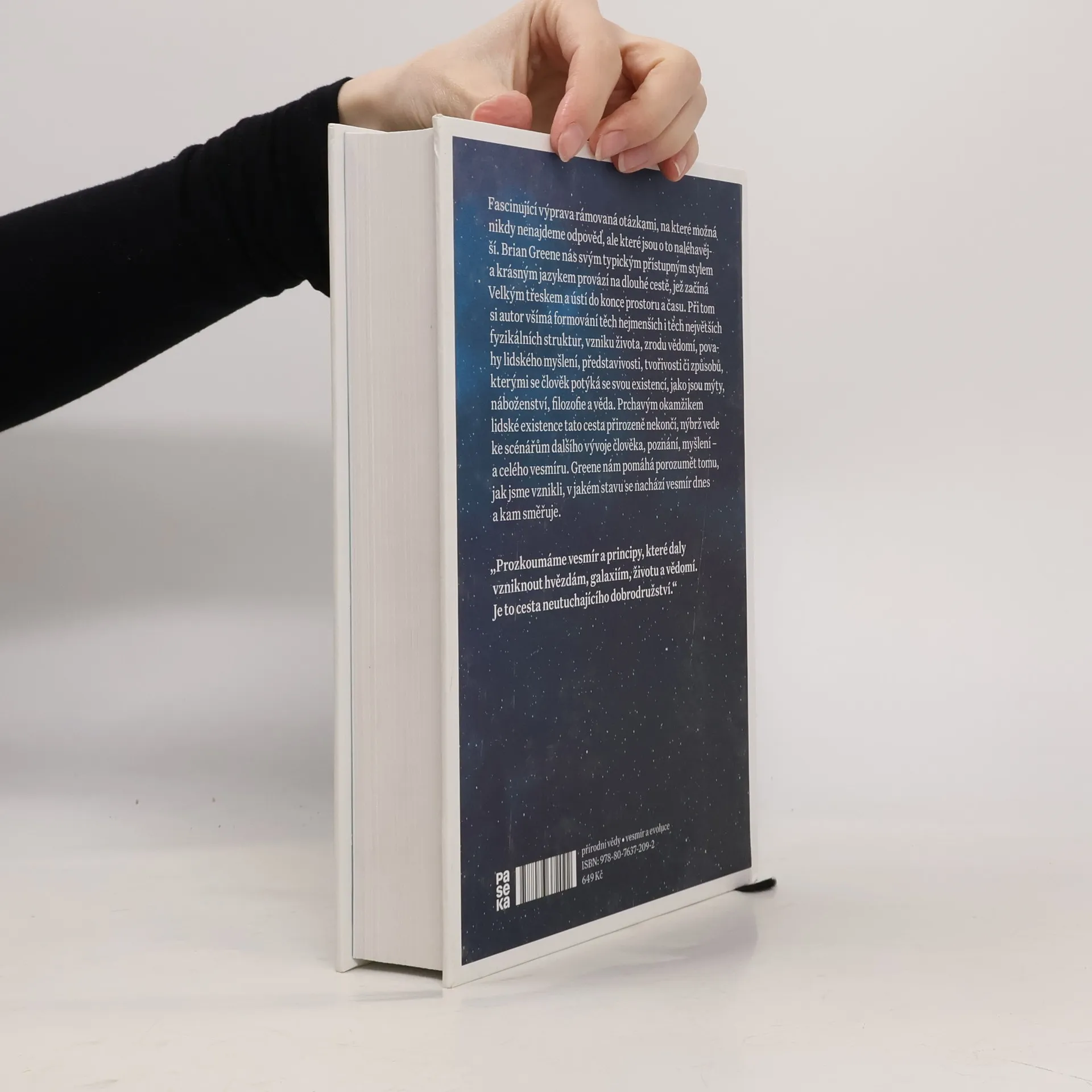 Fascinující výprava rámovaná otázkami, na které možná nikdy nenajdeme odpověď, ale které jsou o to naléhavější. Brian Greene nás svým typickým přístupným stylem a krásným jazykem provází na dlouhé cestě, jež začíná Velkým třeskem a ústí do konce prostoru a času. Při tom si autor všímá formování těch nejmenších i těch největších fyzikálních struktur, vzniku života, zrodu vědomí, povahy lidského myšlení, představivosti, tvořivosti či způsobů, kterými se člověk potýká se svou existencí, jako jsou mýty, náboženství, filozofie a věda. Prchavým okamžikem lidské existence tato cesta přirozeně nekončí, nýbrž vede ke scénářům dalšího vývoje člověka, poznání, myšlení – a celého vesmíru. Greene nám pomáhá porozumět tomu, jak jsme vznikli, v jakém stavu se nachází vesmír dnes a kam směřuje.