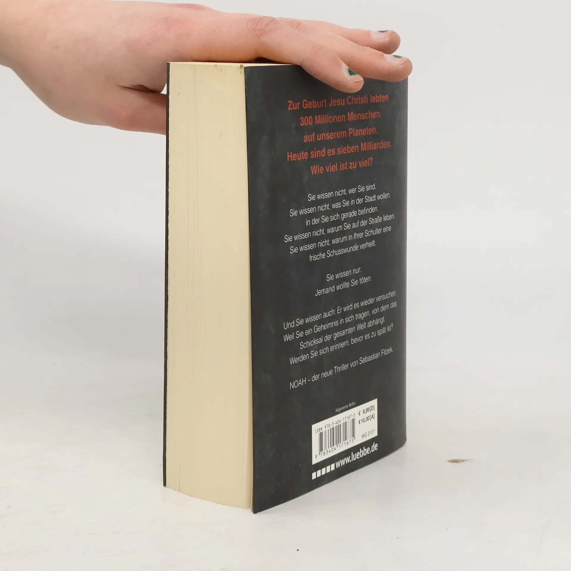 Er kennt seinen Namen nicht. Er hat keine Ahnung, woher er kommt. Er kann sich nicht erinnern, warum er in Berlin ist, seit wann er hier auf der Straße lebt. Die Obdachlosen, mit denen er umherzieht, nennen ihn Noah: Dieser Name ist in seinen rechten Handballen tätowiert. Für Noah wird die Suche nach seiner Identität zu einem Alptraum. Denn wie es scheint, ist er das wesentliche Schlüsselelement einer globalenVerschwörung, die bereits zehntausende Opfer gefordert hat und nun die gesamte Menschheit bedroht ...