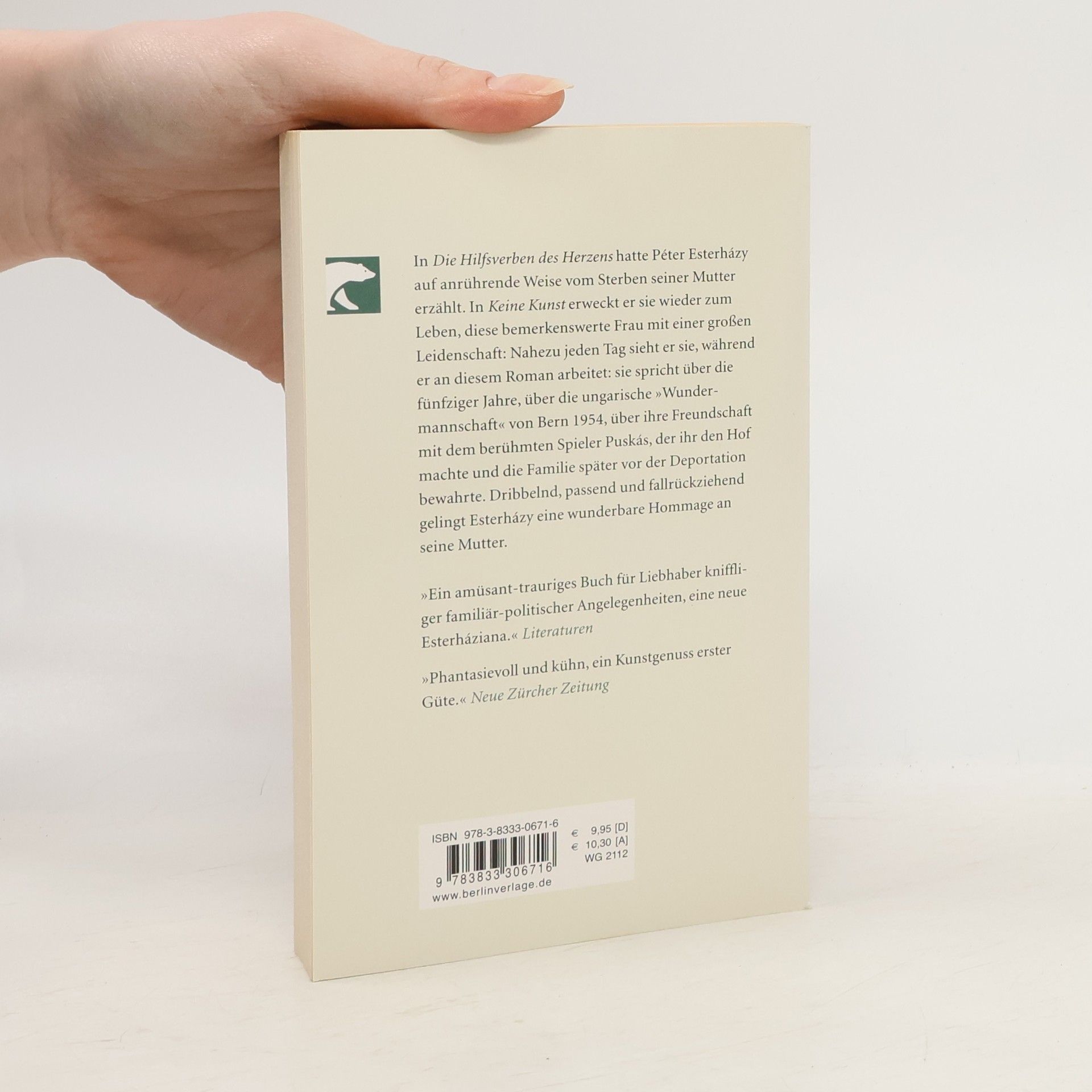 Nach Harmonia Cælestis, dem großen Buch über seinen Vater, widmet Péter Esterházy Keine Kunst seiner verstorbenen Mutter. Nahezu jeden Tag sieht er sie, während er an diesem Roman arbeitet: Sie spricht mit ihm und erzählt Geschichten - über die fünfziger Jahre, über die ungarische »Wundermannschaft« von Bern 1954, ihre Freundschaft mit den Fußballgöttern Hedegkúti und Puskás, der ihr den Hof machte und dem es 1951 gelang, die Familie vor der Deportation zu bewahren. Fußball war ihr ganzes Leben. Dribbelnd, passend und fallrückziehend gelingt Esterházy eine wunderbare Hommage an seine Mutter.