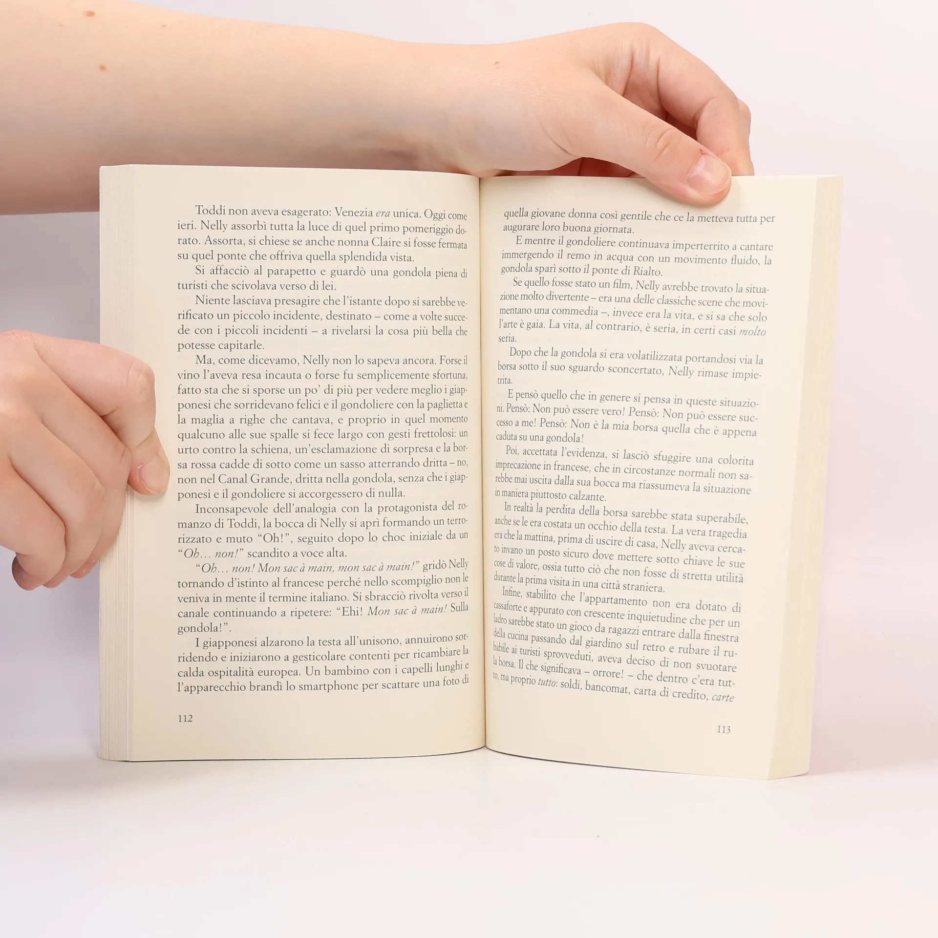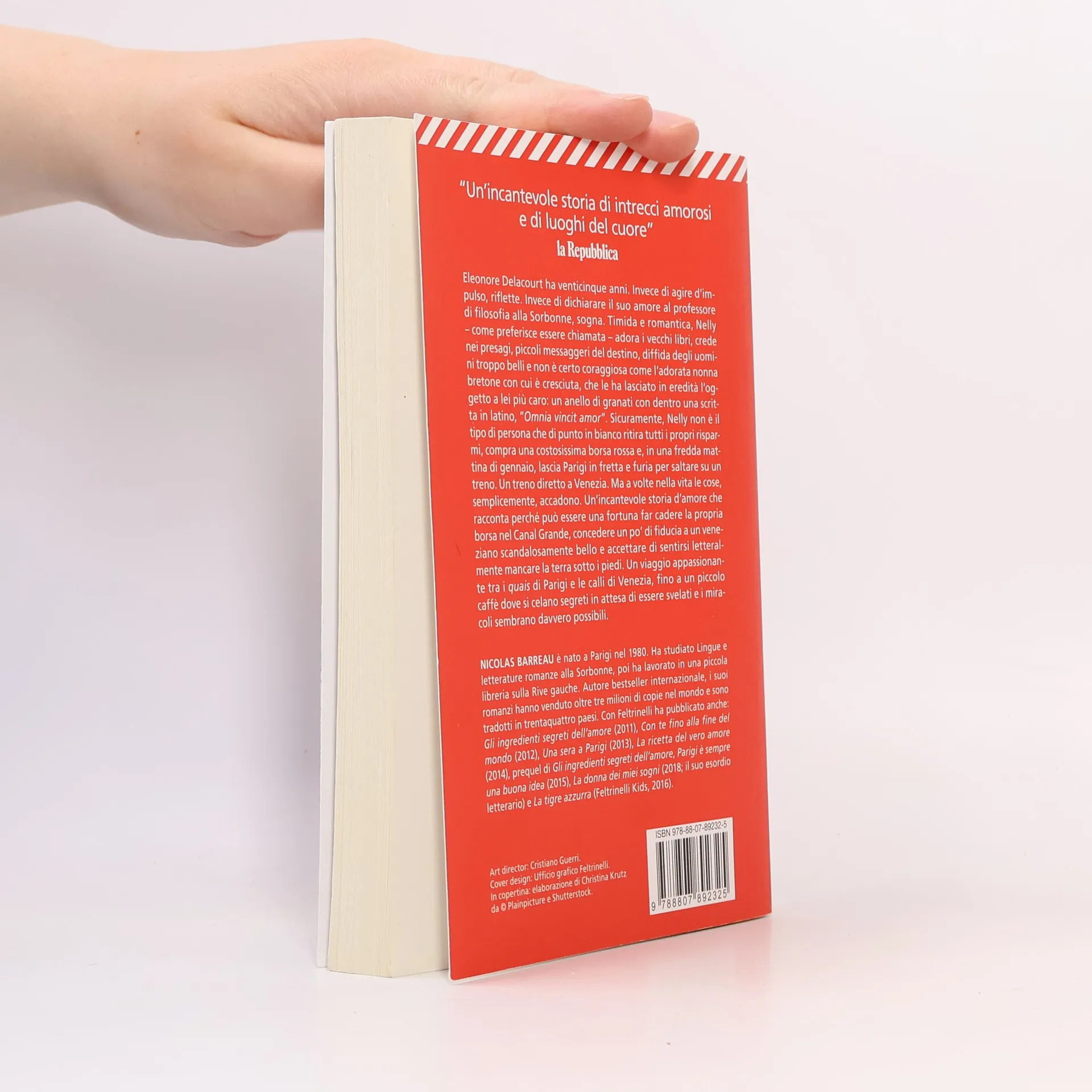 Eleonore Delacourt ha venticinque anni e ama la lentezza. Preferisce passeggiare piuttosto che correre, riflettere piuttosto che agire d’impulso, e sogna piuttosto che dichiarare il suo amore al professore di filosofia alla Sorbonne. Timida e romantica, Nelly adora i vecchi libri, crede nei presagi e diffida degli uomini troppo belli. Non è coraggiosa come la nonna bretone, che le ha lasciato in eredità un anello di granati con la scritta in latino “Omnia vincit amor”. Nelly non è il tipo da ritirare i risparmi per comprare una borsa rossa e lasciare Parigi in fretta per un treno diretto a Venezia. Eppure, a volte, nella vita accadono eventi inaspettati: una brutta influenza, una delusione d’amore e una frase enigmatica trovata in un vecchio libro della nonna. Questa storia d’amore incantevole esplora come possa essere una fortuna far cadere la propria borsa nel Canal Grande, concedere fiducia a un veneziano affascinante e accettare di sentirsi mancare la terra sotto i piedi. Un viaggio appassionante tra i "quais" di Parigi e le calli di Venezia, fino a un piccolo caffè dove segreti attendono di essere svelati e i miracoli sembrano possibili.