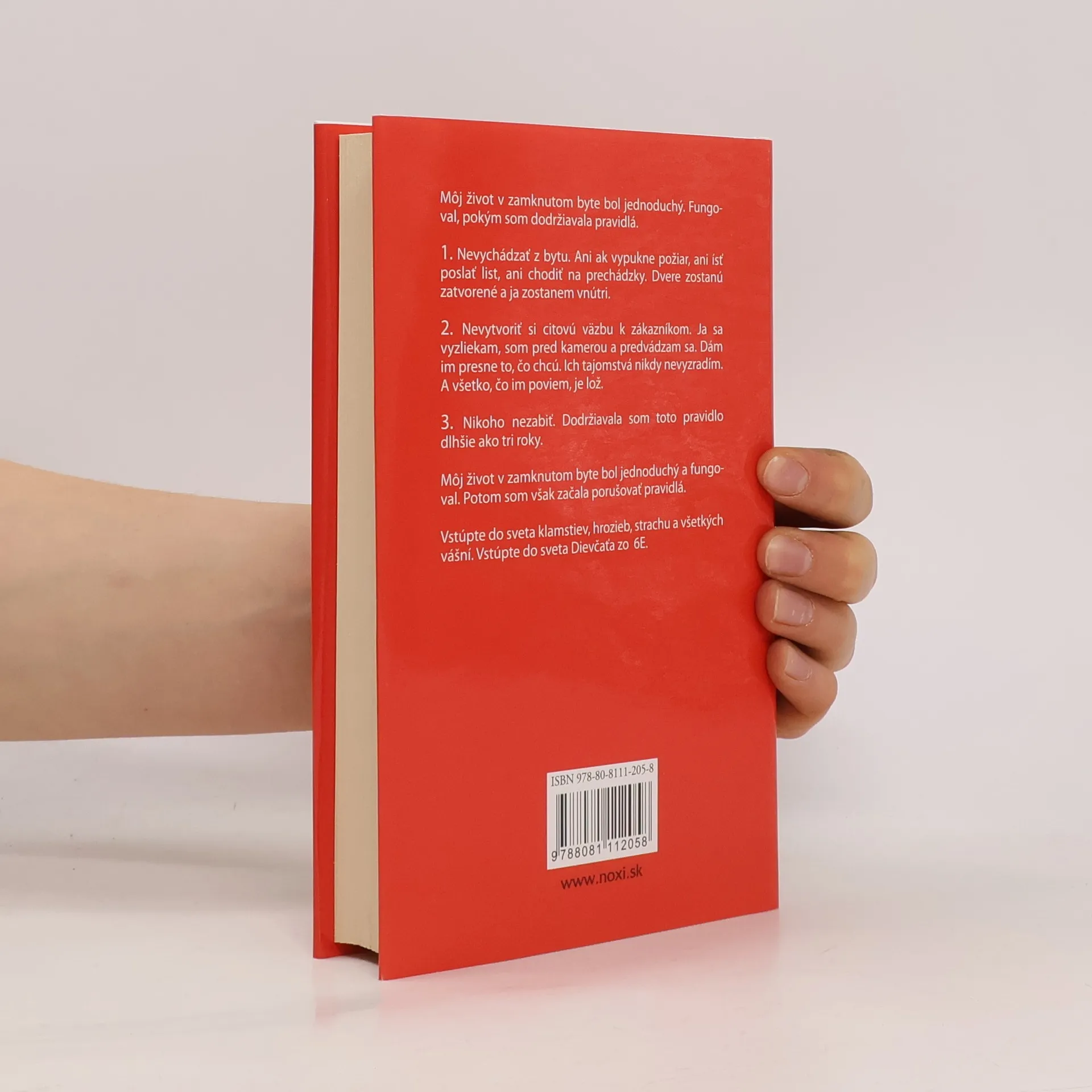 Môj život zamknutý v byte bol jednoduchý. Fungoval, pokým som dodržiavala pravidlá. 1. Nevychádzať z bytu. Ani ak vypukne požiar, ani poslať list, ani na žiadnu vychádzku. Dvere zostanú zatvorené a ja zostanem vnútri. 2. Nevytvoriť si citovú väzbu k zákazníkom. Ja sa vyzliekam, som pred kamerou, a predvádzam sa. Čo chcú, to im dám. Ich tajomstvá nikdy nevyzradím. A všetko, čo im poviem, je lož. 3. Nikoho nezabiť. Dodržiavala som toto pravidlo viac ako tri roky. Môj život zamknutý v byte bol jednoduchý a fungoval. Potom som však začala porušovať pravidlá. Vstúpte do sveta klamstiev, hrozieb, strachu, a všetkých vášní, vstúpte do sveta Dievčaťa zo 6E.