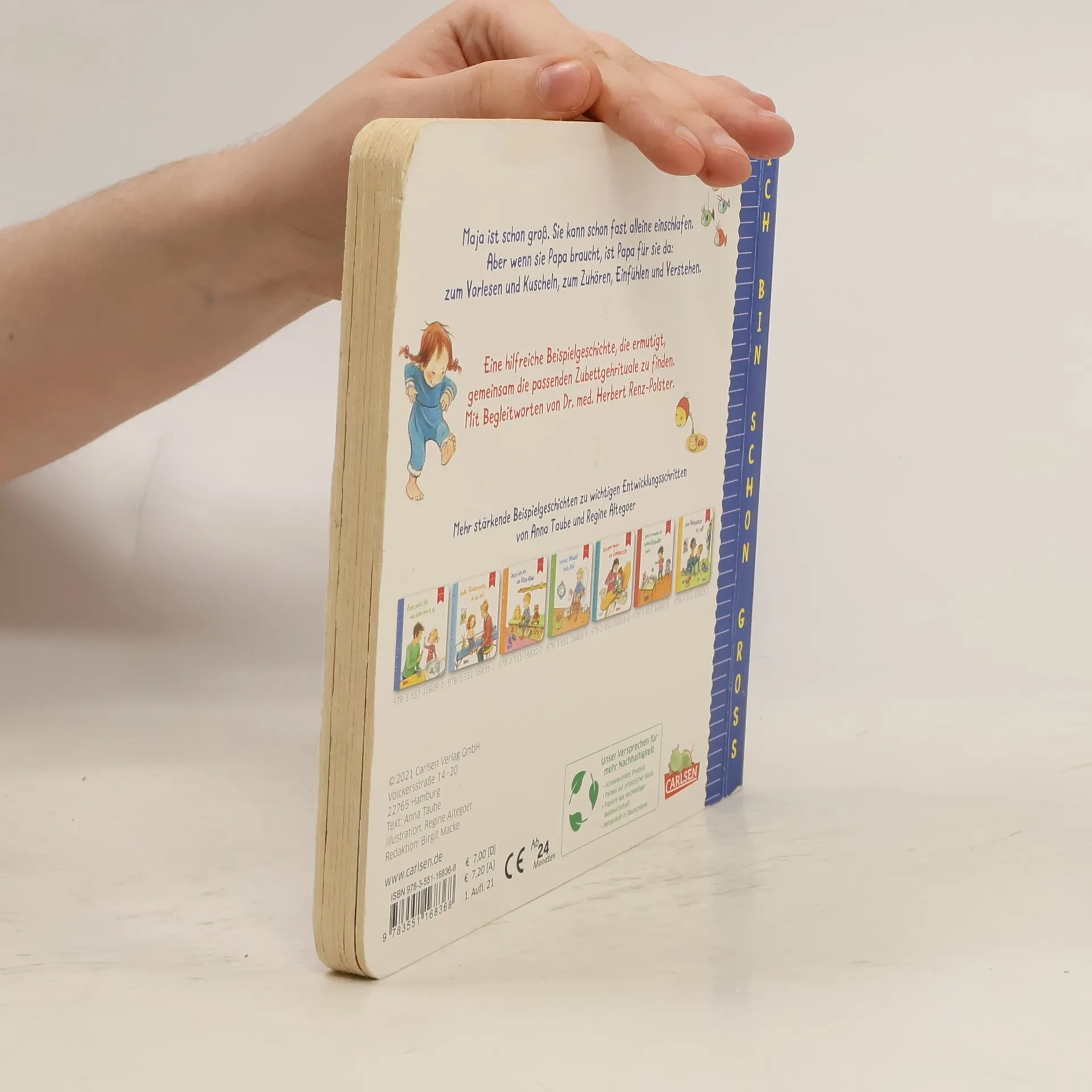 Maja ist schon groß. Sie kann schon fast alleine einschlafen. Aber wenn sie Papa braucht, ist Papa für sie da: zum Vorlesen und Kuscheln, zum Zuhören, Einfühlen und Verstehen. Eine hilfreiche Beispielgeschichte, die ermutigt, gemeinsam die passenden Zubettgehrituale zu finden. Mit Begleitworten von Dr. med. Herbert Renz-Polster. Mehr Beispielgeschichten für Kinder ab 2 Jahren zu wichtigen Entwicklungsschritten in der Reihe Ich bin schon groß: Hallo, Kinderarzt, da bin ich! Jetzt bin ich ein Kita-Kind Tschüss, Windel! Hallo, Klo! Erst putz ich und dann putzt du Jetzt brauche ich keinen Schnuller mehr Ich gehe heute zur Zahnärztin Mein Babysitter ist toll! Alle Bücher mit Extra-Eltern-Tipp-Seite zum Heraustrennen, Reflektieren und Aufbewahren - verfasst von erfahrenen Expert*innen, die Kinder ganz besonders gut verstehen.
