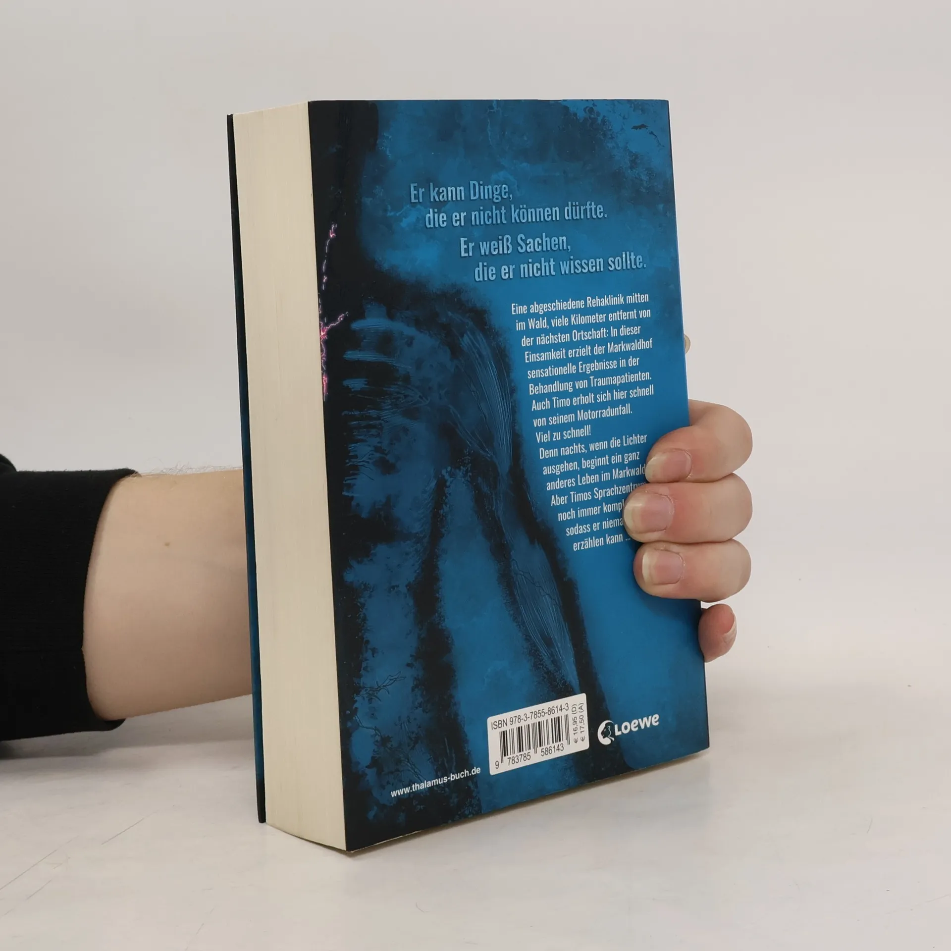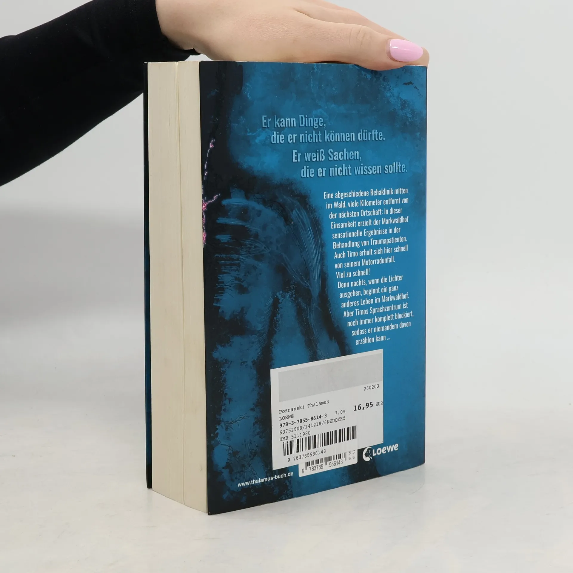 Eine abgelegene Rehaklinik ist Schauplatz des Med-Thrillers von Bestseller-Autorin Ursula Poznanski . Diesmal denkt die ehemalige Medizinjournalistin Chancen und Gefahren der modernen Hirnforschung konsequent weiter und trifft wieder einmal einen Nerv – buchstäblich! Ein schwerer Motorradunfall katapultiert den siebzehnjährigen Timo aus seinem normalen Leben und fesselt ihn für Monate ans Krankenbett. Auf dem Markwaldhof, einem Rehabilitationszentrum, soll er sich von seinen Knochenbrüchen und dem Schädelhirntrauma erholen. Aber schnell stellt Timo fest, dass sich merkwürdige Dinge im Haus abspielen: Der Junge, mit dem er sich das Zimmer teilt, gilt als Wachkomapatient und hoffnungsloser Fall, doch nachts läuft er herum, spricht – und droht Timo damit, ihn zu töten, falls er anderen davon erzählt. Eine Sorge, die unbegründet ist, denn Timos Sprachzentrum ist schwer beeinträchtigt, seine Feinmotorik erlaubt ihm noch nicht niederzuschreiben, was er erlebt. Und allmählich entdeckt er an sich selbst Fähigkeiten, die neu sind. Er kann Dinge, die er nicht können dürfte. Weiß von Sachen, die er nicht wissen sollte …