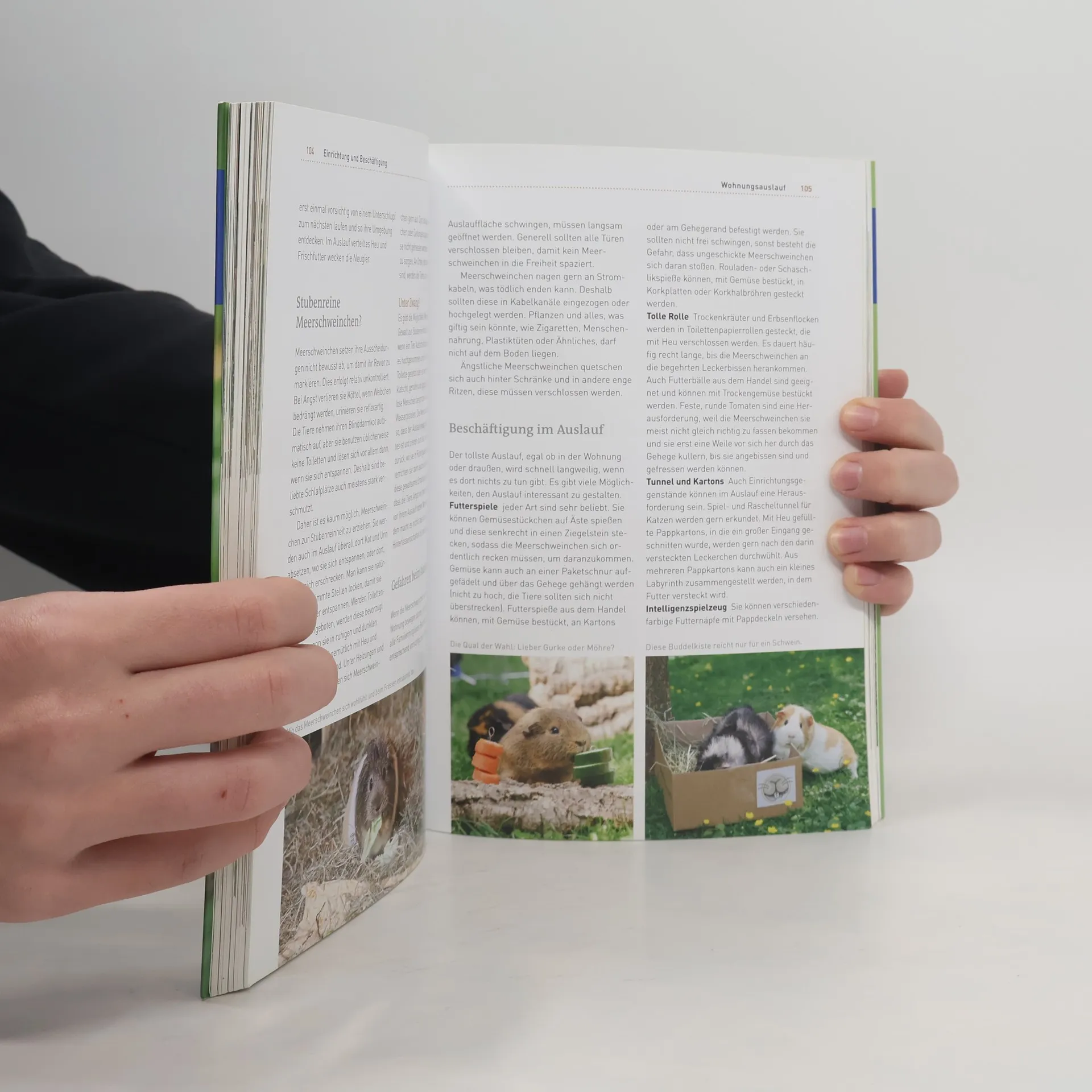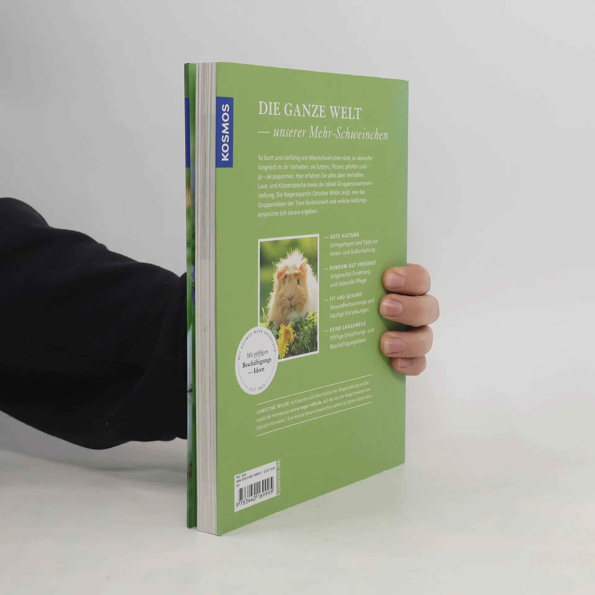 Nager-Expertin Christine Wilde beschreibt, wie Meerschweinchen in freier Wildbahn leben und zieht daraus Rückschlüsse auf die Gruppenleben mit viel Platz und Versteckmöglichkeiten statt beengter Käfige und als Nahrung Grünfutter, Heu, Gemüse und Zweige statt nur Fertigfutter. Hier erhält man nicht nur ausführliche Informationen über das Verhalten, die Haltung und Beschäftigung der kleinen Nager, sondern auch darüber, wie man Meerschweinchenkrankheiten behandelt und Nachwuchs aufzieht – für ein rundum glückliches Meerschweinchenleben..