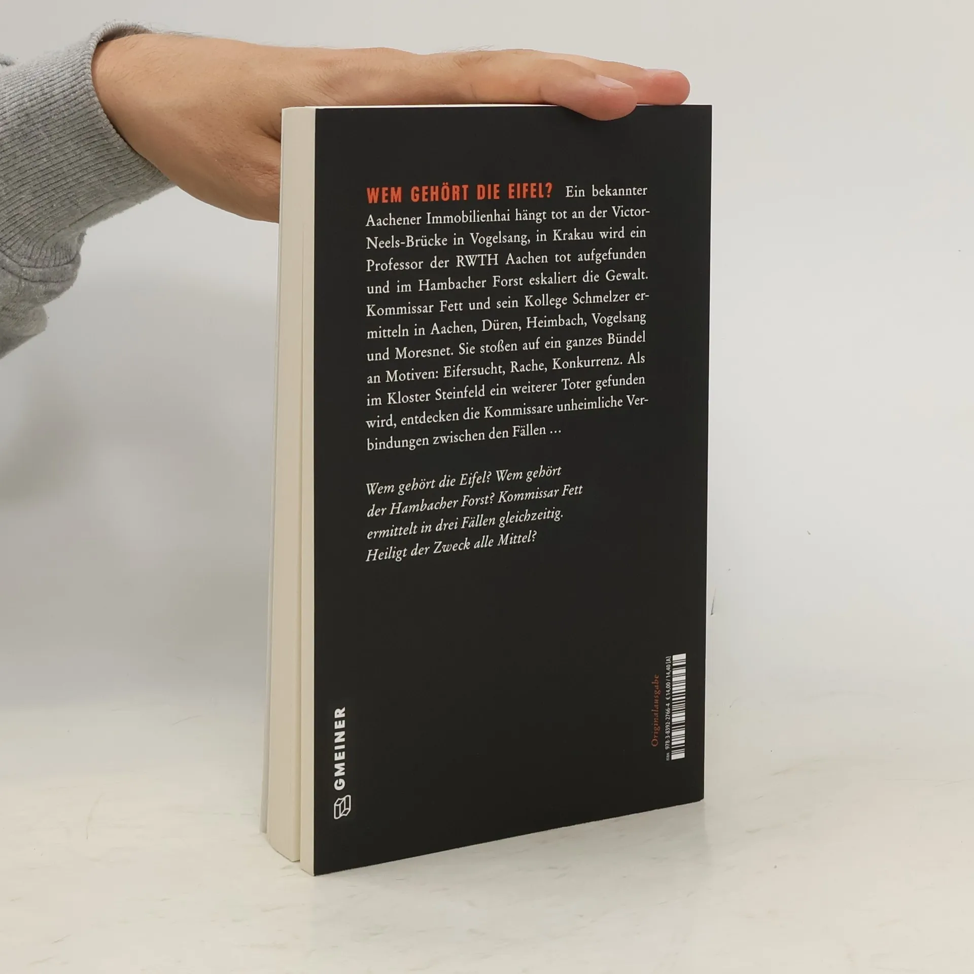 Ein bekannter Aachener Immobilienhai hängt tot an der Victor-Neels-Brücke in Vogelsang, in Krakau wird ein Professor der RWTH Aachen tot aufgefunden und im Hambacher Forst eskaliert die Gewalt. Kommissar Fett und sein Kollege Schmelzer ermitteln in Aachen, Düren, Heimbach, Vogelsang und Moresnet. Sie stoßen auf ein ganzes Bündel an Motiven: Eifersucht, Rache, Konkurrenz. Als im Kloster Steinfeld ein weiterer Toter gefunden wird, entdecken die Kommissare unheimliche Verbindungen zwischen den Fällen …