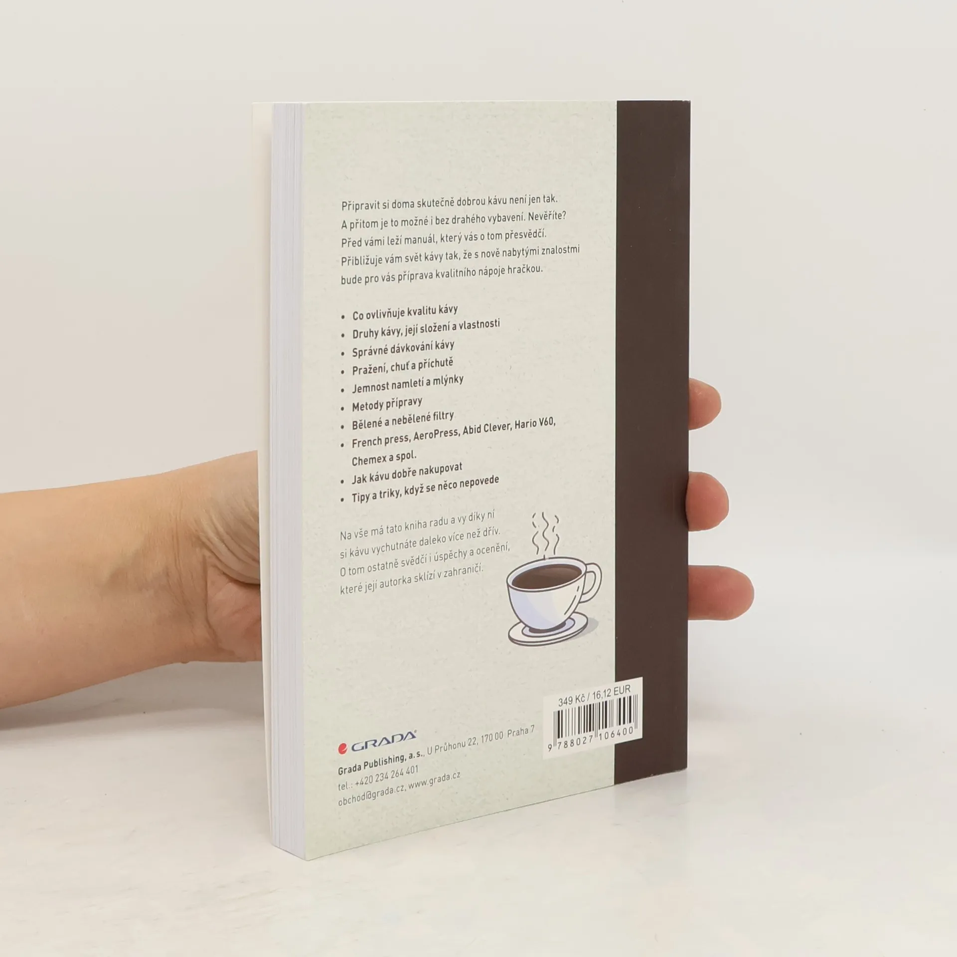 Autorka si s vysvětlováním, co všechno příprava chutné kávy obnáší, co je k tomu zapotřebí, dala neskutečnou práci a její výsledek stojí opravdu za to. O tom ostatně svědčí ohlasy a ocenění, které za knihu dostává. Dozvíte se například, co vše ovlivňuje kvalitu kávy, její sílu, hořkost, a naučíte se kávu správně kupovat, mlít, dávkovat, zalévat. Poučíte se o různých druzích kávy, které si můžete uvařit, a postupně se vyznáte v celé hitparádě nejrůznějších mlýnků, kávovarů, filtrů, konvic a dalších pomůcek, které nabízí náš trh. A nejen vyznat, vy se je naučíte i správně používat! Poznáte, jaké druhy kávy se pěstují, čím se od sebe navzájem odlišují, odkud se dovážejí. Budete umět rozlišovat jejich vlastnosti, aroma, chutě a příchutě. A na závěr se naučíte všelijaké triky, když se něco nepovede, uvařená káva je příliš slabá, nebo naopak příliš hořká, nebo se vám prostě povedlo koupit nekvalitní produkt. Na vše má tato kniha radu a vy díky ní budete mít požitek z pití kávy daleko větší než dříve.