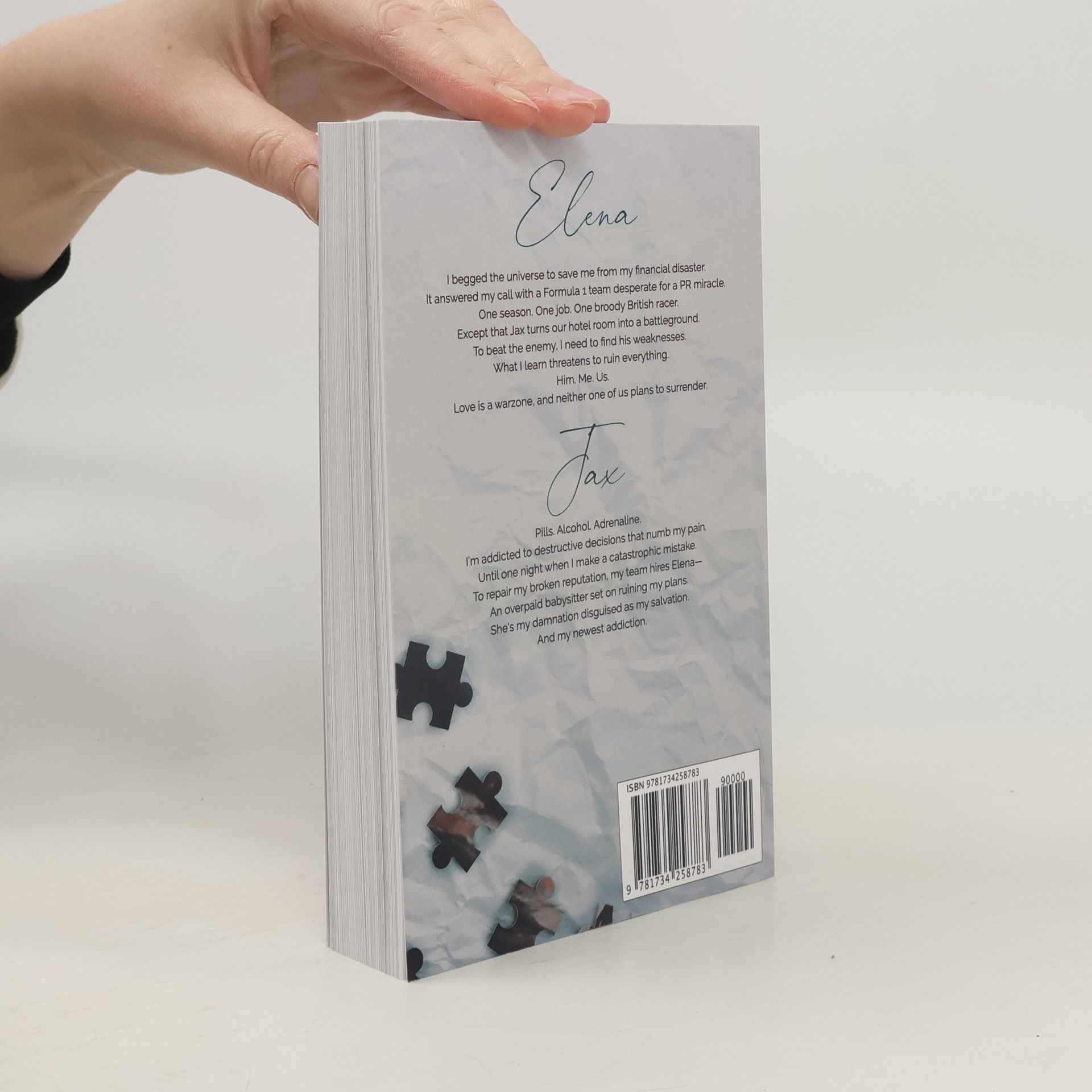 Elena: I begged the universe to save me from my financial disaster. It answered my call with a Formula 1 team desperate for a PR miracle. One season. One job. One broody British racer. Except that Jax turns our hotel room into a battleground. To beat the enemy, I need to find his weaknesses. What I learn threatens to ruin everything. Him. Me. Us. Love is a war zone, and neither one of us plans to surrender. Jax: Pills. Alcohol. Adrenaline. I'm addicted to destructive decisions that numb my pain. Until one night when I make a catastrophic mistake. To repair my broken reputation, my team hires Elena-- An overpaid babysitter set on ruining my plans. She's my damnation disguised as my salvation. And my newest addiction