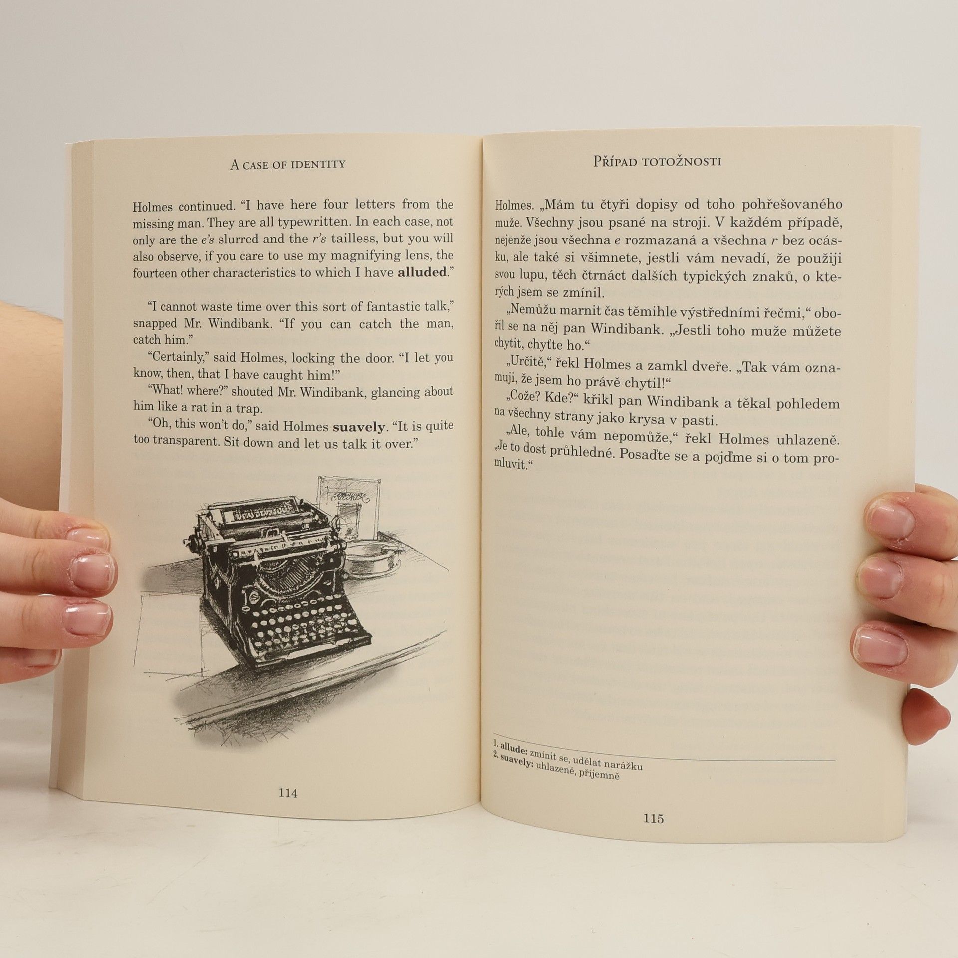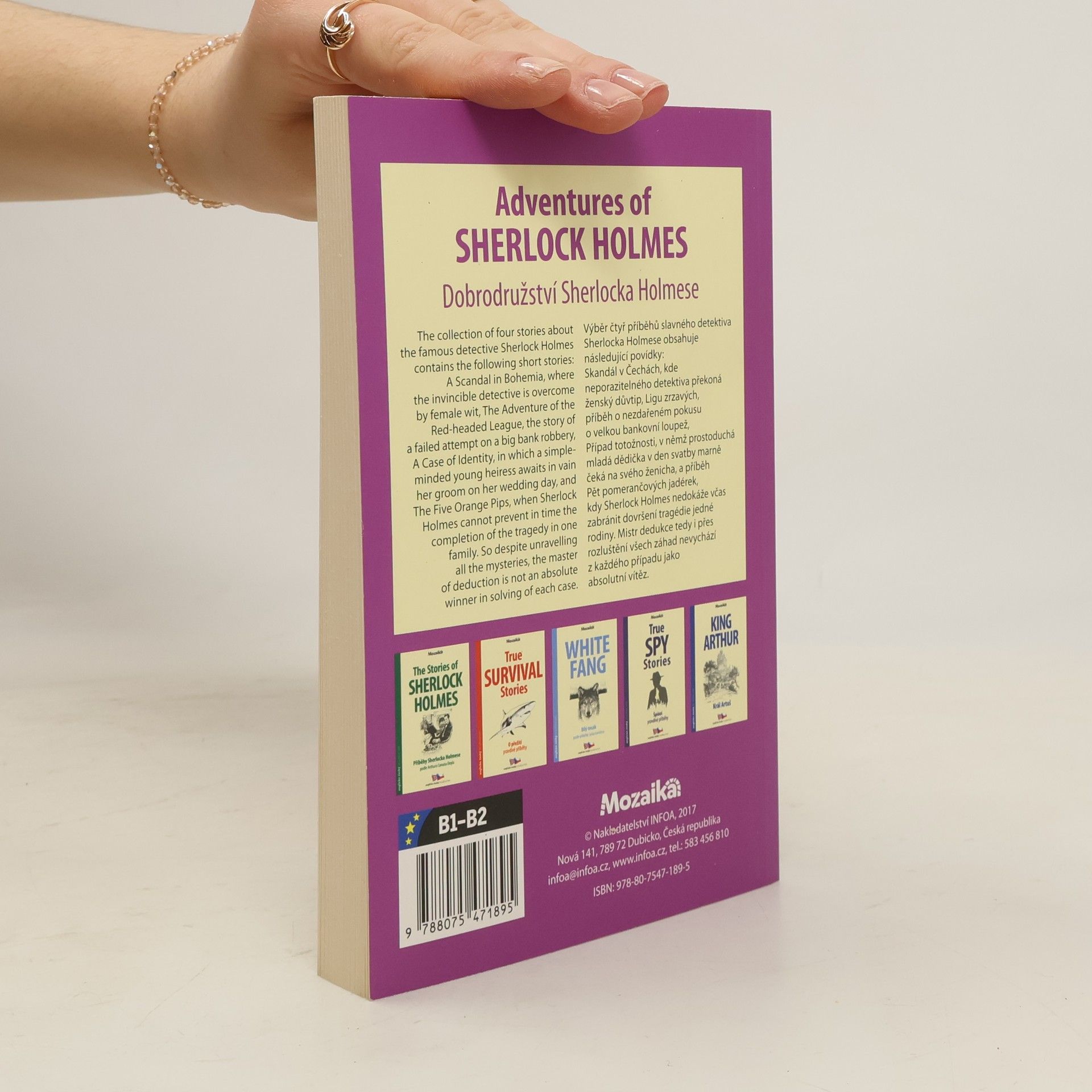 Převyprávěl Ashley Davies. Anglicko-český zrcadlový text. Výběr čtyř příběhů slavného detektiva Sherlocka Holmese obsahuje tyto povídky: Skandál v Čechách, kde neporazitelného detektiva překoná ženský důvtip, Ligu zrzavých, příběh o nezdařeném pokusu o velkou bankovní loupež, Případ totožnosti, v němž prostoduchá mladá dědička v den svatby marně čeká na svého ženicha, a příběh Pět pomerančových jadérek, kdy Sherlock Holmes nedokáže včas zabránit dovršení tragédie jedné rodiny. Mistr dedukce tedy i přes rozluštění všech záhad nevychází z každého případu jako absolutní vítěz.