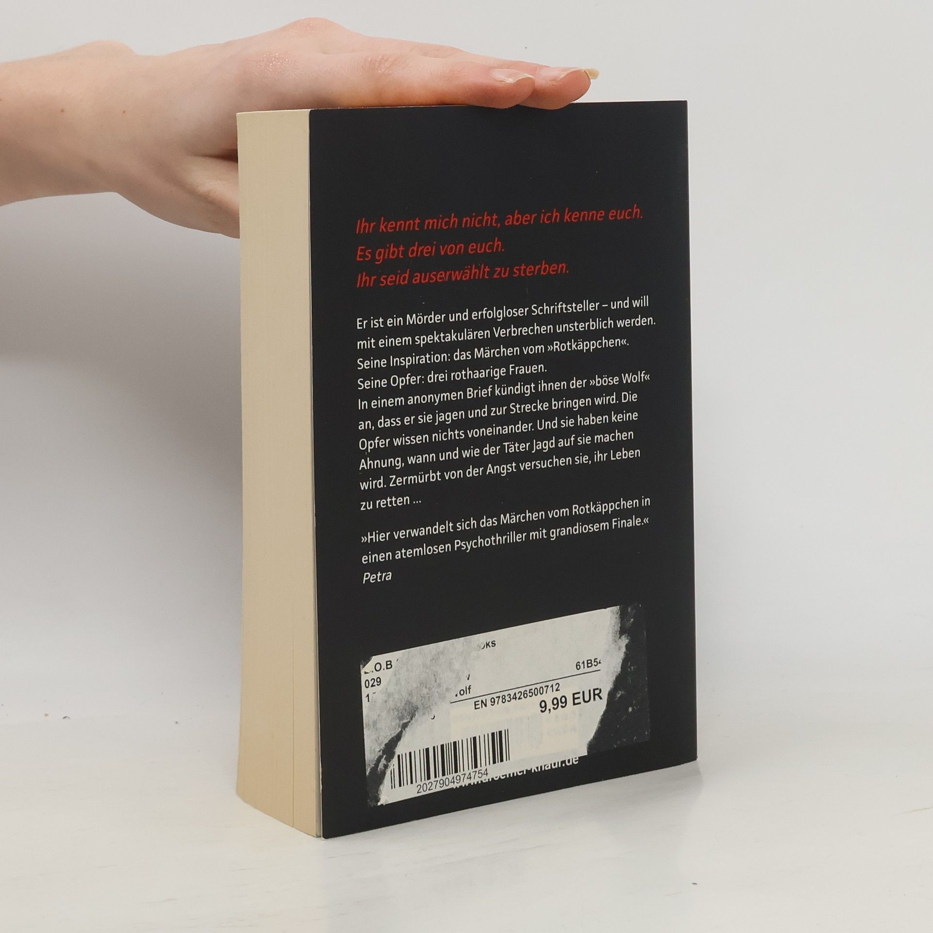 Er ist ein Mörder und erfolgloser Schriftsteller – und will mit einem spektakulären Verbrechen unsterblich werden. Seine Inspiration: das Märchen vom Rotkäppchen. Seine Opfer: drei rothaarige Frauen. In einem anonymen Brief kündigt ihnen der »böse Wolf« an, dass er sie jagen und zur Strecke bringen wird. Die Opfer wissen nichts voneinander. Und sie haben keine Ahnung, wann und wie der Täter Jagd auf sie machen wird. Zermürbt von ihrer Angst versuchen sie, ihr Leben zu retten ...