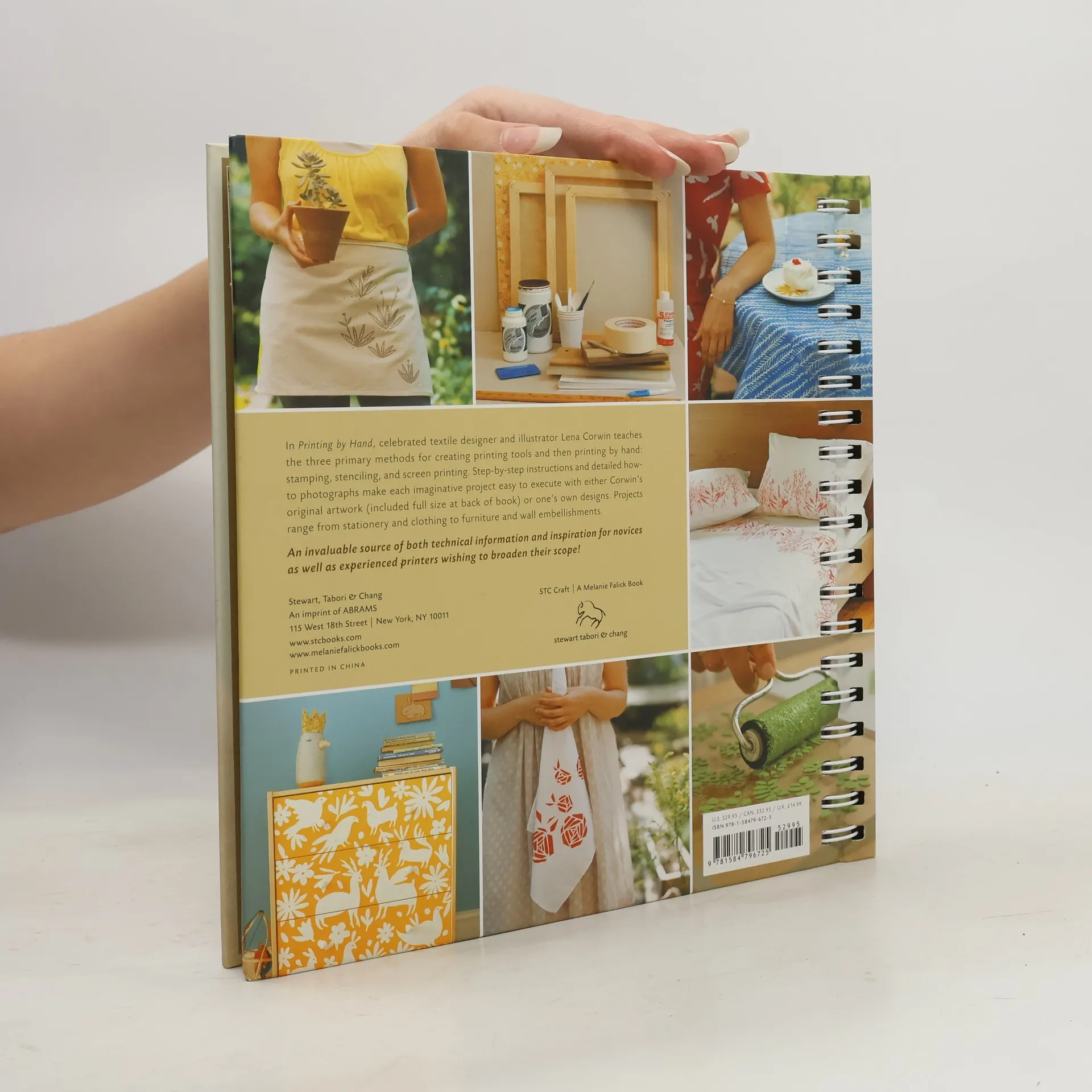 It’s the natural inconsistencies―the accidental differences between one finished piece and another―that make hand-printed fabrics, papers, furniture, and works of art so interesting. The quirks are what show the maker’s intimate involvement in the process, and it’s that unique quality that first attracted textile designer and illustrator Lena Corwin to hand-printing. Even though decorative prints are more in vogue than ever, there was until now no up-to-date hand-printing guide―no single source explaining the tools and materials that are used today, or reflecting a contemporary aesthetic. Corwin has given us that guide. Using step-by-step instructions and up-close photos, Corwin teaches crafters everything they need to know to master stamping, stenciling, and screen printing, from making their own printing devices to trouble-shooting when plans go awry. Her inimitable collection of projects ranges from stamped stationery and simple-to-sew pouches, to stenciled tote bags and furniture, to screen-printed bed linens and upholstery fabric. There’s even a silk-screened dog bed. The author has created original artwork for each project (full-size patterns are included in an envelope at the back of the book), so that every crafter can achieve the same beautiful results. Or maybe not quite the same. It’s the subtle differences that make hand-printing so special and alluring.
