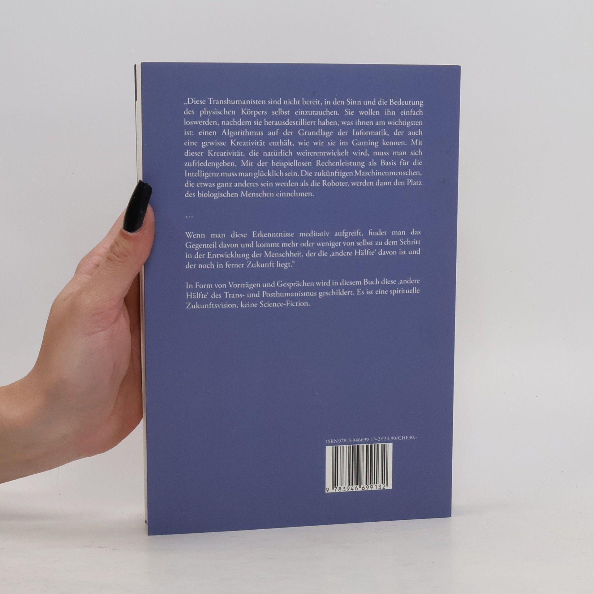 „Dann können wir hoffen, einen Ausblick auf das zukünftige Wort zu bekommen, das mit geistiger Kraft als Offenbarung gesprochen werden wird und das in das Element der Luft hineinwirken wird.“ „Diese Transhumanisten sind nicht bereit, in den Sinn und die Bedeutung des physischen Körpers selbst einzutauchen. Sie wollen ihn einfach loswerden, nachdem sie herausdestilliert haben, was ihnen am wichtigsten ist: einen Algorithmus auf der Grundlage der Informatik, der auch eine gewisse Kreativität enthält, wie wir sie im Gaming kennen. Mit dieser Kreativität, die natürlich weiterentwickelt wird, muss man sich zufriedengeben. Mit der beispiellosen Rechenleistung als Basis für die Intelligenz muss man glücklich sein. Die zukünftigen Maschinenmenschen, die etwas ganz anderes sein werden als die Roboter, werden dann den Platz des biologischen Menschen einnehmen. … Wenn man diese Erkenntnisse meditativ aufgreift, findet man das Gegenteil davon und kommt mehr oder weniger von selbst zu dem Schritt in der Entwicklung der Menschheit, der die ‚andere Hälfte‘ davon ist und der noch in ferner Zukunft liegt.“ In Form von Vorträgen und Gesprächen wird in diesem Buch diese ‚andere Hälfte‘ des Trans- und Posthumanismus geschildert. Es ist eine spirituelle Zukunftsvision, keine Science-Fiction.
