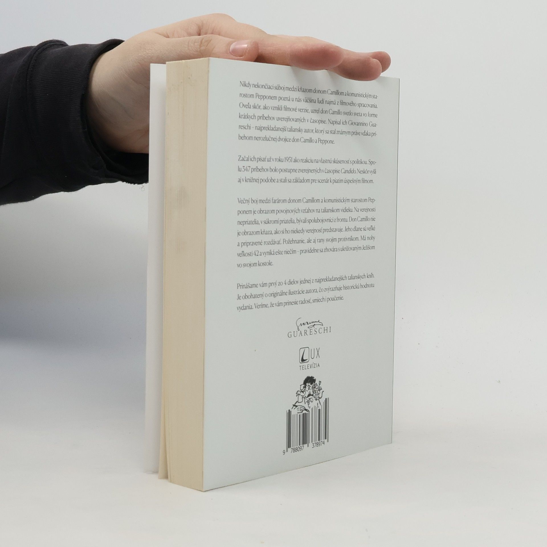 Filmové spracovanie kňaza Don Camilla a komunistického starostu Pepponeho si získalo srdcia miliónov divákov na celom svete. Televízia Lux vám prináša exkluzívne knižné vydanie príbehov Giovannina Guareschiho, na základe ktorých boli filmy natočené.Prvý diel jednej z najprekladanejších talianskych kníh Don Camillo a jeho svet, je obohatený o originálne ilustrácie autora, čo zvýrazňuje historickú hodnotu vydania. Veríme, že vám prinesie radosť, smiech i poučenie. Príjemné čítanie celej rodine prajú tvorcovia prvého slovenského vydania!