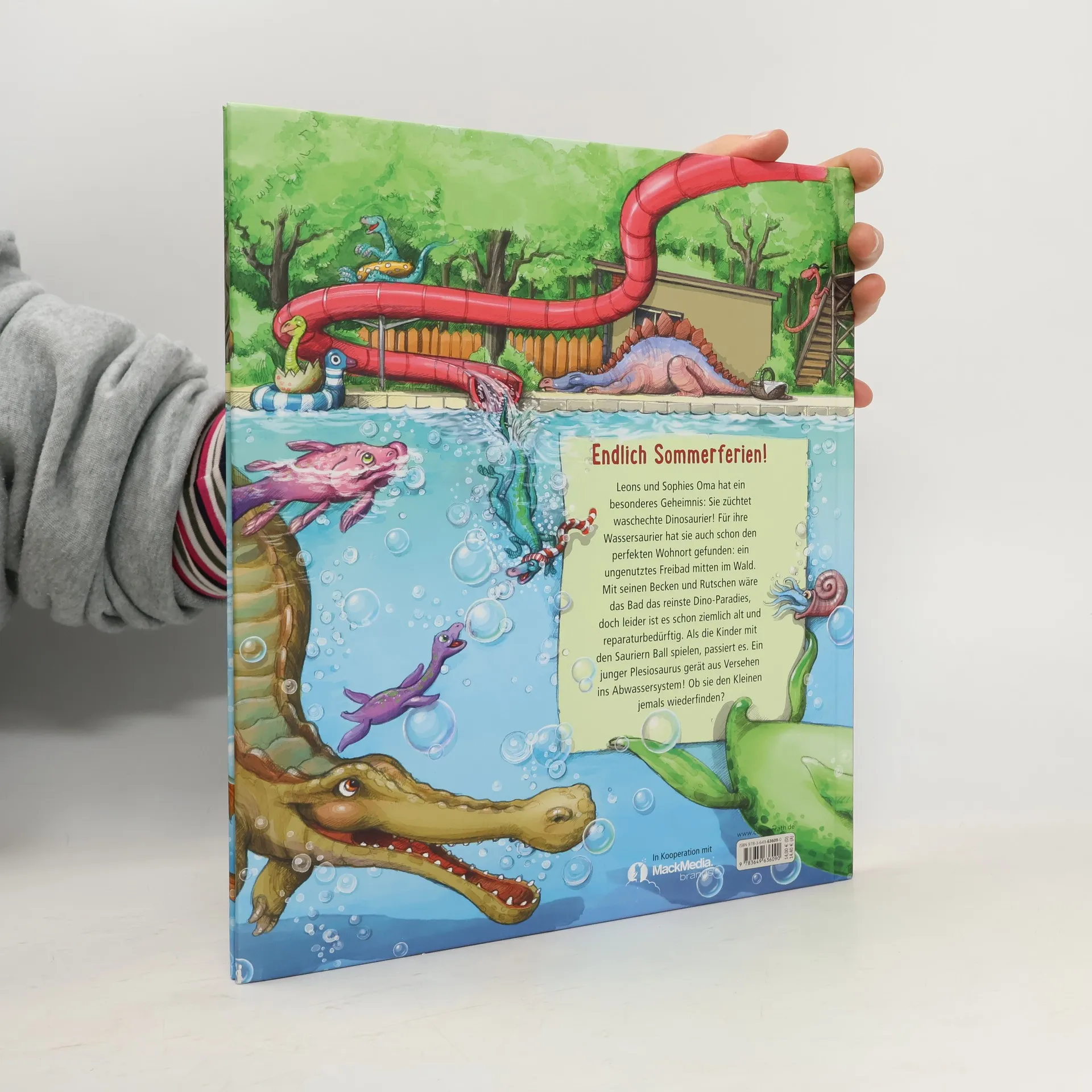 Leons und Sophies Oma hat ein besonderes Geheimnis: Sie züchtet waschechte Saurier! Für ihre Wassersaurier hat sie auch schon den perfekten Wohnort gefunden: ein ungenutztes Freibad mitten im Wald. Mit seinen Becken und Rutschen wäre das Bad das reinste Paradies, doch leider ist es schon ziemlich alt und reparaturbedürftig. Als Leon und Sophie mit den Sauriern Ball spielen, passiert es: Ein junger Plesiosaurus gerät aus Versehen in ein Abflussrohr, das bis zu einem großen Fluss führt! Ob sie den Kleinen dort jemals wiederfinden …? Ein neues, spannendes Abenteuer mit Leon, Sophie, ihrer Oma und jeder Menge toller Saurier! Für Kinder ab 3 Jahren. Mit Spotlack auf dem Cover.