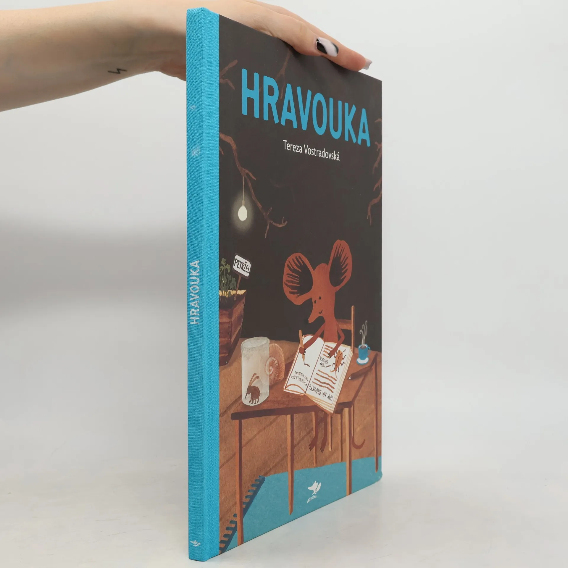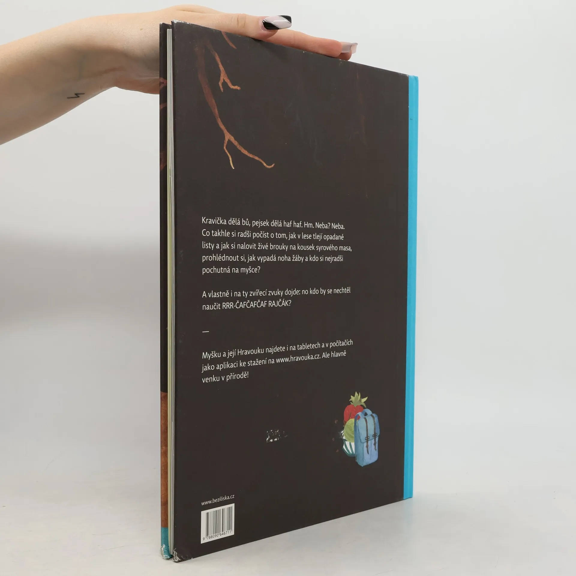 Kravička dělá bů, pejsek dělá haf haf. Hm. Neba? Neba. Co takhle si radši počíst o tom, jak v lese tlejí opadané listy, prohlédnout si, jak vypadá noha žáby a kdo si nejradši pochutná na myšce? Právě myška žijící v podzemní noře je vypravěčkou, průzkumnicí lesa, sadu i rybníčka: obkresluje tvary pecek, ohryzává mrkve v zemi a přemýšlí jak rozdělit plody na ovoce a zeleninu, zkoumá stáří lesa podle letokruhů a loví živé brouky na kousek syrového masa. Všechno pak pečlivě zapisuje do svého sešitu a radí, jak si vyrobit herbář nebo udělat zahradní jezírko. První vydání.