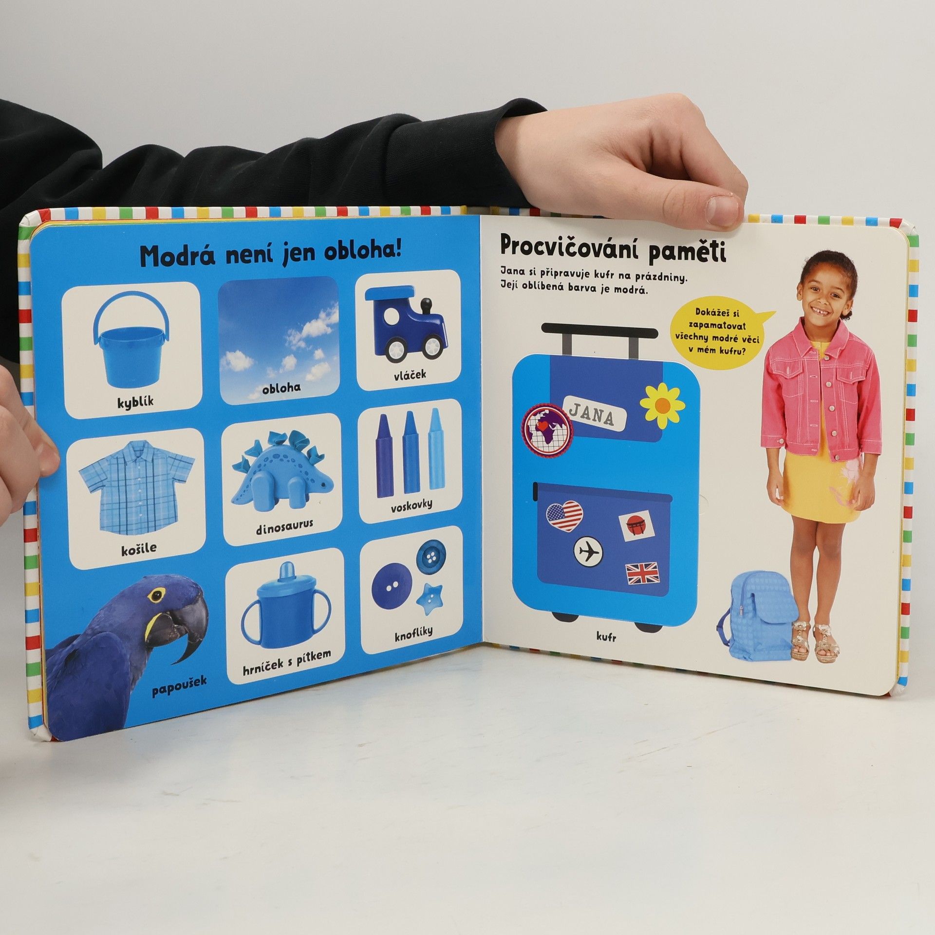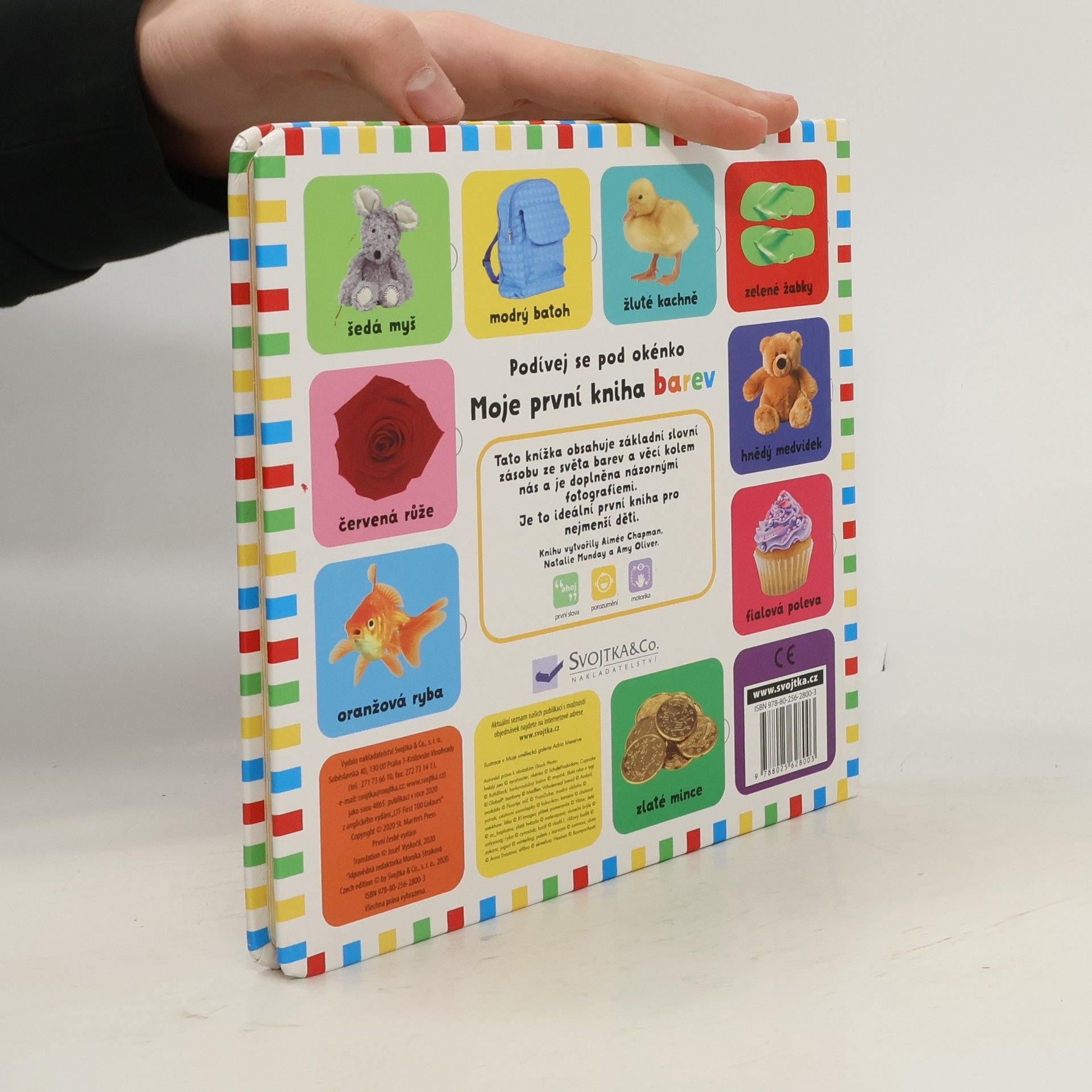 Toto leporelo obsahuje základní slovní zásobu doplněnou fotografiemi a je tak ideální pro učení barev a předmětů, které mohou děti znát ze svého domova nebo blízkého okolí. Kniha je rozdělena do částí podle barev a tak jsou jednotlivé barvy podrobně představeny na oblečení, hračkách, zvířatech a věcech každodenní potřeby. Knížka obsahuje velké množství odklápěcích okének, které knížku dělají zábavnější a interaktivnější. Pevné stránky a malý formát je vhodný do malých dětských rukou a děti tak procvičí jemnou motoriku.