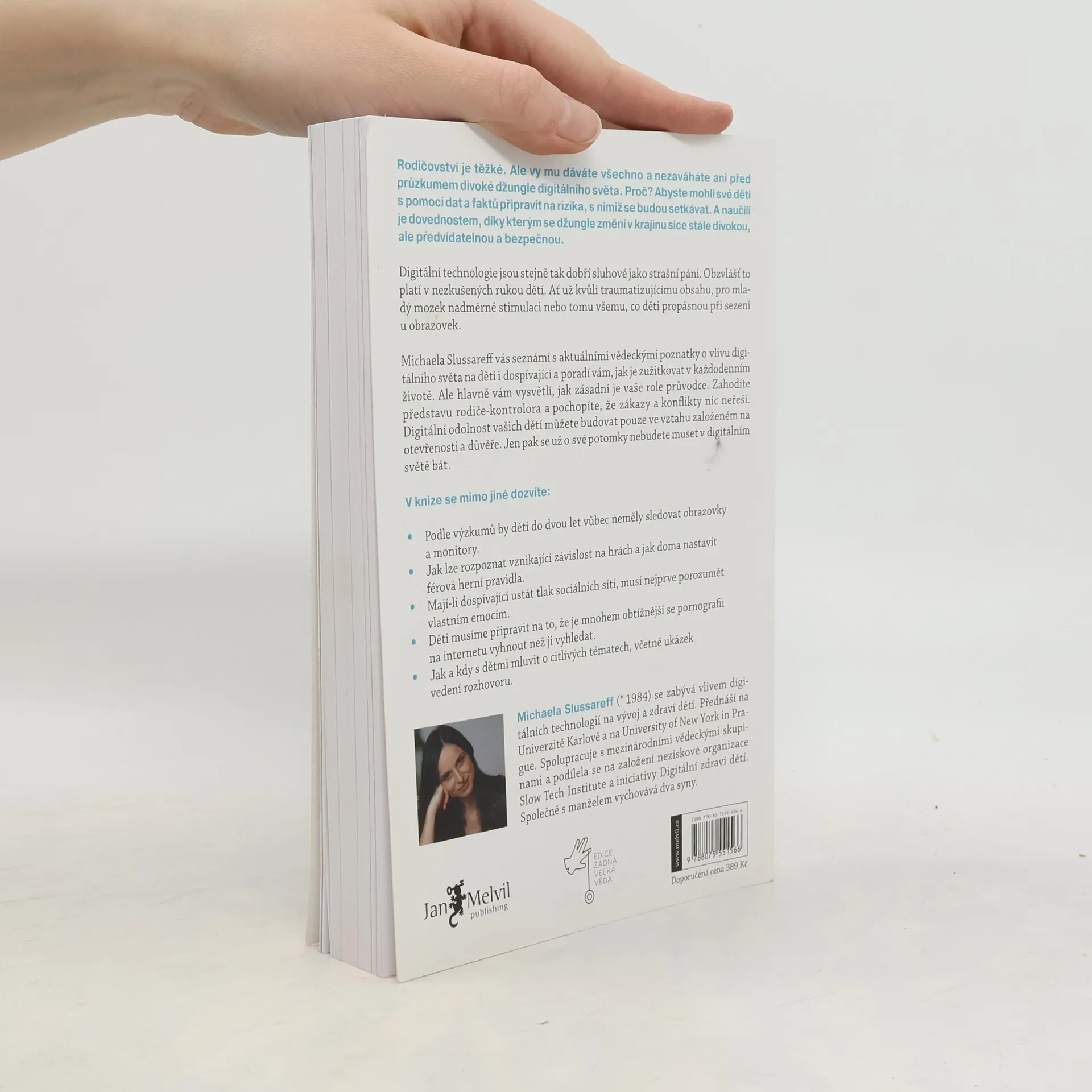 Digitální technologie jsou stejně tak dobří sluhové jako strašní páni. Obzvlášť to platí v nezkušených rukou dětí. Ať už kvůli nevhodnému a traumatizujícímu obsahu, pro vyvíjející se mozek nadměrné stimulaci nebo tomu všemu, co děti propásnou sezením u obrazovek. Michaela Slussareff vás seznámí s aktuálními vědeckými poznatky o vlivu digitálního světa na děti i dospívající a poradí vám, jak je uplatnit v každodenním životě. Ale hlavně vám vysvětlí, jak zásadní je vaše role průvodce. Zahodíte představu rodiče-kontrolora a pochopíte, že zákazy a konflikty nic neřeší. Digitální odolnost vašich dětí můžete budovat pouze ve vztahu založeném na otevřenosti a důvěře. Jen pak se už o své potomky nebudete muset v digitálním světě bát.