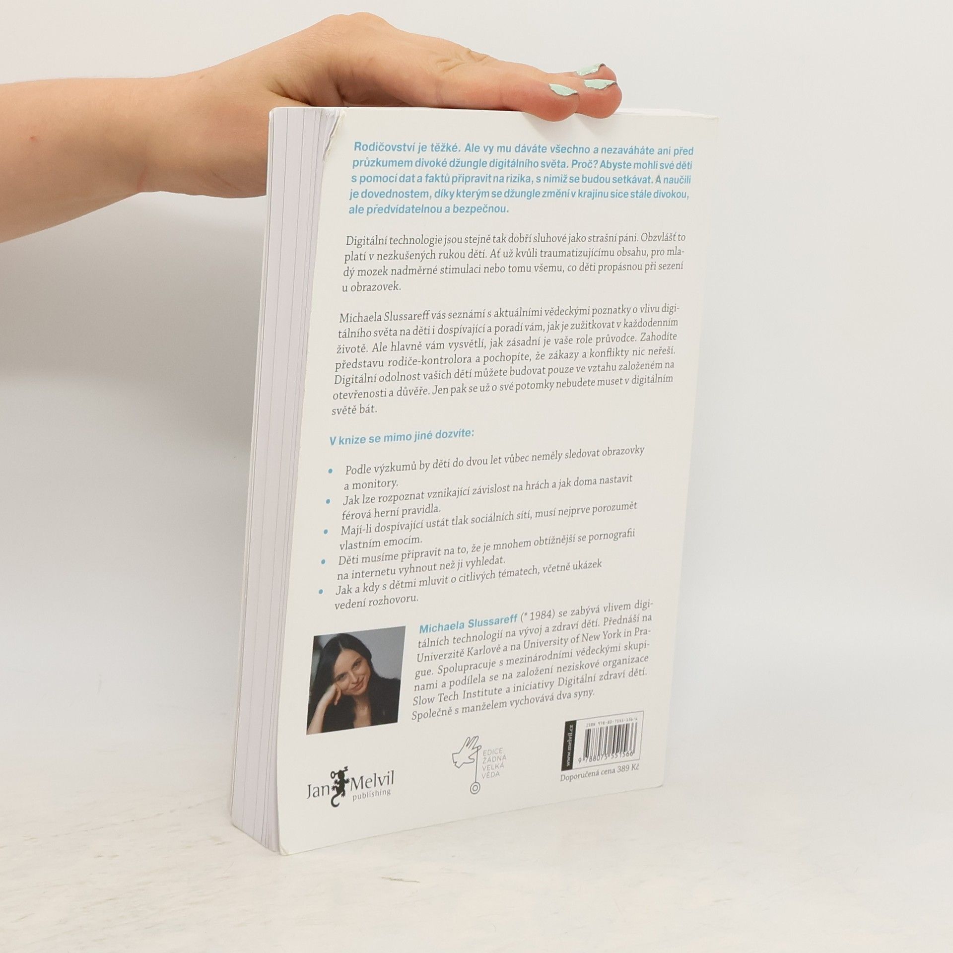 Digitální technologie jsou stejně tak dobří sluhové jako strašní páni. Obzvlášť to platí v nezkušených rukou dětí. Ať už kvůli nevhodnému a traumatizujícímu obsahu, pro vyvíjející se mozek nadměrné stimulaci nebo tomu všemu, co děti propásnou sezením u obrazovek. Michaela Slussareff vás seznámí s aktuálními vědeckými poznatky o vlivu digitálního světa na děti i dospívající a poradí vám, jak je uplatnit v každodenním životě. Ale hlavně vám vysvětlí, jak zásadní je vaše role průvodce. Zahodíte představu rodiče-kontrolora a pochopíte, že zákazy a konflikty nic neřeší. Digitální odolnost vašich dětí můžete budovat pouze ve vztahu založeném na otevřenosti a důvěře. Jen pak se už o své potomky nebudete muset v digitálním světě bát.