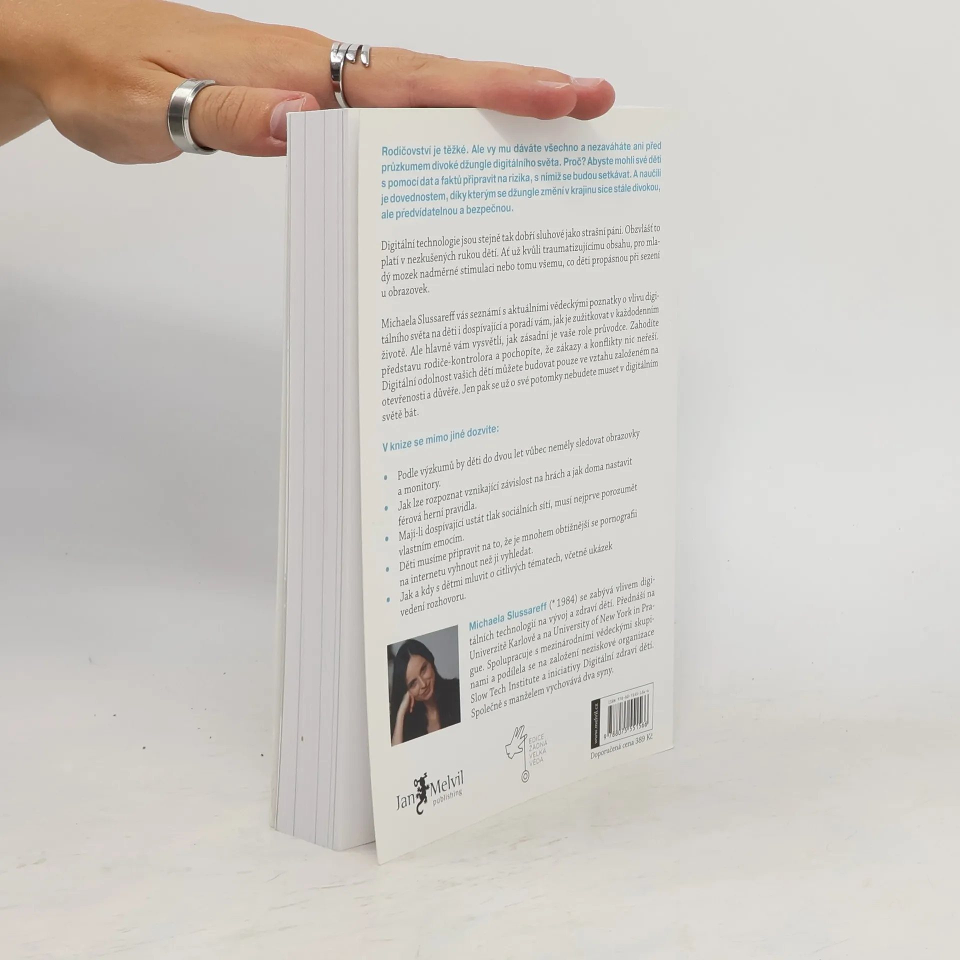 Digitální technologie jsou stejně tak dobří sluhové jako strašní páni. Obzvlášť to platí v nezkušených rukou dětí. Ať už kvůli nevhodnému a traumatizujícímu obsahu, pro vyvíjející se mozek nadměrné stimulaci nebo tomu všemu, co děti propásnou sezením u obrazovek. Michaela Slussareff vás seznámí s aktuálními vědeckými poznatky o vlivu digitálního světa na děti i dospívající a poradí vám, jak je uplatnit v každodenním životě. Ale hlavně vám vysvětlí, jak zásadní je vaše role průvodce. Zahodíte představu rodiče-kontrolora a pochopíte, že zákazy a konflikty nic neřeší. Digitální odolnost vašich dětí můžete budovat pouze ve vztahu založeném na otevřenosti a důvěře. Jen pak se už o své potomky nebudete muset v digitálním světě bát.