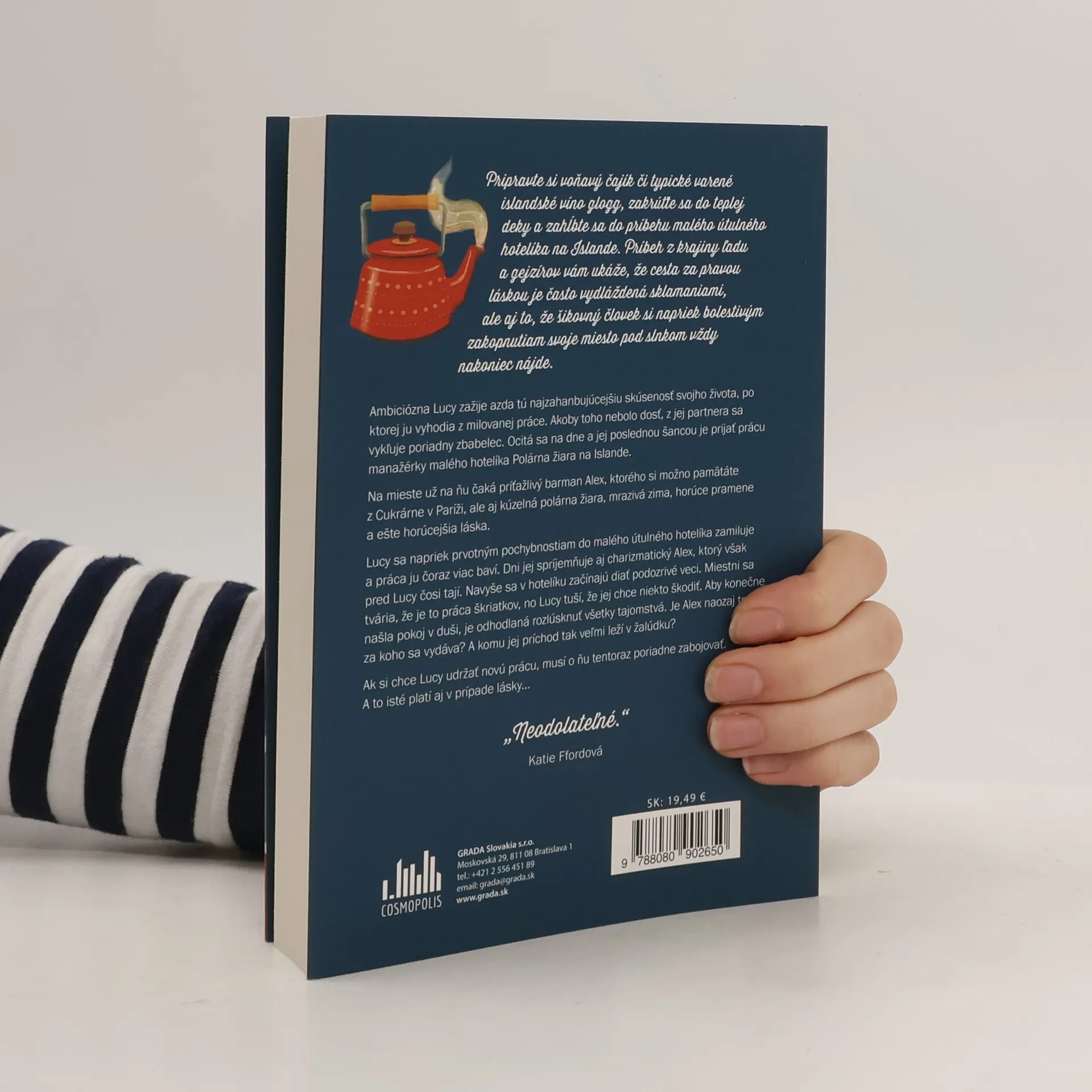 Pripravte si voňavý čajík či typické varené islandské víno glogg, zakrúťte sa do teplej deky a zahĺbte sa do príbehu malého útulného hotelíka na Islande. Príbeh z krajiny ľadu a gejzírov vám ukáže, že cesta za pravou láskou je často vydláždená sklamaniami, ale aj to, že šikovný človek i napriek bolestivým zakopnutiam svoje miesto pod slnkom vždy nakoniec nájde. Ambiciózna Lucy zažije azda tú najzahanbujúcejšiu skúsenosť svojho života, po ktorej ju vyhodia z milovanej práce. Akoby toho nebolo dosť, z jej partnera sa vykľuje poriadny zbabelec. Ocitá sa na dne a jej poslednou šancou je prijať prácu manažérky malého hotelíka Polárna žiara na Islande. Na mieste už na ňu čaká príťažlivý barman Alex, ktorého si možno pamätáte z Cukrárne v Paríži, ale aj kúzelná polárna žiara, mrazivá zima, horúce pramene a ešte horúcejšia láska. Lucy sa napriek prvotným pochybnostiam do malého útulného hotelíka zamiluje a práca ju čoraz viac baví. Dni jej spríjemňuje aj charizmatický Alex, ktorý však pred Lucy čosi tají. Navyše sa v hotelíku začínajú diať podozrivé veci. Miestni sa tvária, že je to práca škriatkov, no Lucy tuší, že jej chce niekto škodiť. Aby konečne našla pokoj v duši, je odhodlaná rozlúsknuť všetky tajomstvá. Je Alex naozaj ten, za koho sa vydáva? A komu jej príchod tak veľmi leží v žalúdku? Ak si chce Lucy udržať novú prácu, musí o ňu tentoraz poriadne zabojovať. A to isté platí aj v prípade lásky...