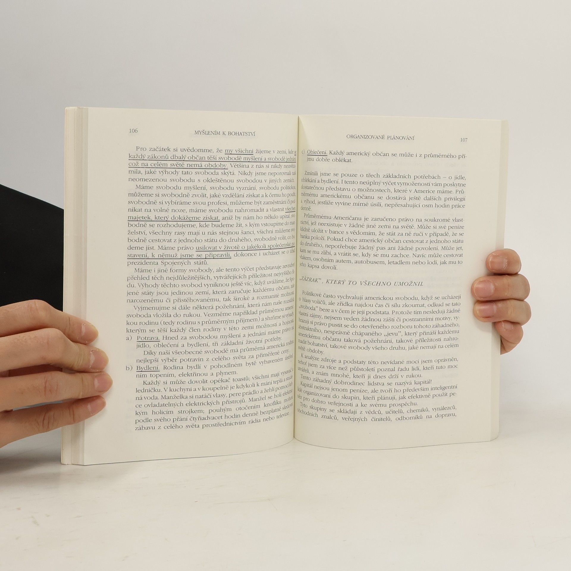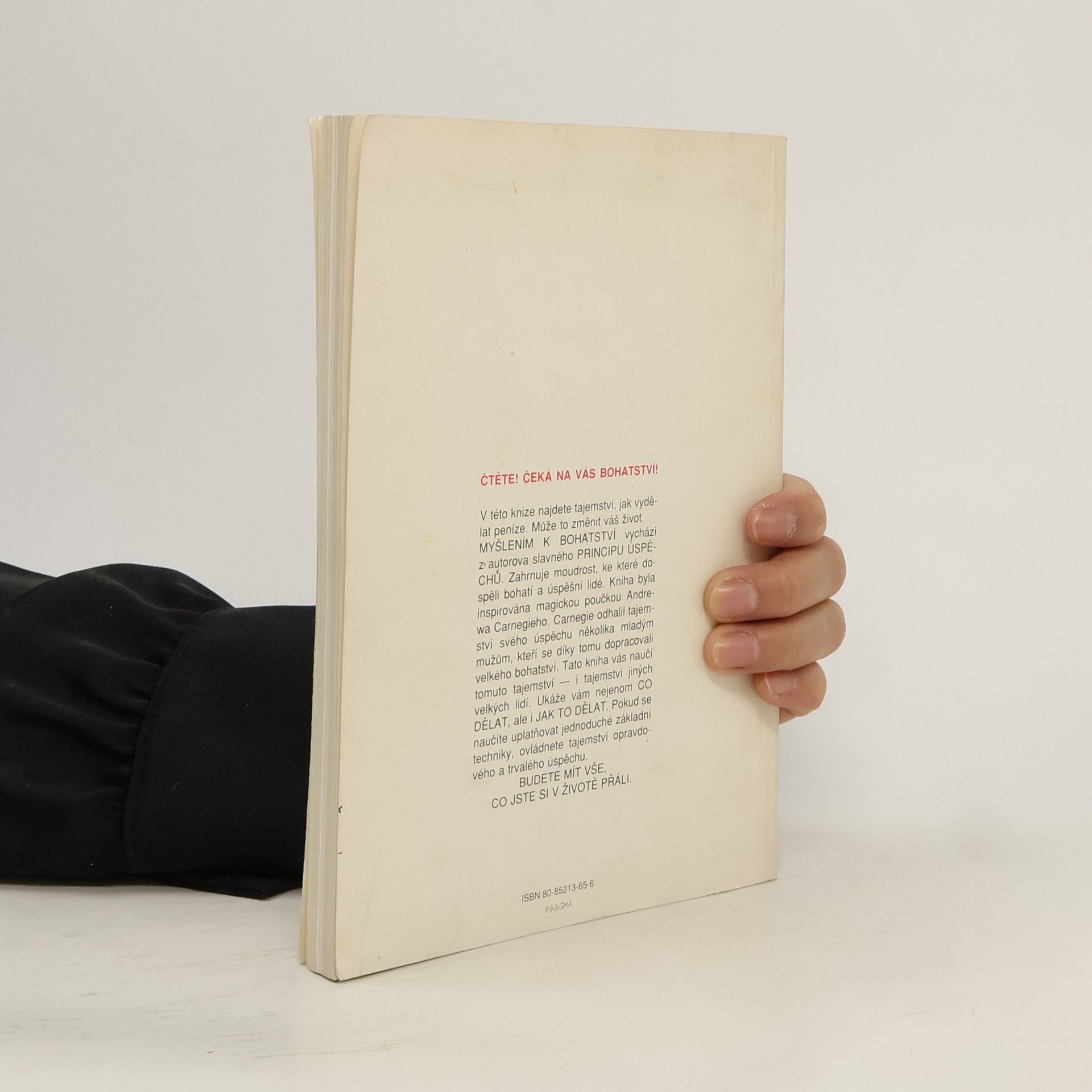 První vydání amerického bestselleru. Kniha nás naučí rozvíjet všechny dobré vlastnosti jako je vůle, rozhodnost, vytrvalost a pevný charakter. Je to návod na bohatství nejenom materiální, ale především bohatství vnitřní. Poukazuje na naše skryté kvality, na náš talent a podává návod, jak ho využít. Dozvíte se, jak si vytvořit správný okruh spolupracovníků, jak podnikat, jak začít, jak vytrvalostí dovést své záměry k úspěšnému konci. Všechno materiální má začátek v myšlence, to je základní idea této knihy od Napoleona Hilla. V této knize najdete tajemství, jak vydělat peníze. Může to změnit váš život. MYŠLENÍM K BOHATSTVÍ vychází z autorova slavného PRINCIPU ÚSPĚCHU. Zahrnuje moudrost, ke které dospěli bohatí a úspěšní lidé. Kniha byla inspirována magickou poučkou Andrewa Carnegieho. Carnegie odhalil tajemství svého úspěchu několika mladým mužům, kteří se díky tomu dopracovali velkého bohatství. Tato kniha vás naučí tomuto tajemství — i tajemství jiných velkých lidí. Ukáže vám nejenom CO DĚLAT, ale i JAK TO DĚLAT. Pokud se naučíte uplatňovat jednoduché základní techniky, ovládnete tajemství opravdového a trvalého úspěchu. BUDETE MÍT VŠE, CO JSTE SI V ŽIVOTĚ PŘÁLI.... celý text