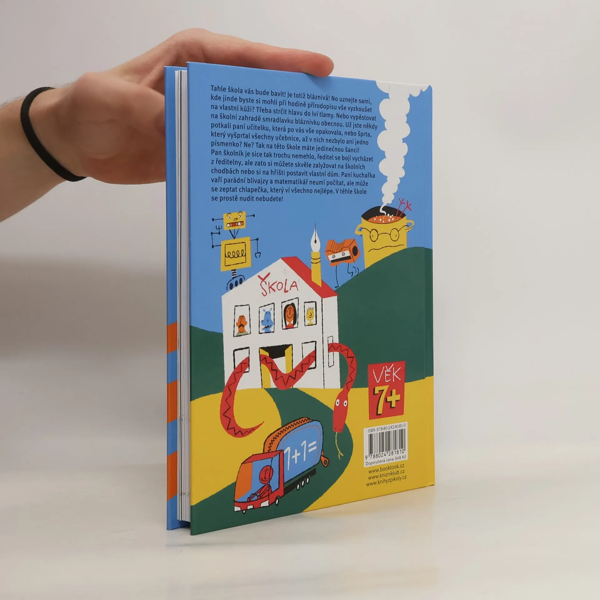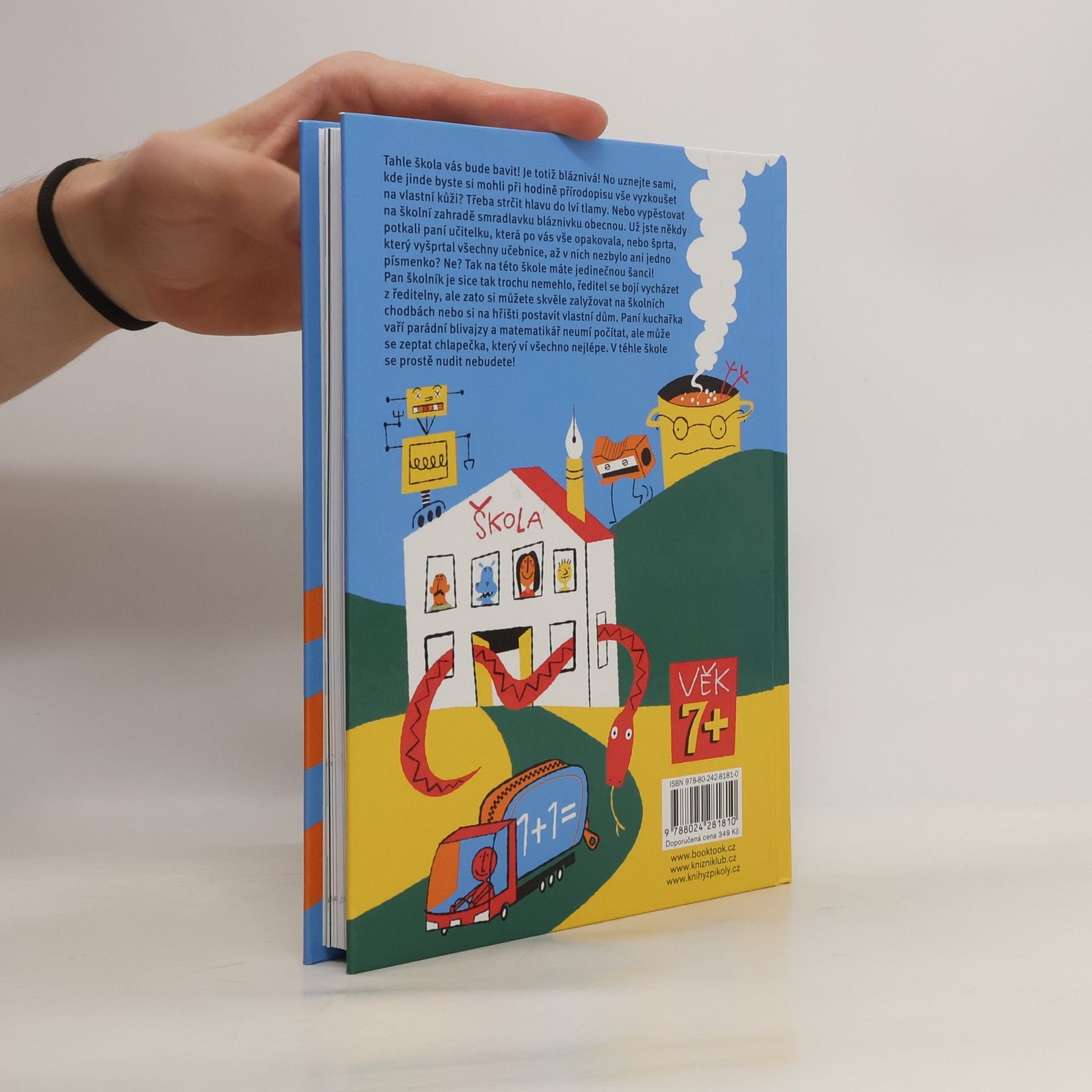 Tahle škola vás bude bavit! Je totiž bláznivá! No uznejte sami, kde jinde byste si mohli při hodině přírodopisu vše vyzkoušet na vlastní kůži? Třeba strčit hlavu do lví tlamy. Nebo vypěstovat na školní zahradě smradlavku bláznivku obecnou. Už jste někdy potkali paní učitelku, která po vás vše opakovala, nebo šprta, který vyšprtal všechny učebnice, až v nich nezbylo ani jedno písmenko? Ne? Tak na této škole máte jedinečnou šanci! Pan školník je sice tak trochu nemehlo, ředitel se bojí vycházet z ředitelny, ale zato si můžete skvěle zalyžovat na školních chodbách nebo si na hřišti postavit vlastní dům. Paní kuchařka vaří parádní blivajzy a matematikář neumí počítat, ale může se zeptat chlapečka, který ví všechno nejlépe. V téhle škole se prostě nudit nebudete! Pro děti od 7 let.