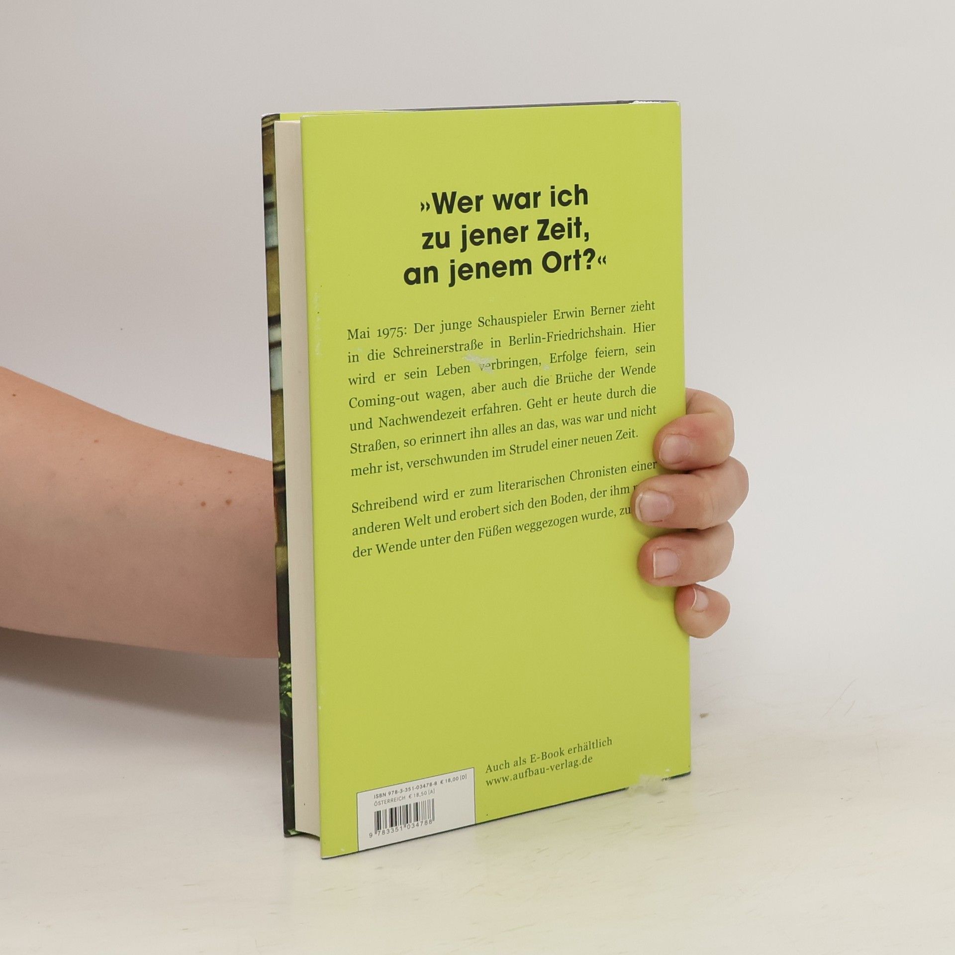 „Wer war ich zu jener Zeit, an jenem Ort?“.Mai 1975: Der junge Schauspieler Erwin Berner zieht in die Schreinerstraße in Friedrichshain. Hier wird er sein Leben verbringen, Erfolge feiern, sein Coming Out erleben, aber auch die Brüche der Wende und Nachwendezeit erfahren. Geht er heute durch die Straßen, tritt er in seine Wohnung, so erinnert ihn alles an das, was war und nicht mehr ist, verschwunden im Strudel einer neuen Zeit. Schreibend wird er zum literarischen Chronisten einer anderen Welt und erobert sich den Boden, der ihm nach der Wende in Berlin unter den Füßen weggezogen wurde, zurück.Es sind Bilder einer Stadt und eines Lebens, die in der Erinnerung Gestalt annehmen und sich wie ein Schattenspiel über die Oberfläche des Hier und Jetzt schieben. Mit seiner Biografie schreibt sich Erwin Berner eindringlich in die Veränderungen einer Stadtlandschaft ein.