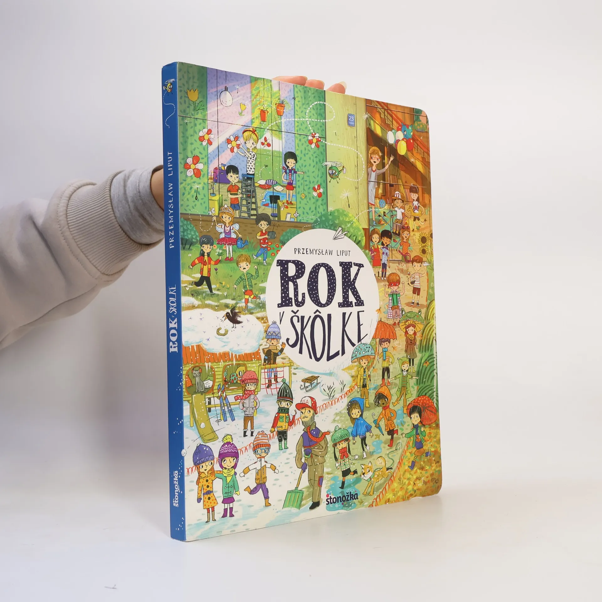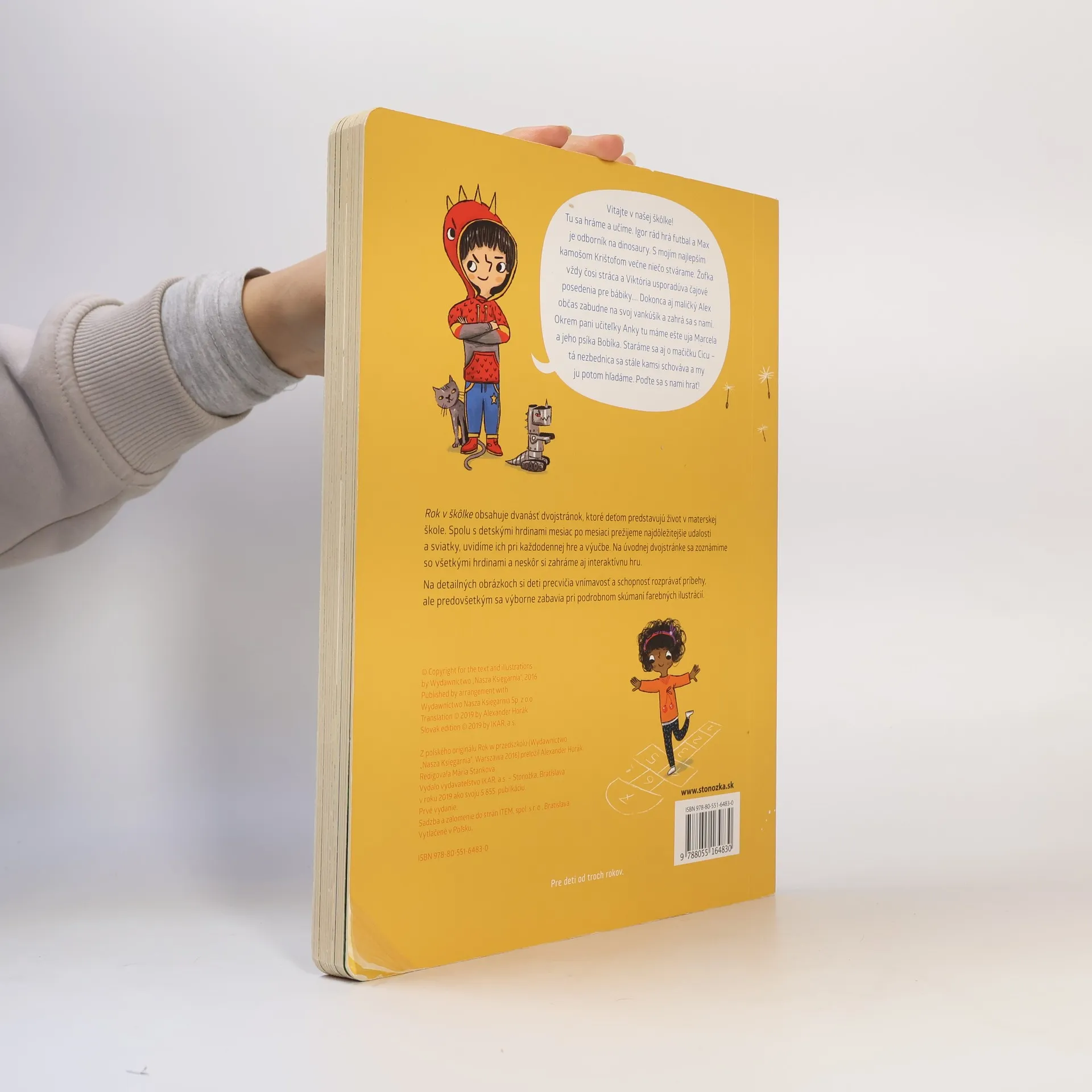 Vitajte v našej škôlke! Tu sa hráme a učíme. Igor rád hrá futbal a Max je odborník na dinosaury. S mojím najlepším kamošom Krištofom večne niečo stvárame. Žofka vždy niečo stráca a Viktória usporadúva čajové posedenia pre bábiky.... Dokonca aj maličký Alex občas zabudne na svoj vankúšik a zahrá sa s nami. Okrem pani učiteľky Anky tu máme ešte uja Marcela a jeho psíka Bobíka. Staráme sa aj o mačičku Cicu – tá nezbednica sa stále kamsi schováva a my ju potom hľadáme. Poďte sa s nami hrať! Rok v škôlke obsahuje dvanásť dvojstránok, ktoré deťom predstavujú život v materskej škole. Spolu s detskými hrdinami mesiac po mesiaci prežijeme najdôležitejšie udalosti a sviatky, uvidíme ich pri každodennej hre a výučbe. Na úvodnej dvojstránke sa zoznámime so všetkými hrdinami a neskôr si zahráme aj interaktívnu hru. Na detailných obrázkoch si deti precvičia vnímavosť a schopnosť rozprávať príbehy, ale predovšetkým sa výborne zabavia pri podrobnom skúmaní farebných ilustrácií.