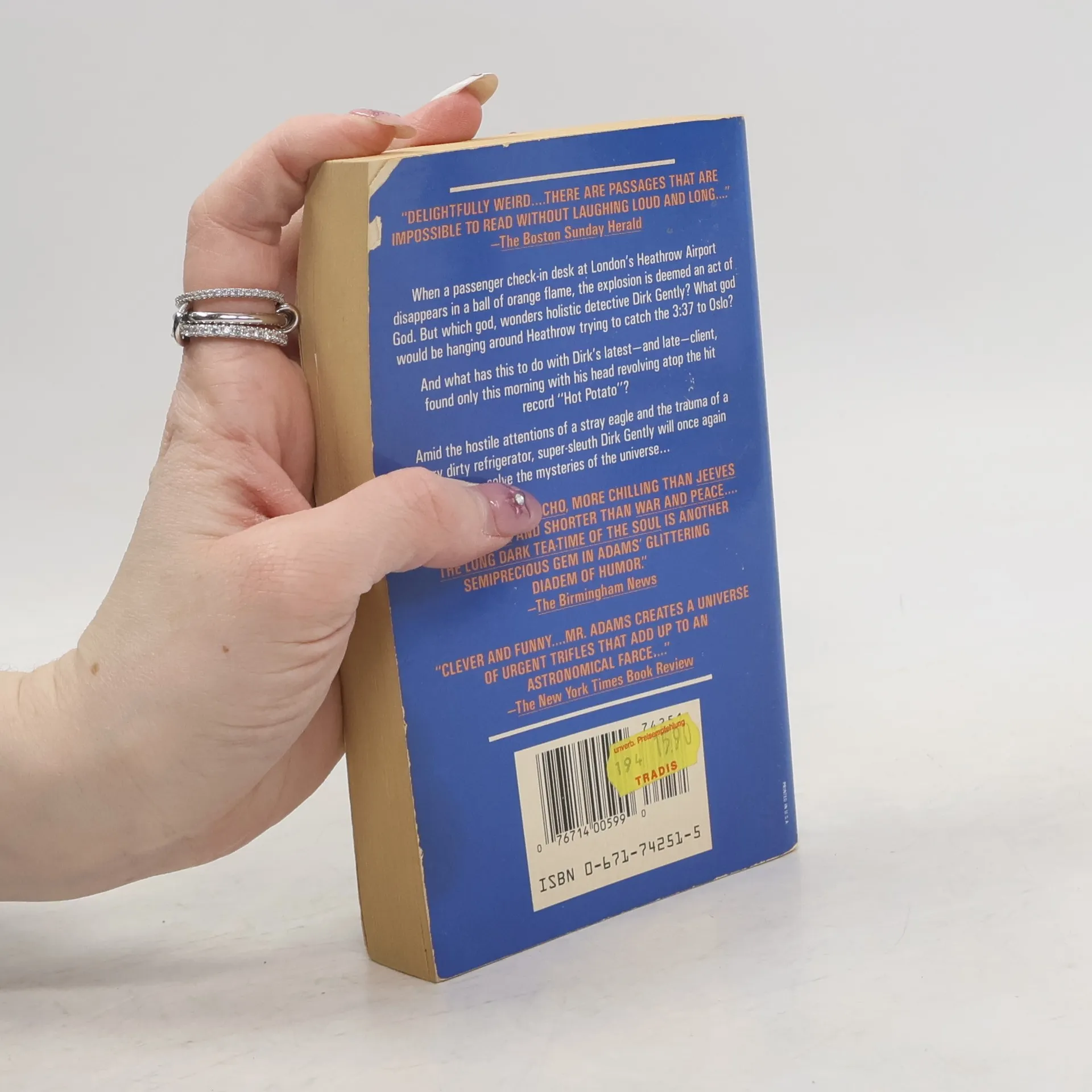 When a passenger check-in desk at London's Heathrow Airport disappears in a ball of orange flame, the explosion is deemed an act of God. But which god, wonders holistic detective Dirk Gently? What god would be hanging around Heathrow trying to catch the 3:37 to Oslo? And what has this to do with Dirk's latest--and late-- client, found only this morning with his head revolving atop the hit record "Hot Potato"? Amid the hostile attentions of a stray eagle and the trauma of a very dirty refrigerator, super-sleuth Dirk Gently will once again solve the mysteries of the universe...
