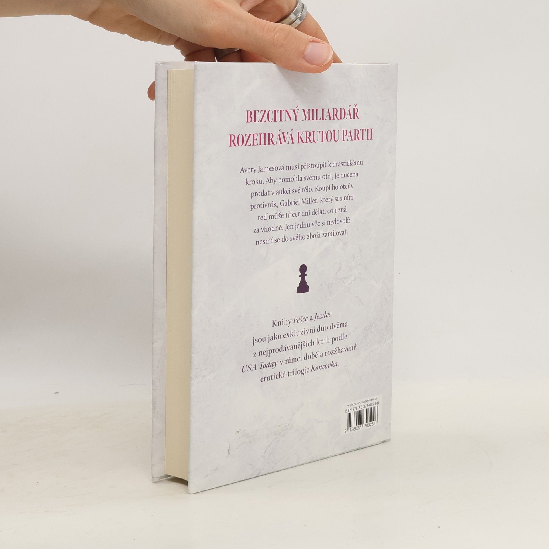 Bezcitný miliardář odhodlaný dosáhnout své pomsty. Žena, která může ztratit víc než jen své panenství. A smyslná hra, která je oba zlomí. Gabriel Miller ji vyhraje v aukci a má třicet dní na to, aby si s jejím tělem dělal, co chce. Ona nemá jinou volbu, než se poddat jeho vůli, přestože ví, že je to muž, který zničil jejího otce, a který v první řadě může za to, že se musí prodávat v aukci jako dobytek. Zachrání ji bývalý snoubenec? Přijede pro ni jako rytíř na bílém koni? Nebo dobrý rodinný přítel, kterého vždycky považovala za hodného strýčka, ale který v ní vidí smyslnou ženu a nabídne jí manželství? Nebo se stane nějaký zázrak a její uchvatitel se nad ní smiluje a nechá ji jít? To sotva, protože ona je všechno, po čem kdy toužil. Může si užít každičký kousíček jí, ale nesmí se do ní zamilovat. Bez ohledu na to, jak sladce se mu poddává. Jenomže jeho předsevzetí velice záhy bere za své. Poznámka autorky: Pěšec a Rytíř jsou exkluzivní duo zahrnující dvě z nejprodávanějších knih podle USA Today v rámci do běla rozžhavené série Endgame.