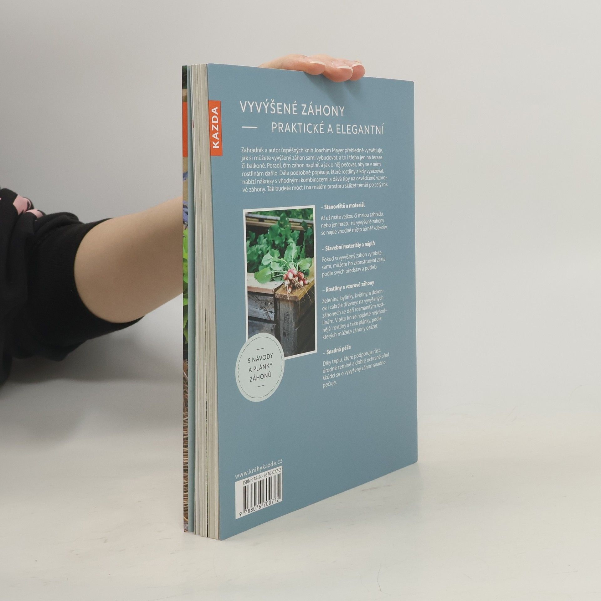 Zahradník a autor úspěšných knih Joachim Mayer přehledně vysvětluje, jak si můžete vyvýšený záhon sami vybudovat, a to i třeba jen na terase či balkoně. Poradí, čím záhon naplnit a jak o něj pečovat, aby se v něm rostlinám dařilo. Dále podrobně popisuje, které rostliny a kdy vysazovat, nabízí nákresy s vhodnými kombinacemi a dává tipy na osvědčené vzorové záhony. Tak budete moct i na malém prostoru sklízet téměř po celý rok. Stanoviště a materiál Ať už máte velkou či malou zahradu, nebo jen terasu, na vyvýšené záhony se najde vhodné místo téměř kdekoliv. Stavební materiály a náplň Pokud si vyvýšený záhon vyrobíte sami, můžete ho zkonstruovat zcela podle svých představ a potřeb. Rostliny a vzorové záhony Zelenina, bylinky, květiny, a dokonce i zakrslé dřeviny: na vyvýšených záhonech se daří rozmanitým rostlinám. V této knize najdete nejvhodnější rostliny a také plánky, podle kterých můžete záhony osázet. Snadná péče Díky teplu, které podporuje růst, úrodné zemině a dobré ochraně před škůdci se o vyvýšený záhon snadno pečuje.