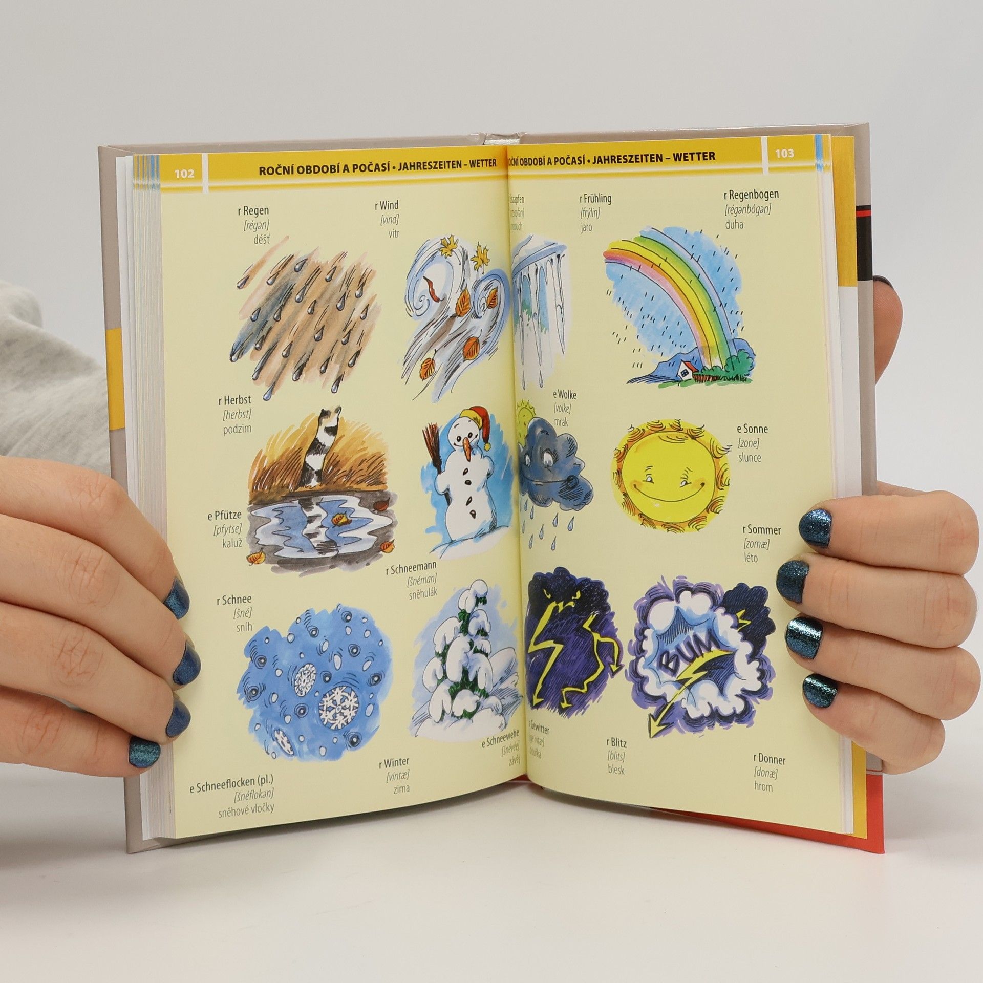 Ilustrovaný slovník znázorňující běžné životní situace, postavy, věci ap. k procvičování německých slovíček určený začátečníkům, zejména dětem. U každého slova je uveden fonetický přepis výslovnosti a český překlad. Každý tematický celek je doplněn jednoduchými frázemi. V závěru knihy je česko-německý slovník slov vyskytujících se na obrázcích.
