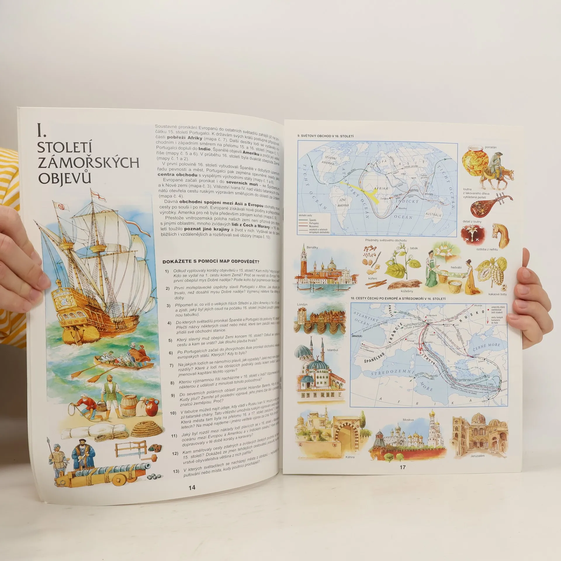 Další z ucelené řady sešitových atlasů pro ZŠ a víceletá gymnázia přináší detailní mapové zpracování dějin od zámořských plaveb do poloviny 18. století. Na úvod jsou v praktickém přehledu znázorněny nejdůležitější objevy lidského umu a poznání, následuje podkapitola o zámořských objevech, doplněna medailony významných mořeplavců a objevitelů a časová přímka důležitých historických událostí. Mapová část obsahuje stručnou charakteristiku daného období, pracovní otázky pro samostatnou práci žáků a názorné vícebarevné mapy doplněné barevnými ilustracemi předmětů, architektury, umění a způsobu života. Mapy znázorňují nejen územní a politický vývoj, zaměřují se také na ostatní lidské činnosti, kulturu, zemědělství, výrobu, cestování. Každá kapitola je opět uvedena textovou částí. Titul je doplněn výběrovým rejstříkem názvů. Atlas je opatřen
