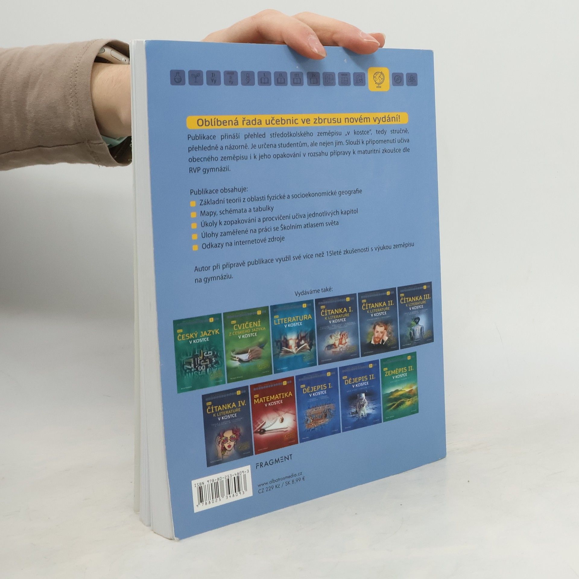 Oblíbená řada učebnic ve zbrusu novém vydání! Publikace přináší přehled středoškolského zeměpisu „v kostce“, tedy stručně, přehledně a názorně. Je určena studentům, ale nejen jim. Slouží k připomenutí učiva obecného zeměpisu i k jeho opakování v rozsahu přípravy k maturitní zkoušce dle RVP gymnázií. Publikace obsahuje: Základní teorii z oblasti fyzické a socioekonomické geografie Mapy, schémata a tabulky Úkoly k zopakování a procvičení učiva jednotlivých kapitol Úlohy zaměřené na práci se Školním atlasem světa Odkazy na internetové zdroje Autor při přípravě publikace využil své více než 15leté zkušenosti s výukou zeměpisu na gymnáziu.