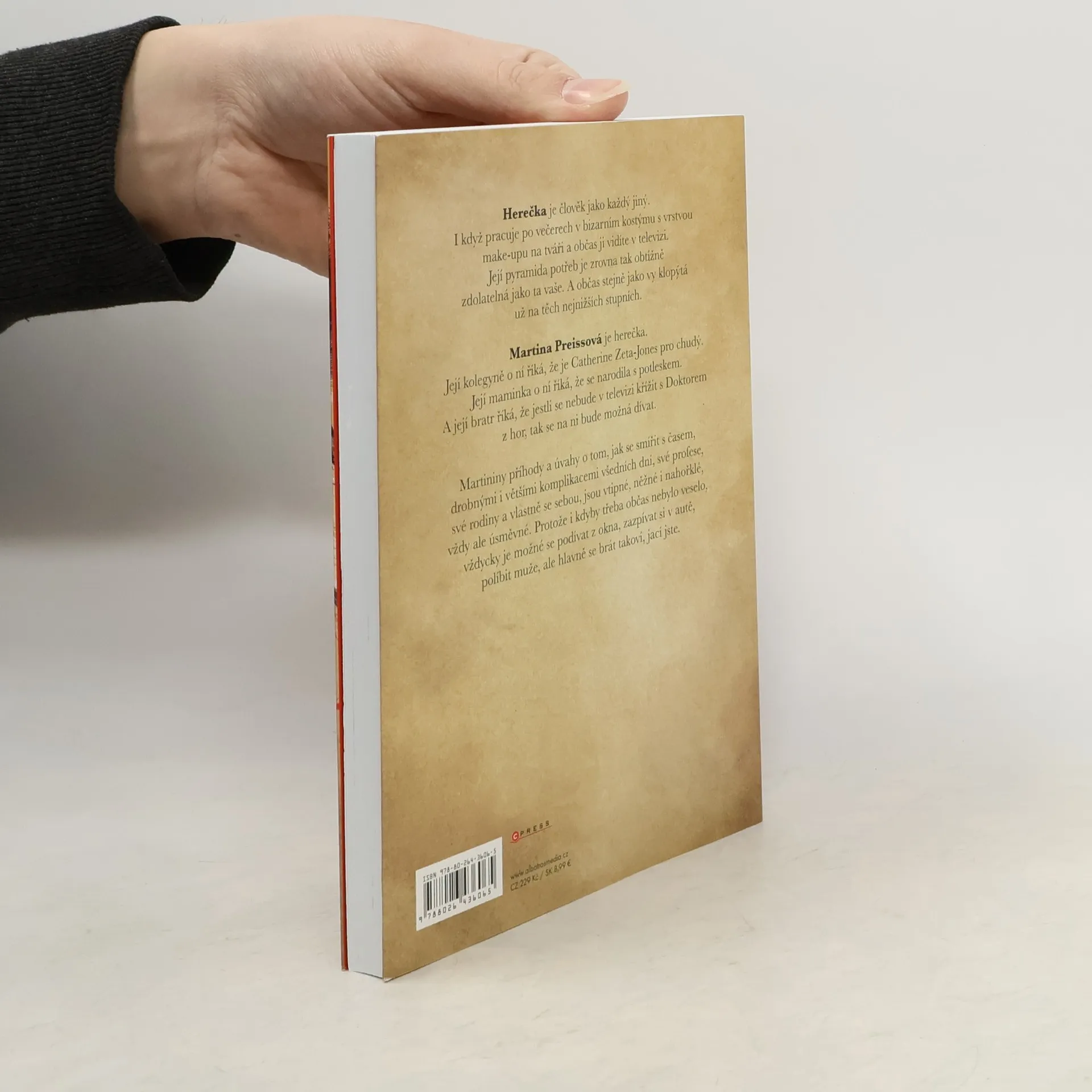 Ste hérečka?! A kerá? Herečka je člověk jako každý jiný. I když pracuje po večerech v bizarním kostýmu s vrstvou make-upu na tváři a občas ji vidíte v televizi. Její pyramida potřeb je zrovna tak obtížně zdolatelná jako ta vaše. A občas stejně jako vy klopýtá už na těch nejnižších stupních. Martina Preissová je herečka. Její kolegyně o ní říká, že je Catherine Zeta Jones pro chudý. Její maminka o ní říká, že se narodila s potleskem. A její bratr jí říká, že jestli se v televizi v osm nebude křížit s Doktorem z hor, tak se na ni bude možná dívat. Martininy příhody a úvahy o tom, jak se smířit s časem, drobnými i většími komplikacemi všedních dní, své profese, své rodiny, a vlastně se sebou, jsou vtipné, něžné i nahořklé, vždy ale úsměvné. Protože i kdyby třeba občas nebylo veselo, vždycky je možné podívat se z okna, zazpívat si v autě, políbit muže, ale hlavně se brát takoví, jací jste.