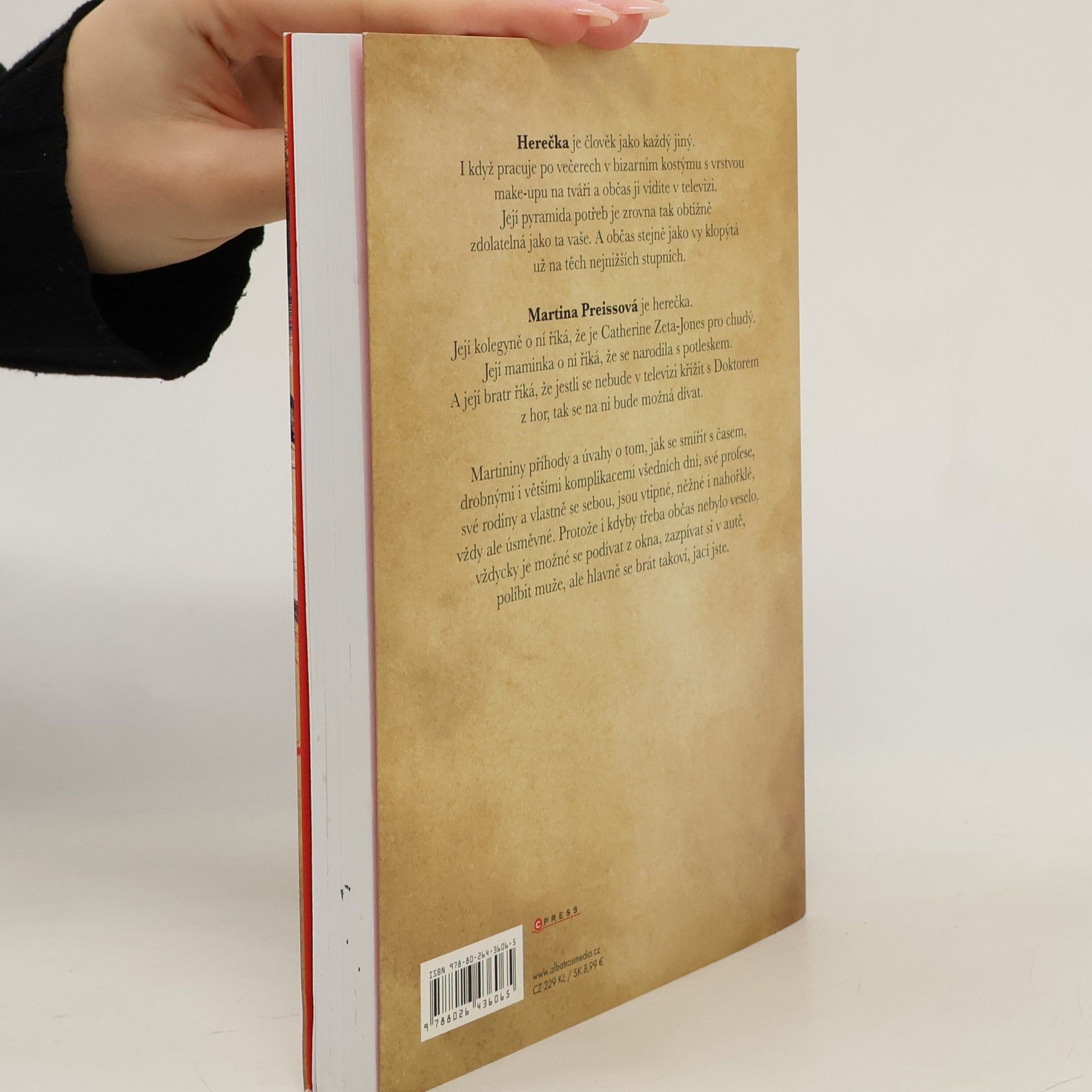Ste hérečka?! A kerá? Herečka je člověk jako každý jiný. I když pracuje po večerech v bizarním kostýmu s vrstvou make-upu na tváři a občas ji vidíte v televizi. Její pyramida potřeb je zrovna tak obtížně zdolatelná jako ta vaše. A občas stejně jako vy klopýtá už na těch nejnižších stupních. Martina Preissová je herečka. Její kolegyně o ní říká, že je Catherine Zeta Jones pro chudý. Její maminka o ní říká, že se narodila s potleskem. A její bratr jí říká, že jestli se v televizi v osm nebude křížit s Doktorem z hor, tak se na ni bude možná dívat. Martininy příhody a úvahy o tom, jak se smířit s časem, drobnými i většími komplikacemi všedních dní, své profese, své rodiny, a vlastně se sebou, jsou vtipné, něžné i nahořklé, vždy ale úsměvné. Protože i kdyby třeba občas nebylo veselo, vždycky je možné podívat se z okna, zazpívat si v autě, políbit muže, ale hlavně se brát takoví, jací jste.