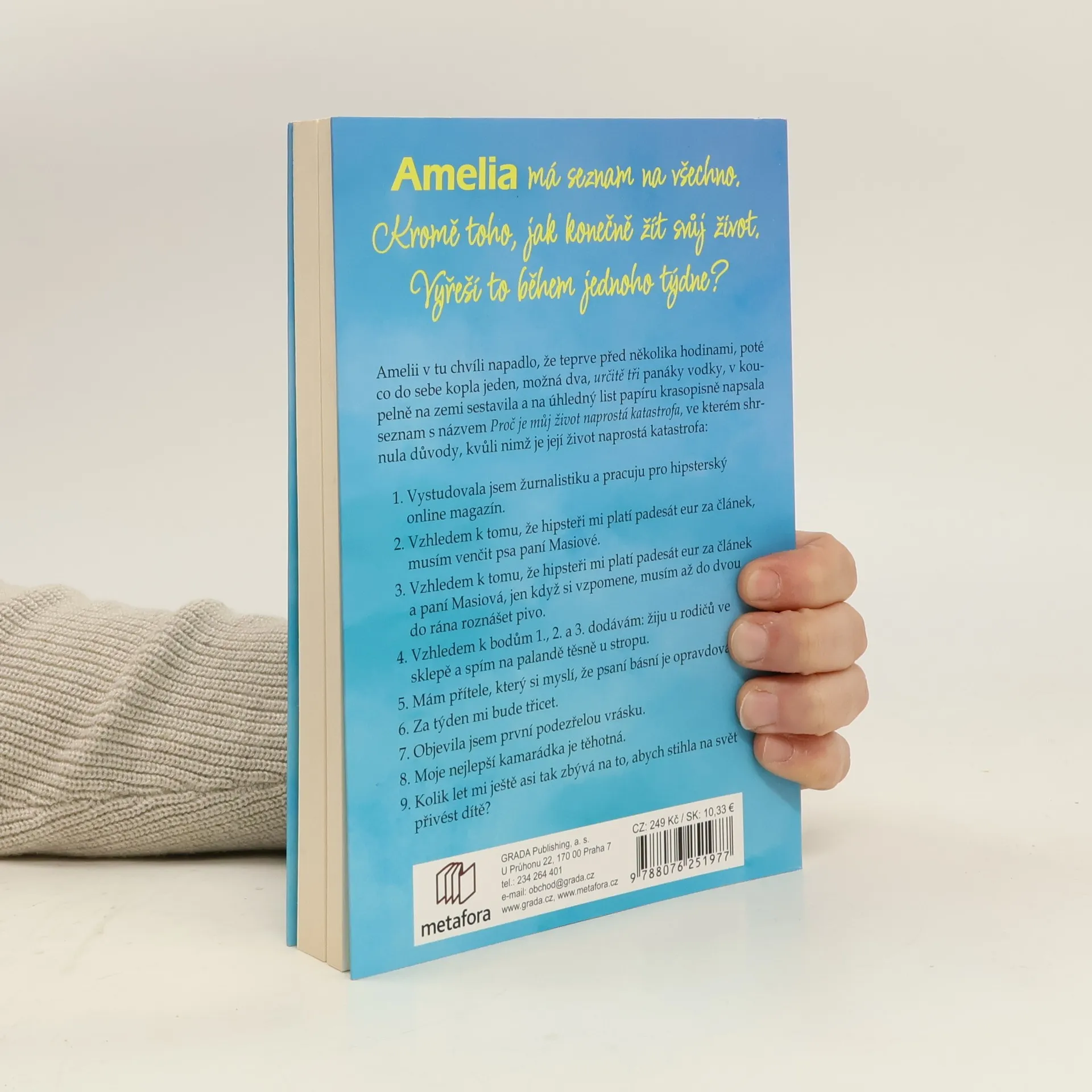 Amelia, pilná a zodpovědná mladá žena, se blíží ke svým třicátým narozeninám a její život je plný frustrací. Sestavuje seznam svých neúspěchů, který zahrnuje bydlení u rodičů ve sklepě, psaní článků pro hipsterský magazín s nízkým platem a venčení psa sousedky. Pracuje také jako číšnice v baru pro opilé teenagery. Zatímco její přátelé budují kariéry, zakládají rodiny a kupují domy, ona se cítí ztracená. Její přítel, chudý básník, žije u matky a neplánuje změnu. Amelia nachází oporu u čtyř důchodců, se kterými se spřátelila při venčení psa, a jejich rady jí pomáhají v existenciálních otázkách. K tomu všemu jí šéfredaktor magazínu dává poslední šanci napsat úspěšný článek o 28 800 plastových kachničkách, které se dostaly do oceánu po námořní katastrofě. Má na to sedm dní, během nichž musí napsat nejlepší článek své kariéry, zjistit, zda je zamilovaná, a rozhodnout se, co skutečně chce od života. Čelí otázce, zda se dál topit v problémech, nebo se odvážit a nechat se unášet proudem.