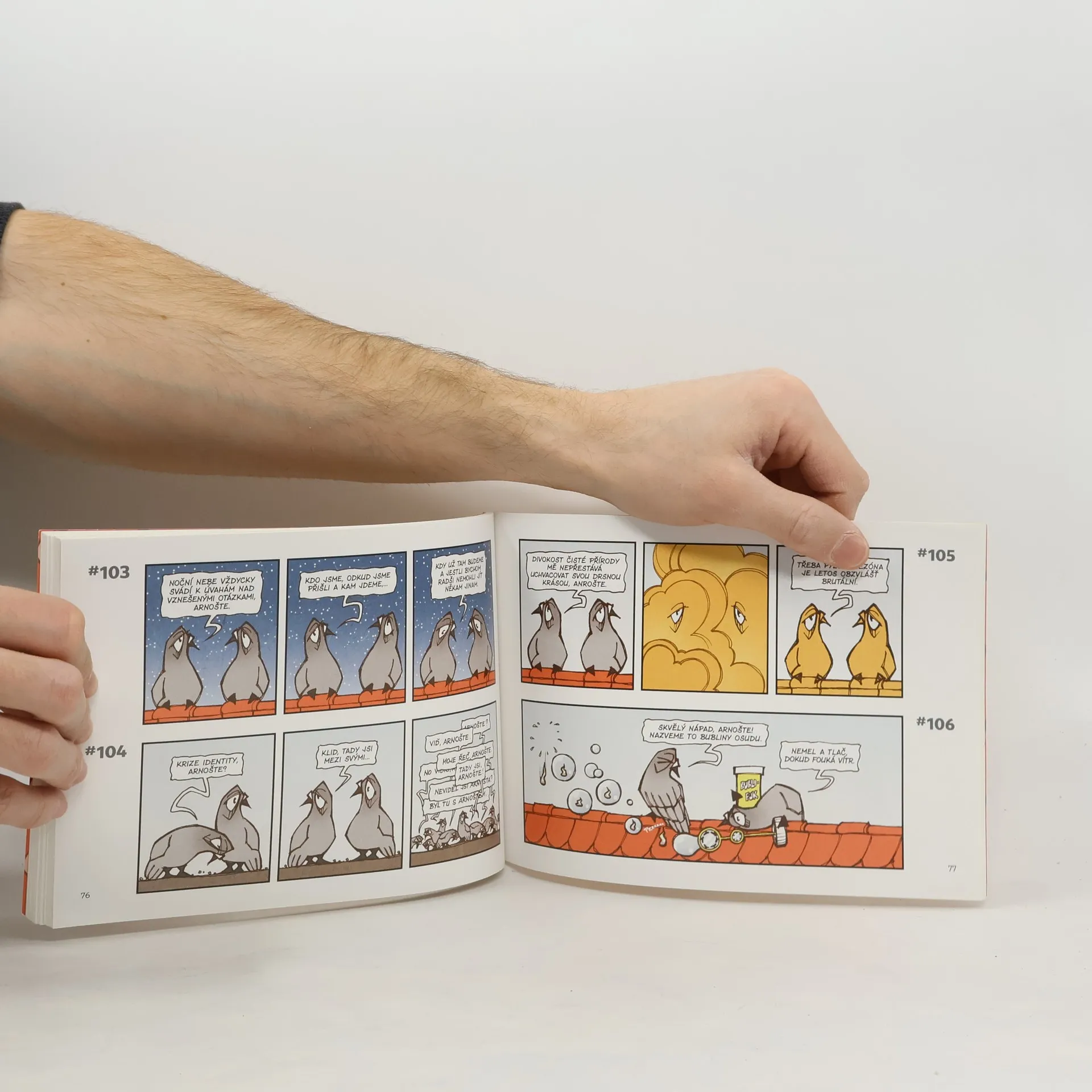 Strip Arnošti, který vychází v časopise Nový Prostor již od roku 2013, vypráví příběhy dvou poťouchlých holubů.