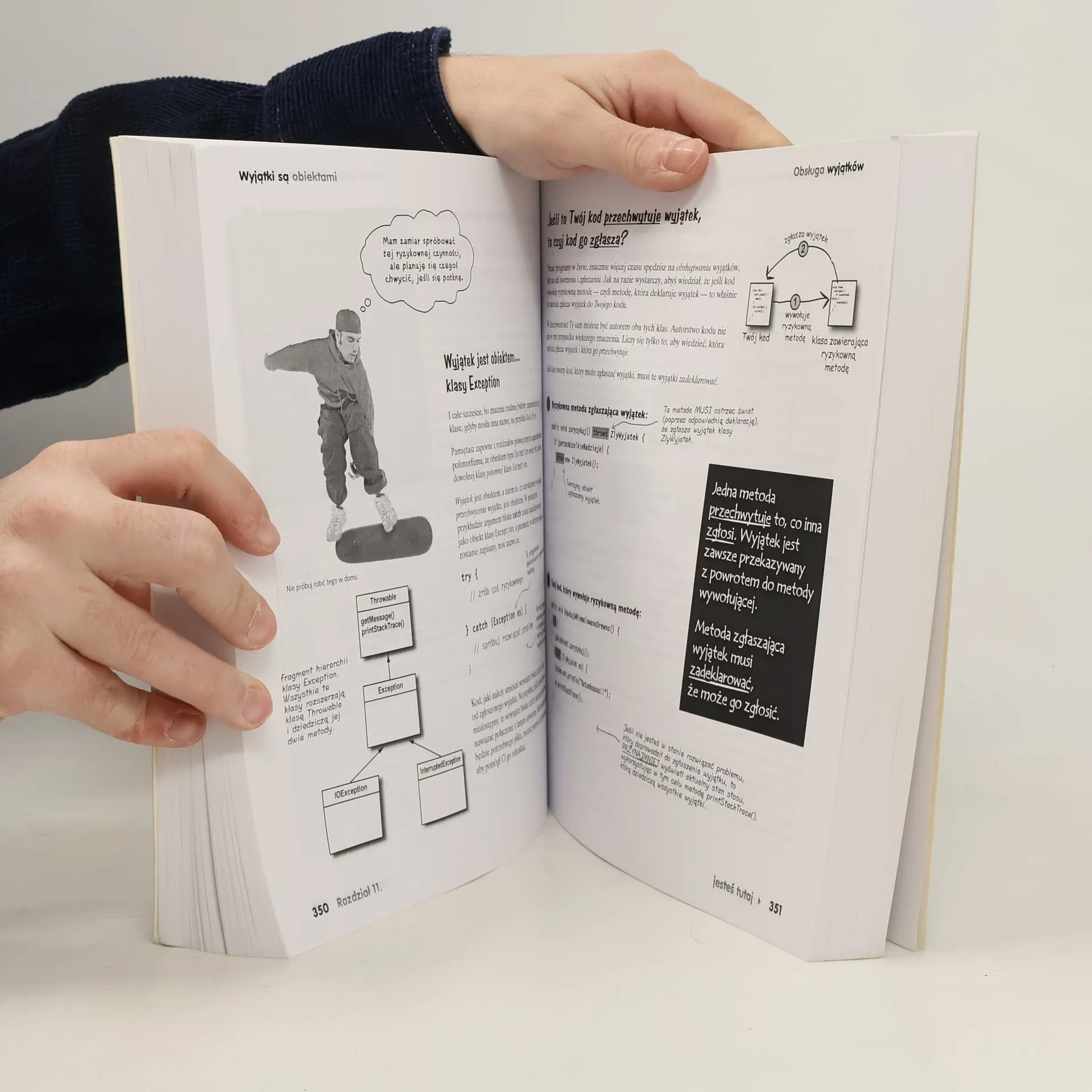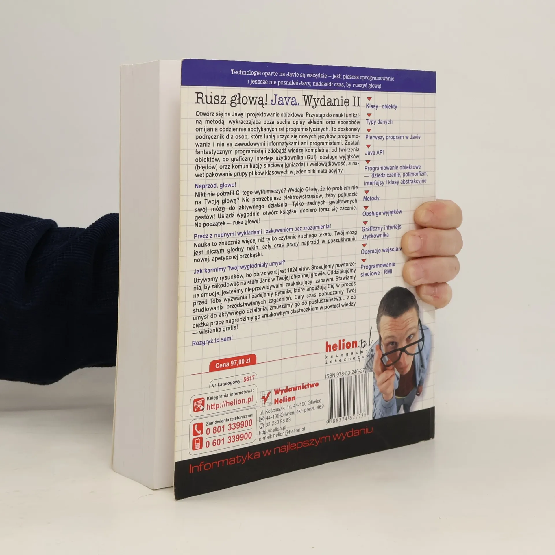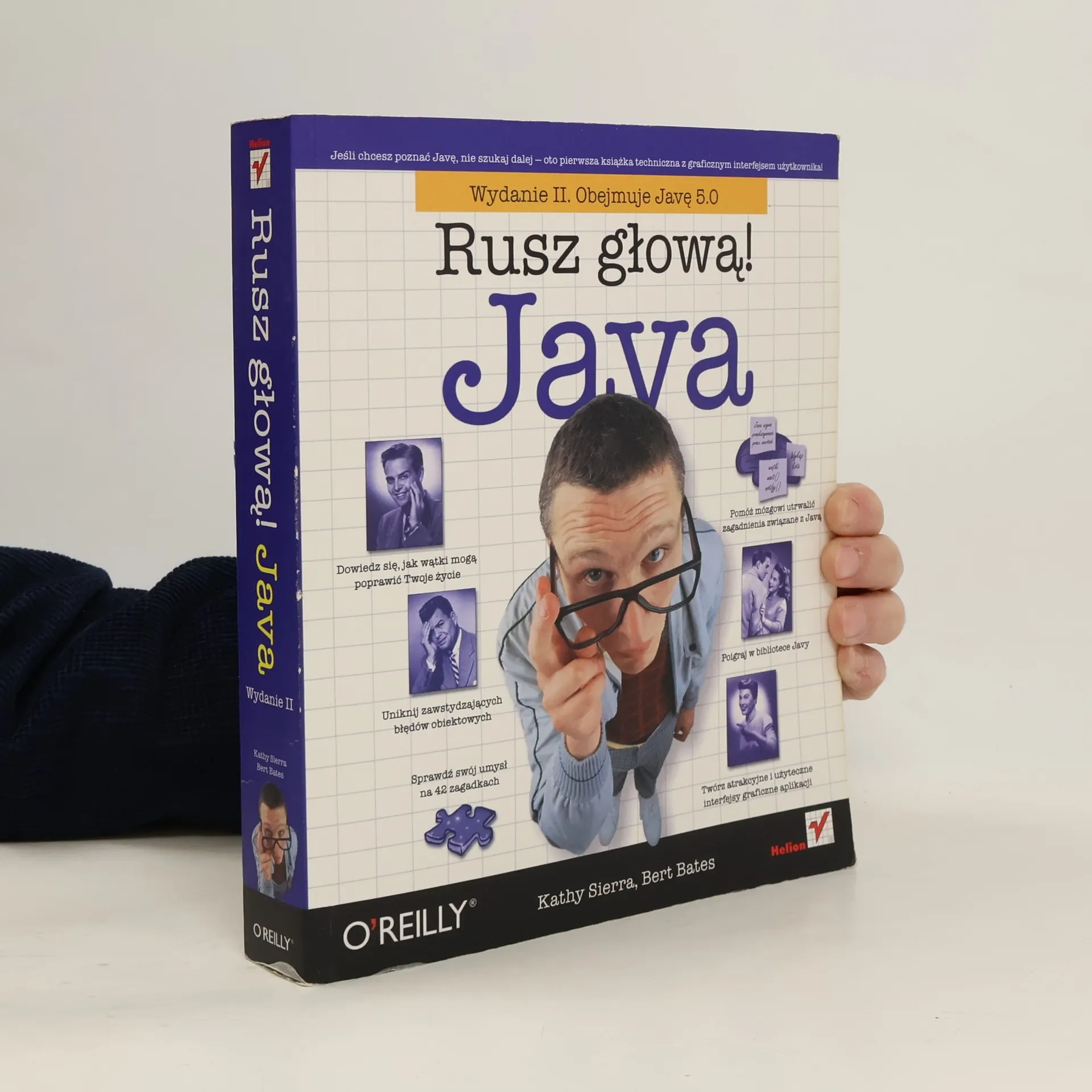 Jeśli chcesz poznać Javę, nie szukaj dalej — oto pierwsza książka techniczna z graficznym interfejsem użytkownika! Obejmuje Javę 5.0 Technologie oparte na Javie są wszędzie — jeśli piszesz oprogramowanie i jeszcze nie poznałeś Javy, nadszedł czas, by ruszyć głową! Otwórz się na Javę i projektowanie obiektowe. Przystąp do nauki unikalną metodą, wykraczającą poza suche opisy składni oraz sposobów omijania codziennie spotykanych raf programistycznych. To doskonały podręcznik dla osób, które lubią uczyć się nowych języków programowania i nie mają wykształcenia informatycznego lub programistycznego. Zostań fantastycznym programistą i zdobądź wiedzę kompletną: od tworzenia obiektów, po graficzny interfejs użytkownika (GUI), obsługę wyjątków (błędów) oraz komunikację sieciową (gniazda) i wielowątkowość, a nawet pakowanie grupy plików klasowych w jeden plik instalacyjny. Naprzód, głowo! Nikt ci tego nie potrafił wytłumaczyć? Wydaje Ci się, że to problem nie na Twoją głowę? Nie potrzebujesz elektrowstrząsów, żeby pobudzić swój mózg do aktywnego działania. Tylko żadnych gwałtownych gestów! Usiądź wygodnie, otwórz książkę, dopiero teraz się zacznie. Na początek — rusz głową! Precz z nudnymi wykładami i zakuwaniem bez zrozumienia! Nauka to znacznie więcej niż tylko czytanie suchego tekstu. Twój mózg jest niczym głodny rekin, cały czas prący naprzód w poszukiwaniu nowej, apetycznej przekąski. Jak karmimy Twój wygłodniały umysł? Używamy rysunków, bo obraz wart jest 1024 słów. Stosujemy powtórzenia, by zakodować na stałe dane w Twojej chłonnej głowie. Oddziałujemy na emocje, jesteśmy nieprzewidywalni, zaskakujący i zabawni. Stawiamy przed Tobą wyzwania i zadajemy pytania, które angażują Cię w proces studiowania przedstawianych zagadnień. Cały czas pobudzamy Twój umysł do aktywnego działania, zmuszamy go do posłuszeństwa… a za ciężką pracę nagrodzimy go smakowitym ciasteczkiem w postaci wiedzy — wisienka gratis! Rozgryź to sam! Klasy i obiekty Typy danych Pierwszy program w Javie Java API Programowanie obiektowe — dziedziczenie, polimorfizm, interfejsy i klasy abstrakcyjne Metody Obsługa wyjątków Graficzny interfejs użytkownika Operacje wejścia-wyjścia Programowanie sieciowe i RMI