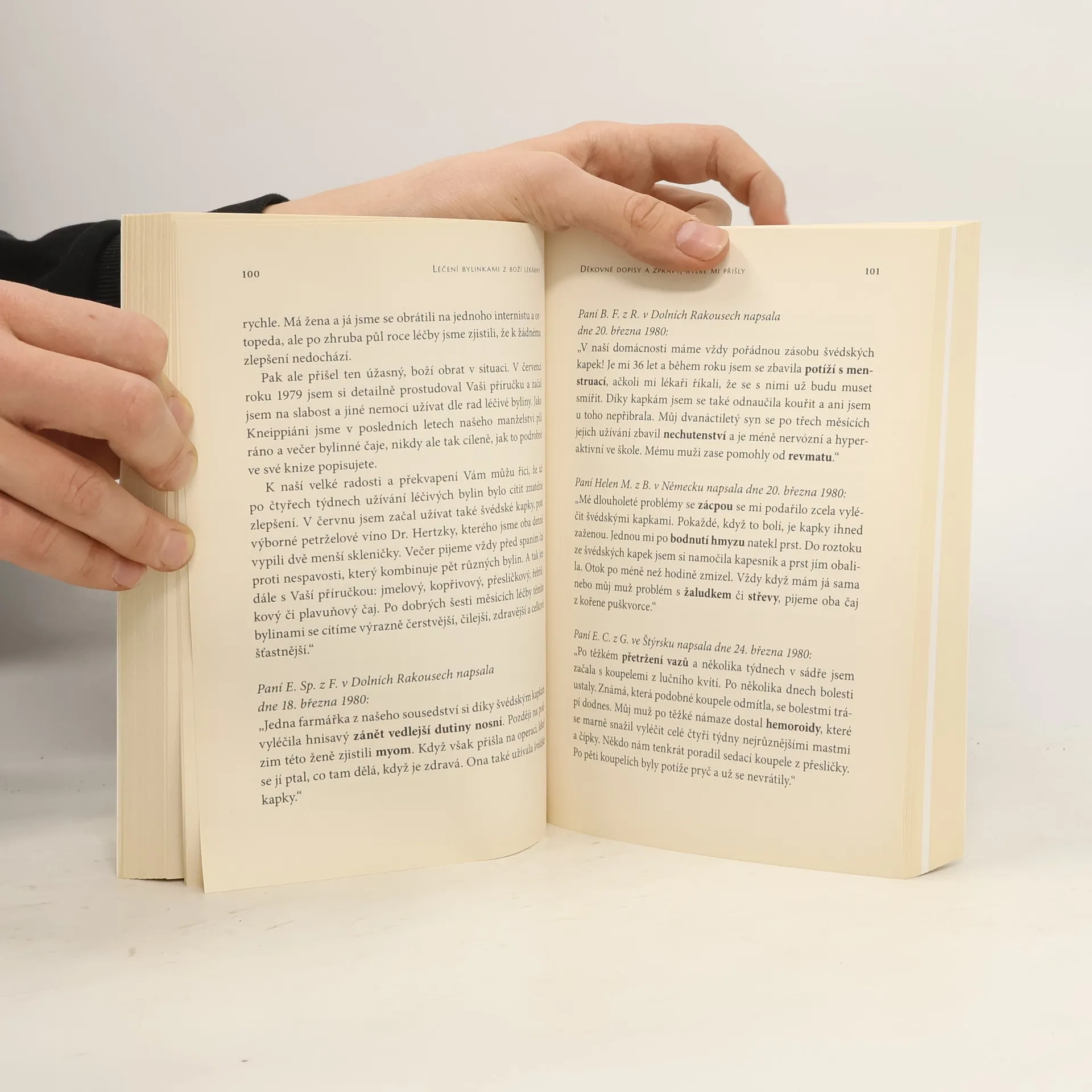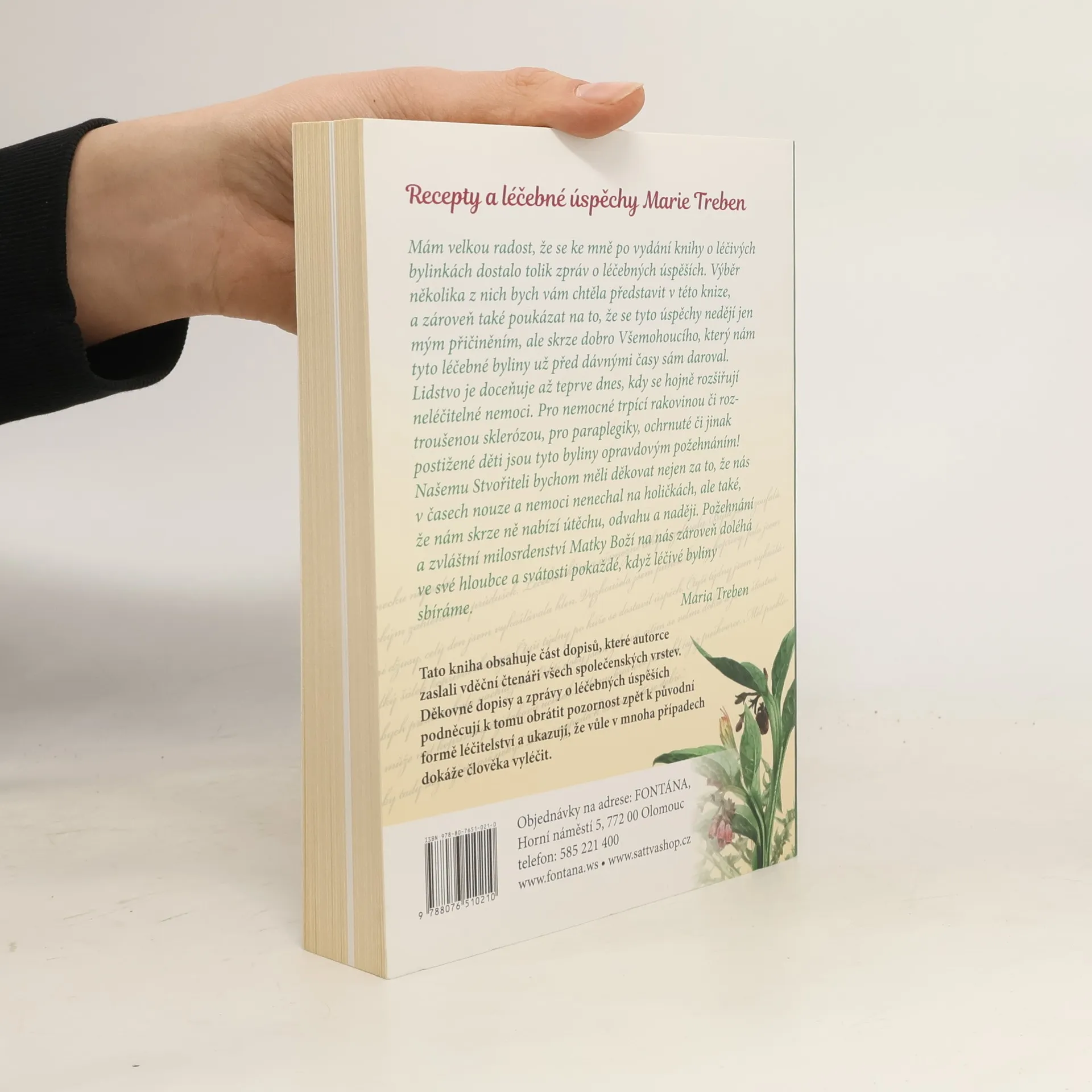 Recepty a léčebné úspěchy Marie Treben Mám velkou radost, že se ke mně po vydání knihy o léčivých bylinkách dostalo tolik zpráv o léčebných úspěších. Výběr několika z nich bych vám chtěla představit v této knize, a zároveň také poukázat na to, že se tyto úspěchy nedějí jen mým přičiněním, ale skrze dobro Všemohoucího, který nám tyto léčebné byliny už před dávnými časy sám daroval. Lidstvo je doceňuje až teprve dnes, kdy se hojně rozšiřují neléčitelné nemoci. Pro nemocné trpící rakovinou či roztroušenou sklerózou, pro paraplegiky, ochrnuté či jinak postižené děti jsou tyto byliny opravdovým požehnáním! Našemu Stvořiteli bychom měli děkovat nejen za to, že nás v časech nouze a nemoci nenechal na holičkách, ale také, že nám skrze ně nabízí útěchu, odvahu a naději. Požehnání a zvláštní milosrdenství Matky Boží na nás zároveň doléhá ve své hloubce a svátosti pokaždé, když léčivé byliny sbíráme. Tato kniha obsahuje část dopisů, které autorce zaslali vděční čtenáři všech společenských vrstev. Děkovné dopisy a zprávy o léčebných úspěších podněcují k tomu obrátit pozornost zpět k původní formě léčitelství a ukazují, že vůle v mnoha případech dokáže člověka vyléčit.