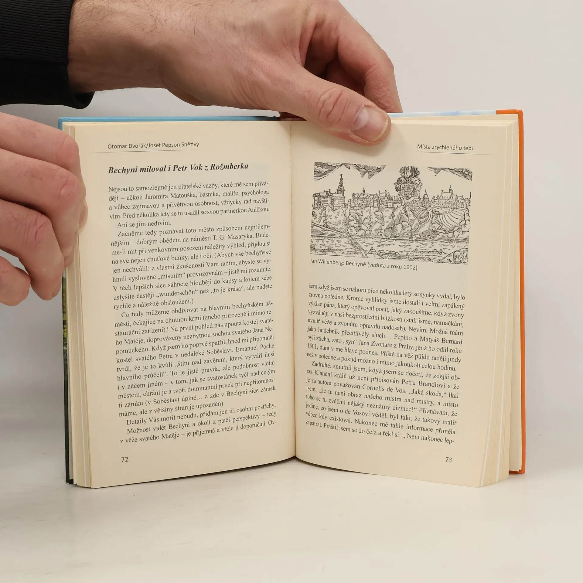 Zkušení cestovatelé a spisovatelé Otomar Dvořák a Josef Pepson Snětivý v knize Místa zrychleného tepu odkrývají „skrytou krásu“, která často zůstává ve stínu známějších památek nebo je skryta pod zemí. Jejich cílem je upozornit na místa, jež si zaslouží pozornost nejen pro svou unikátnost, ale také pro jejich nádheru. Výběr lokalit byl ovlivněn subjektivním pocitem, který na ně místo vyvolalo, ať už pozitivním nebo temnějším historickým pozadím. Publikace prozkoumává tajemství obce Pičín s málo známými památkami a navštíví Komárov, kde se setkají s neobyčejnou ženou. V Praze pak čtenáři zažijí návštěvu dvou Zlatých uliček a během výletu objeví místa v Břevnově a Střešovicích. Následuje cesta na sever do Mimoně, kde objevují sakrální areály a fascinující podzemí. Proti tmavému „podsvětí“ se postaví putování mezi Lužnicí a Vltavou za dvěma jižními hvězdami – Bechyni a Týnem nad Vltavou, zakončené krvavou tečkou v Branovicích. Na závěr se čtenáři vydají s průvodcem Miloněm Čepelkou do malebného Opočna a méně známé obce Přepychy, kde je čekají zajímavosti a místní speciality. Kniha je IV. svazkem edice Skrytá krása naší země.