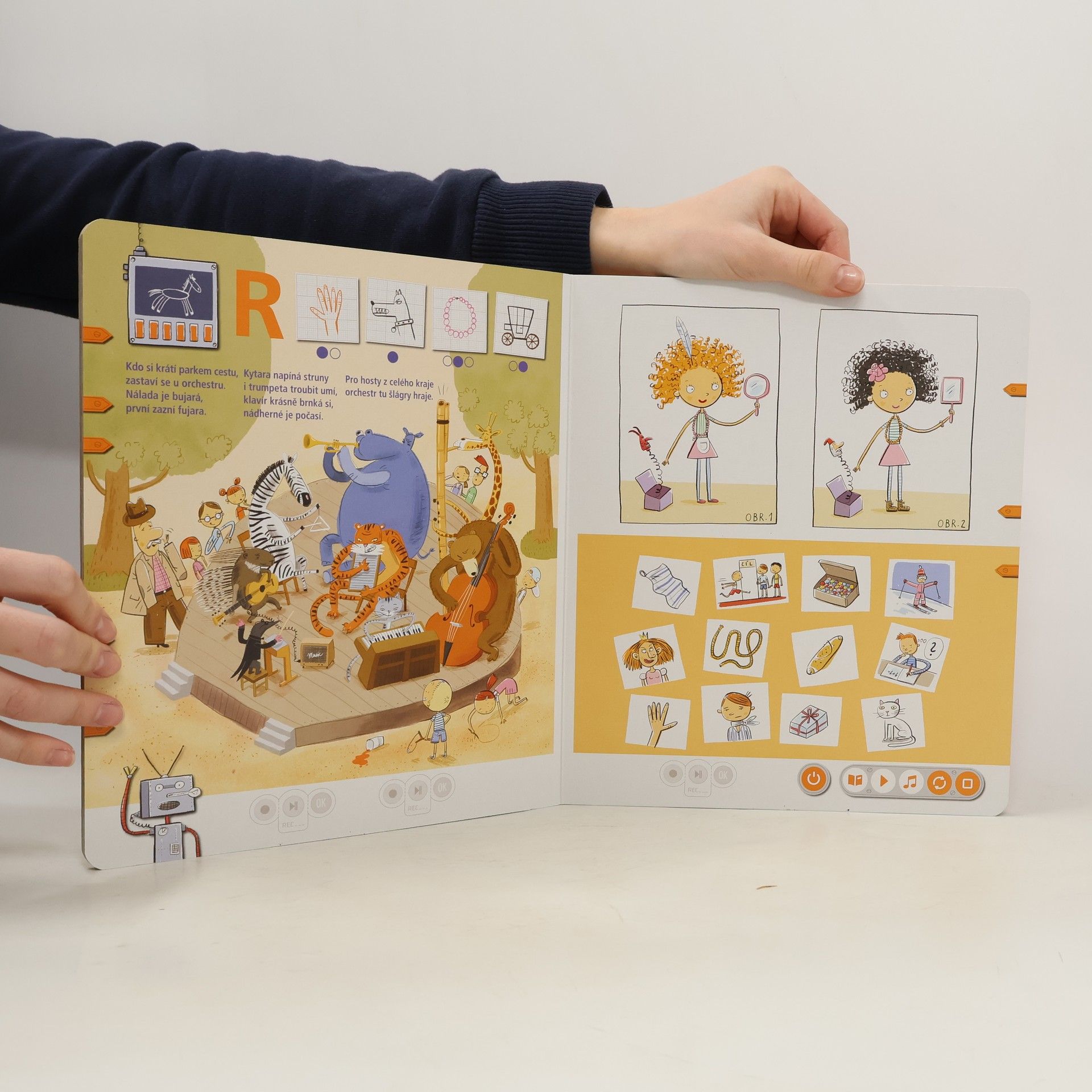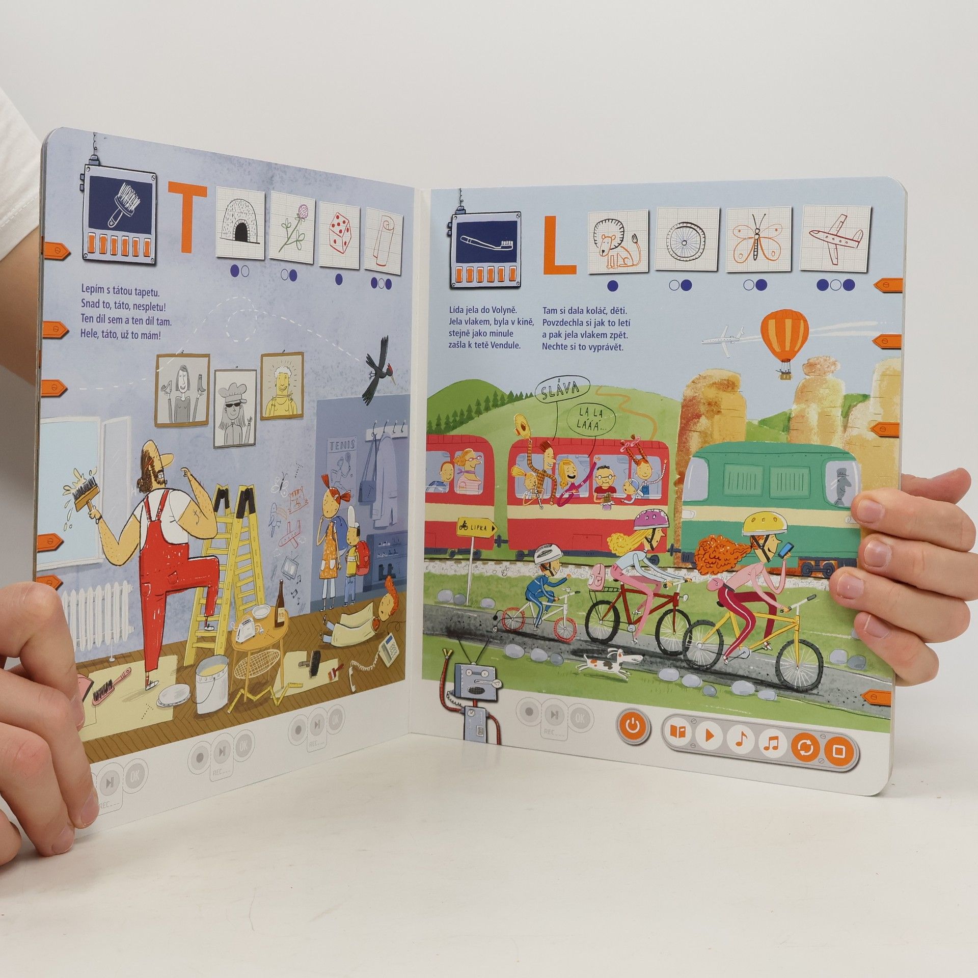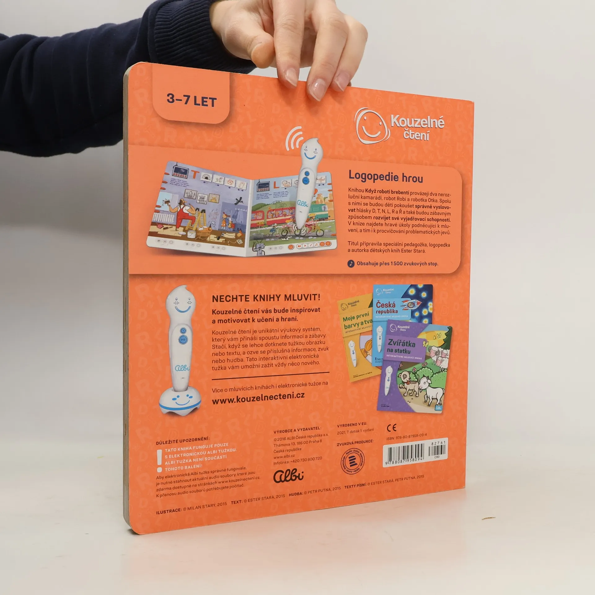 Interaktivní logopedická kniha Knihou děti provází dvě postavičky, robot Robi a robotka Otka, které jim s mluvením pomáhají. Spolu s nimi se děti pokouší správně vyslovovat hlásky D, T, N, L, R a Ř. Kniha obsahuje hravé úkoly podněcující děti k mluvení, a tím i k procvičování problematických jevů. Nechybí ani básničky, písničky a napínavé komiksy. Součástí knihy jsou i kouzelné samolepky, s nimiž si děti mohou svoji výslovnost nahrát a poslechnout. Kniha obsahuje přes 1500 zvuků a textů.